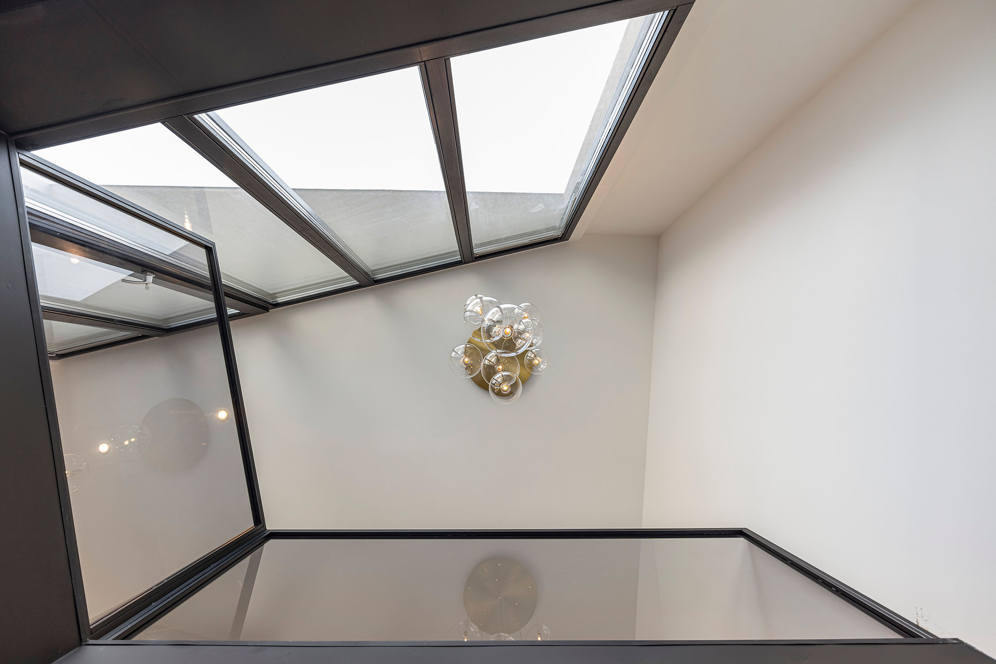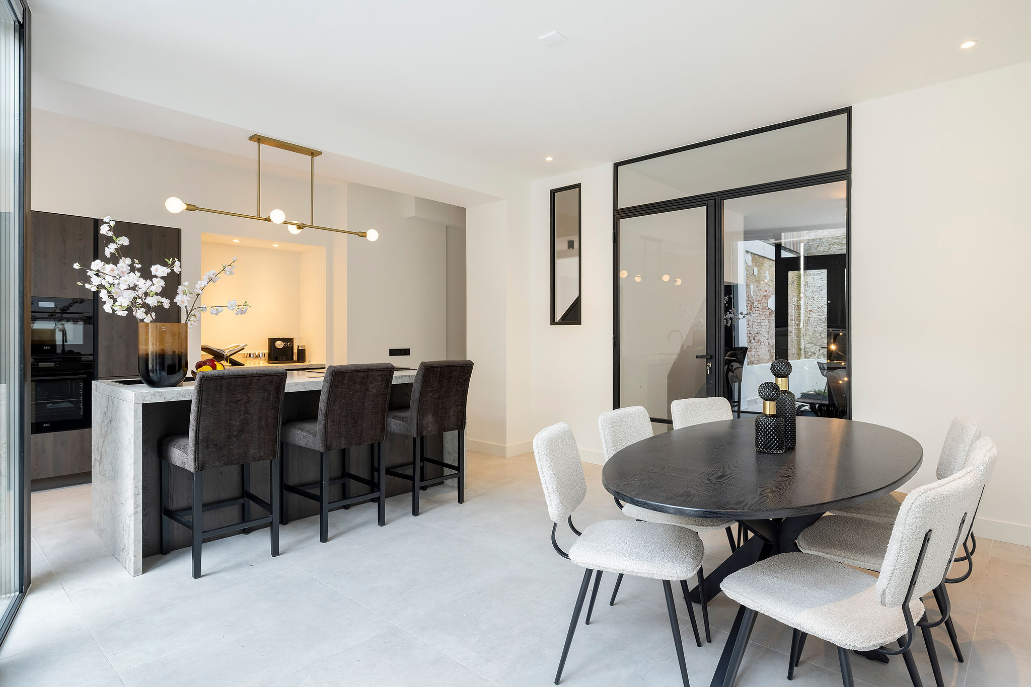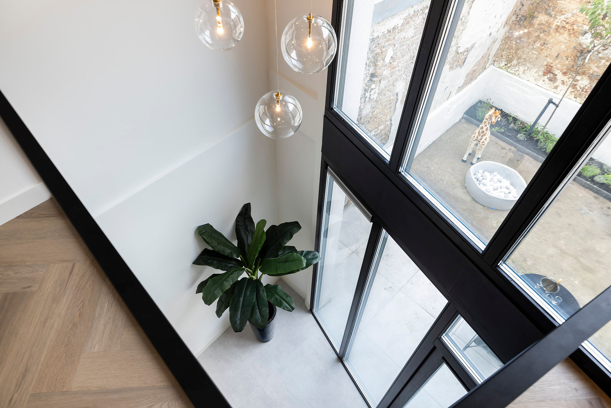 - Stoere stalen (taats)glasdeuren en - glaspui als scheiding tussen de leefkeuken en de multifunctionele ruimte;