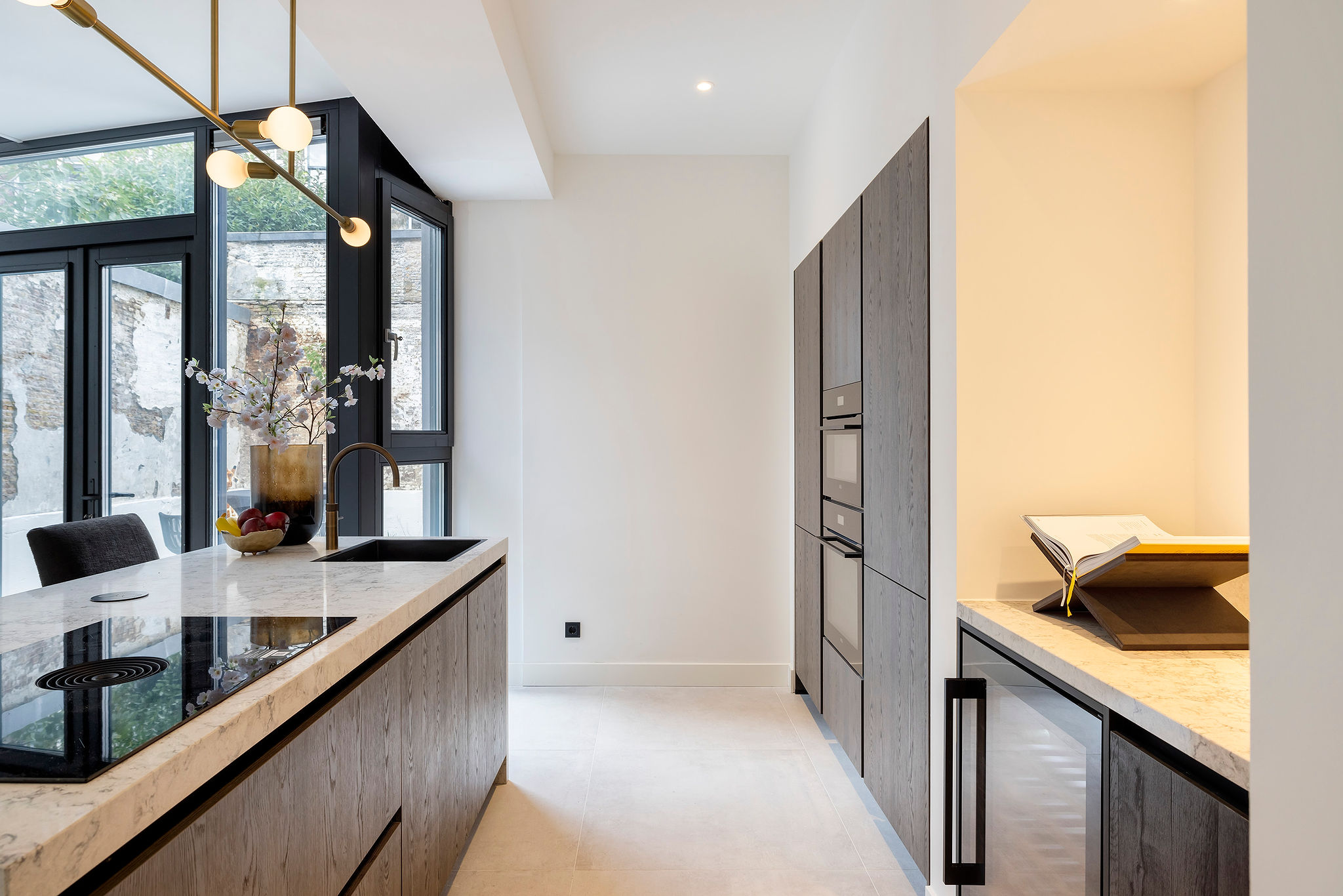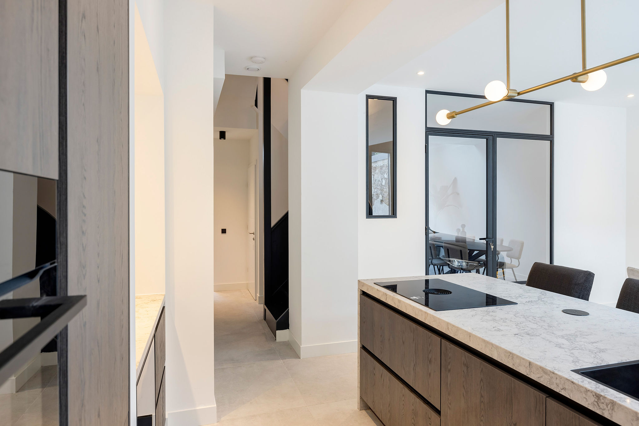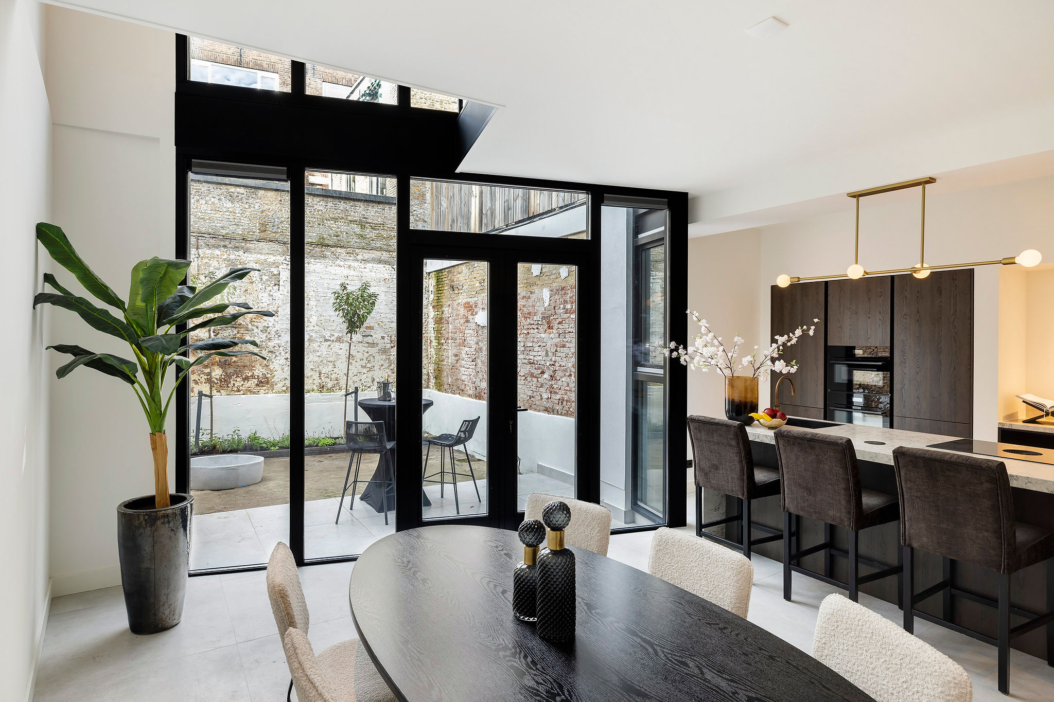 - Stoere stalen (taats)glasdeuren en - glaspui als scheiding tussen de leefkeuken en de multifunctionele ruimte;