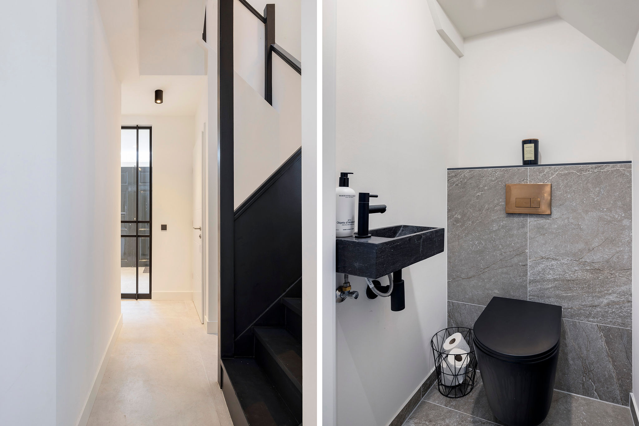 - Centrale hal/ trappenhuis met toilet, netjes weggewerkte verdeelunit vloerverwarming begane grond, bordestrap naar 1e verdieping, deur naar de leefkeuken;
