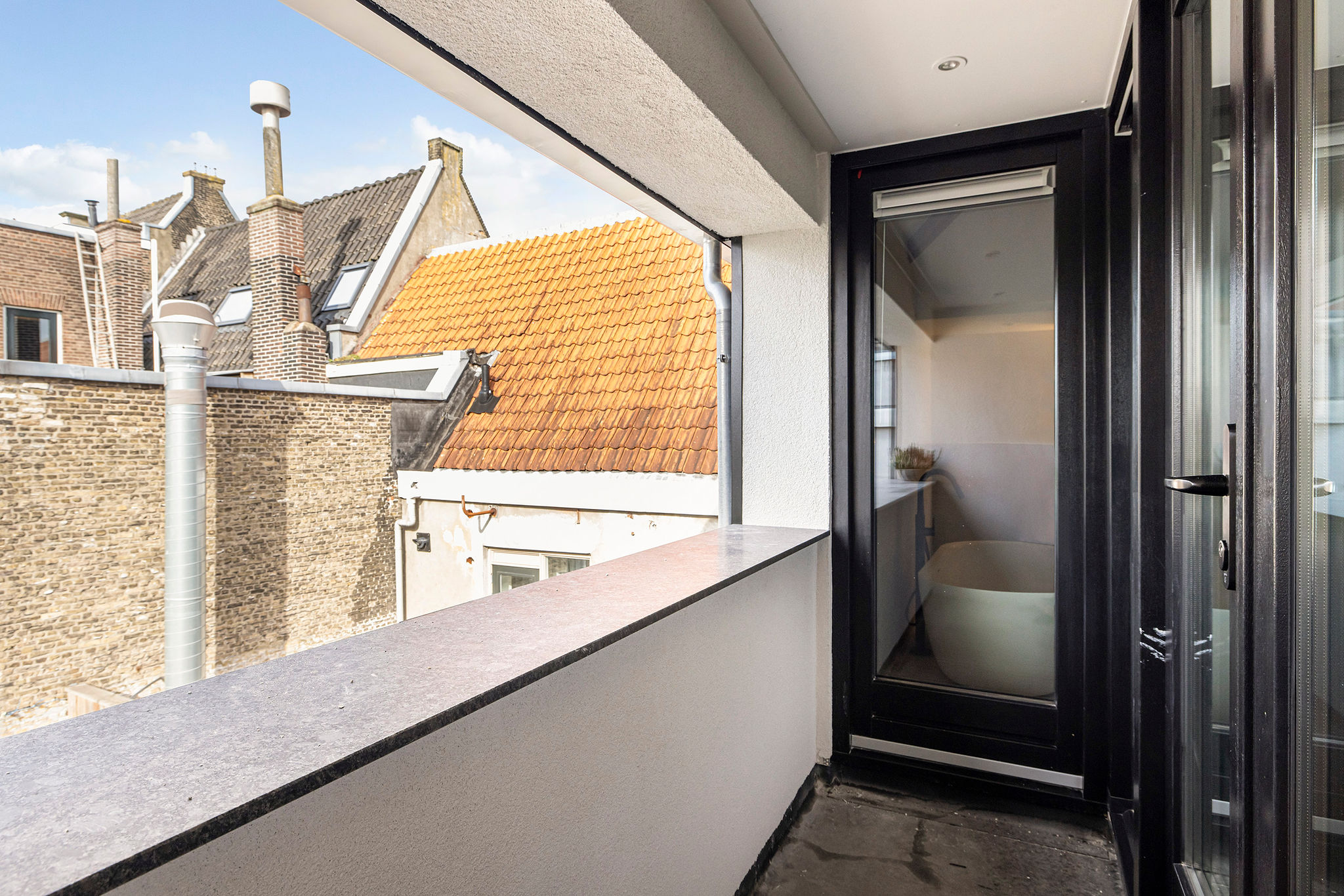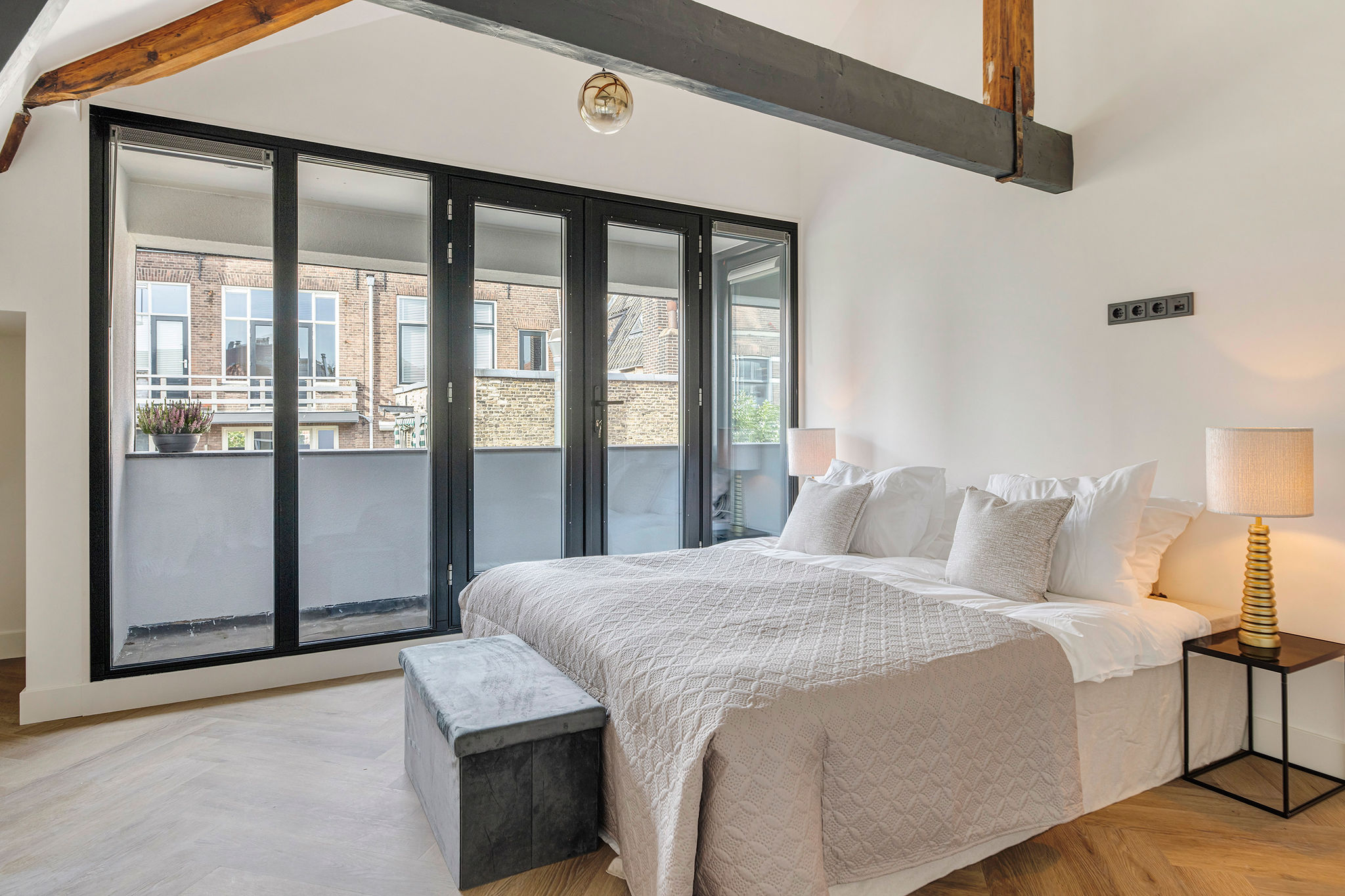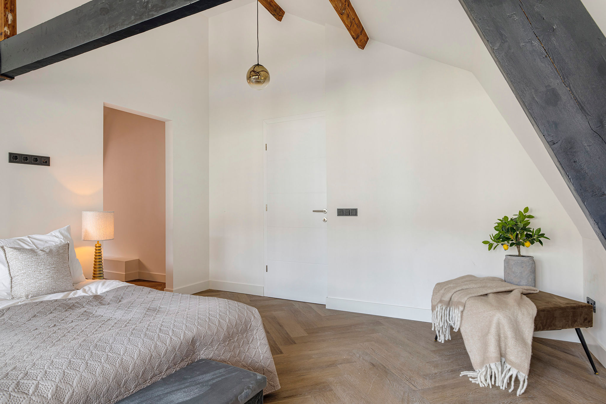 - Sfeervolle slaapkamer 1, gelegen aan de achterzijde met houten spantconstructie in het zicht, een loggia/ inpandig balkon met naar binnen draaiende deuren, doorloop naar een royale walk-in closet;