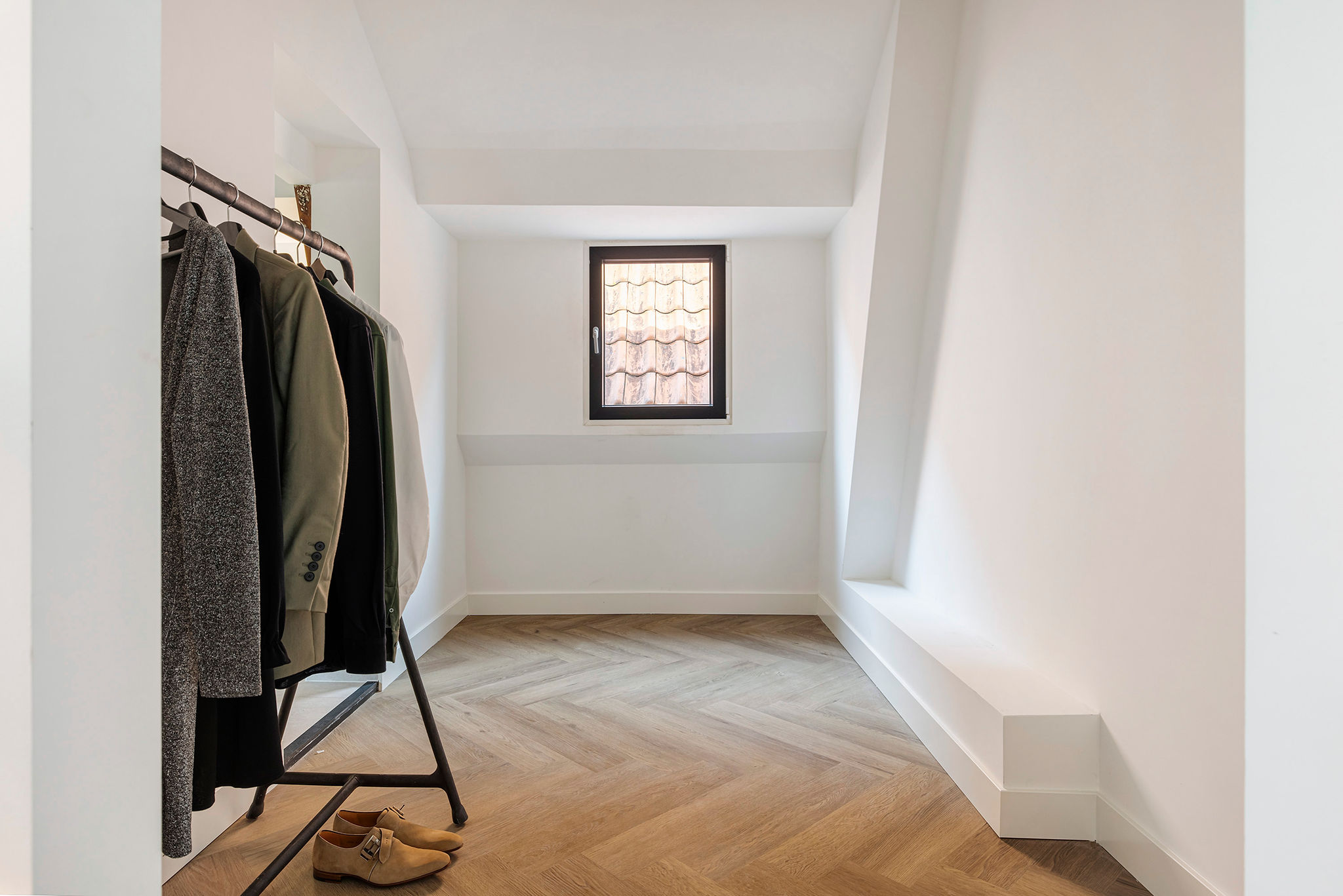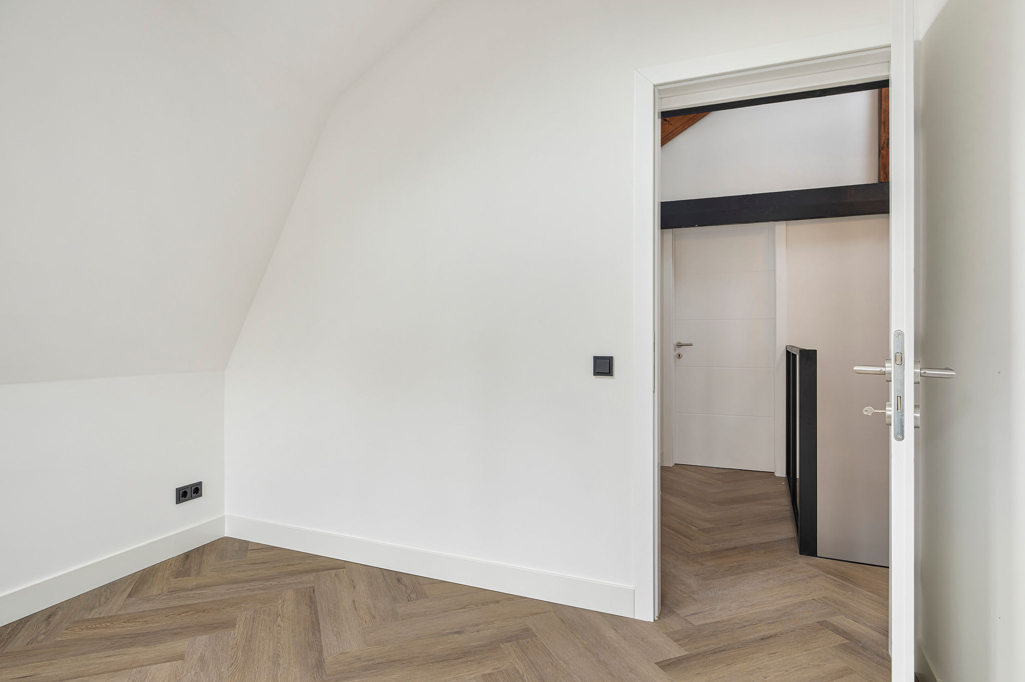 - Eerste verdieping: glad gestucte en gesausde wanden. Pvc visgraat vloerafwerking.