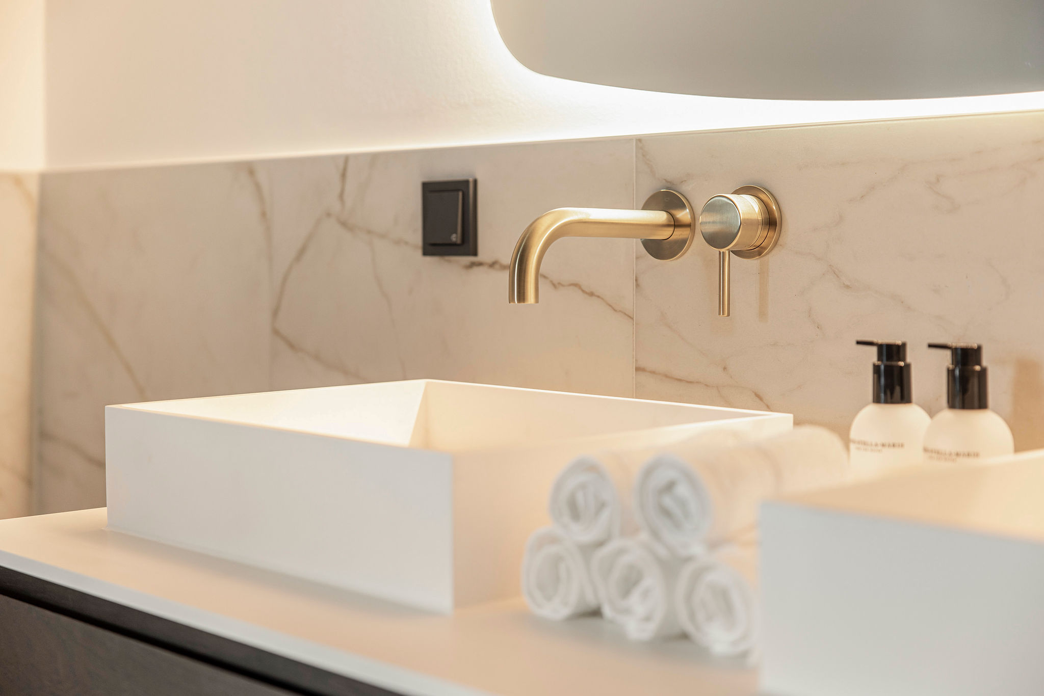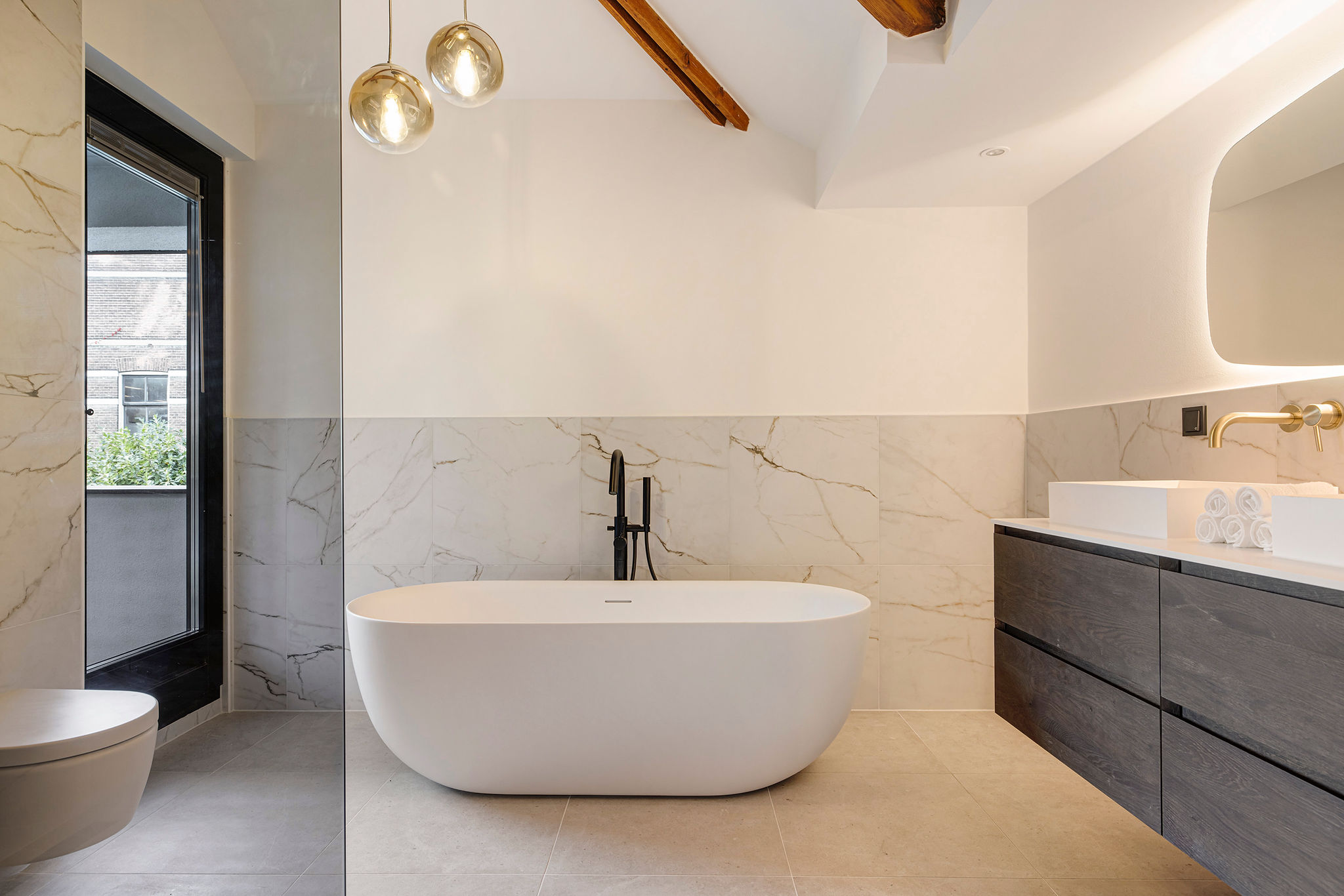 - Moderne/ luxe badkamer 1, gelegen aan de achterzijde met houten spantconstructie in het zicht, gedeeltelijk betegelde wanden, een luxe tegelvloer, vloer, wit sanitair, een wastafelmeubel met 2 chique goudkleurige kranen en een spiegelcombinatie, romantisch vrijstaand ovaal bad met kraancombinatie en handdouche, een inloopdouche met hardglazen scherm, een thermostaatkraan, een drainafvoer, een stortkop en een handdouche, een hangcloset en een deur naar de loggia/ het inpandige balkon;