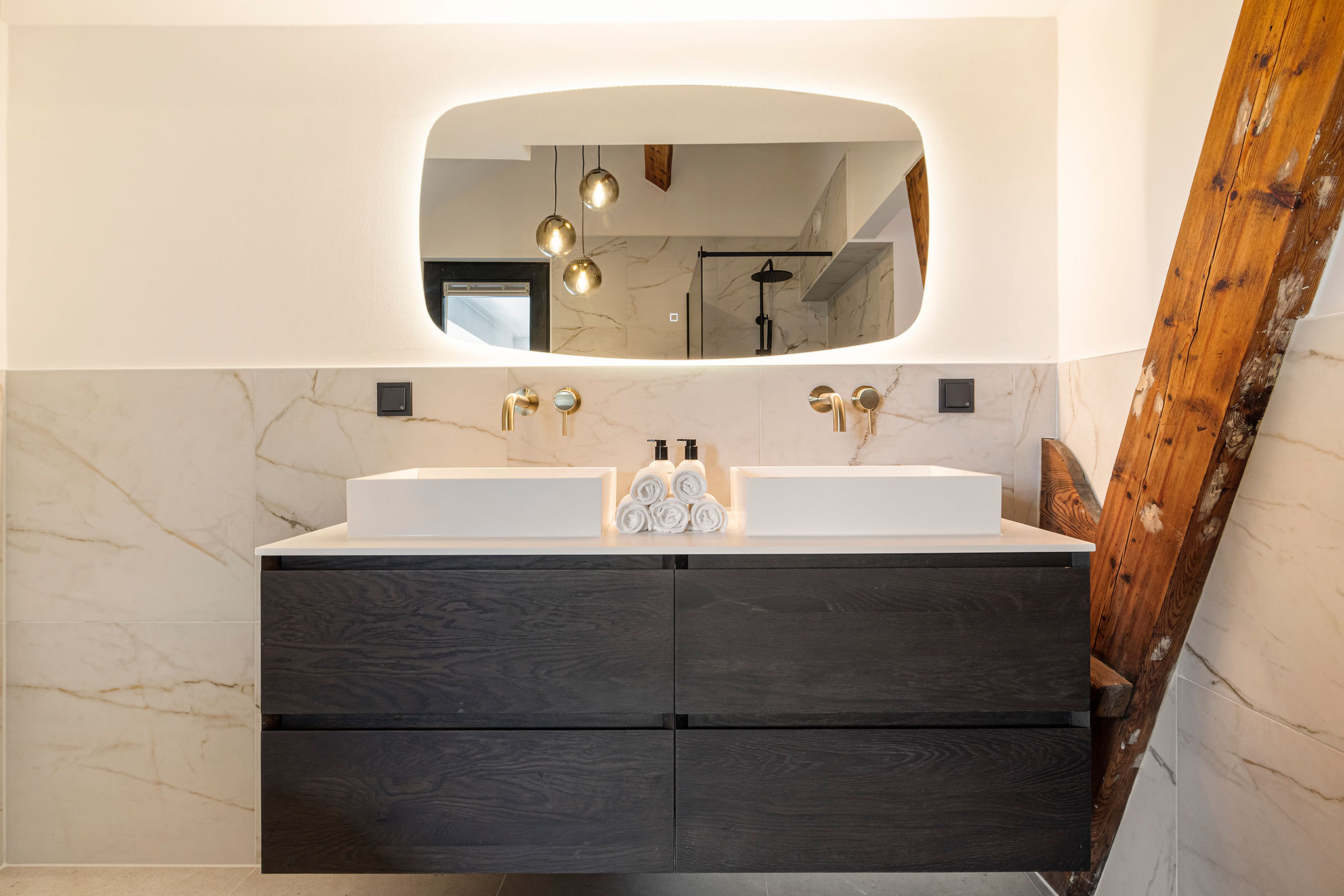 - Moderne/ luxe badkamer 2 met gedeeltelijk betegelde wanden, een luxe tegelvloer, wit sanitair, een wastafelmeubel met spiegelcombinatie, een inloopdouche met hardglazen scherm, een thermostaatkraan, een drainafvoer, een stortkop en een handdouche en een hangcloset;