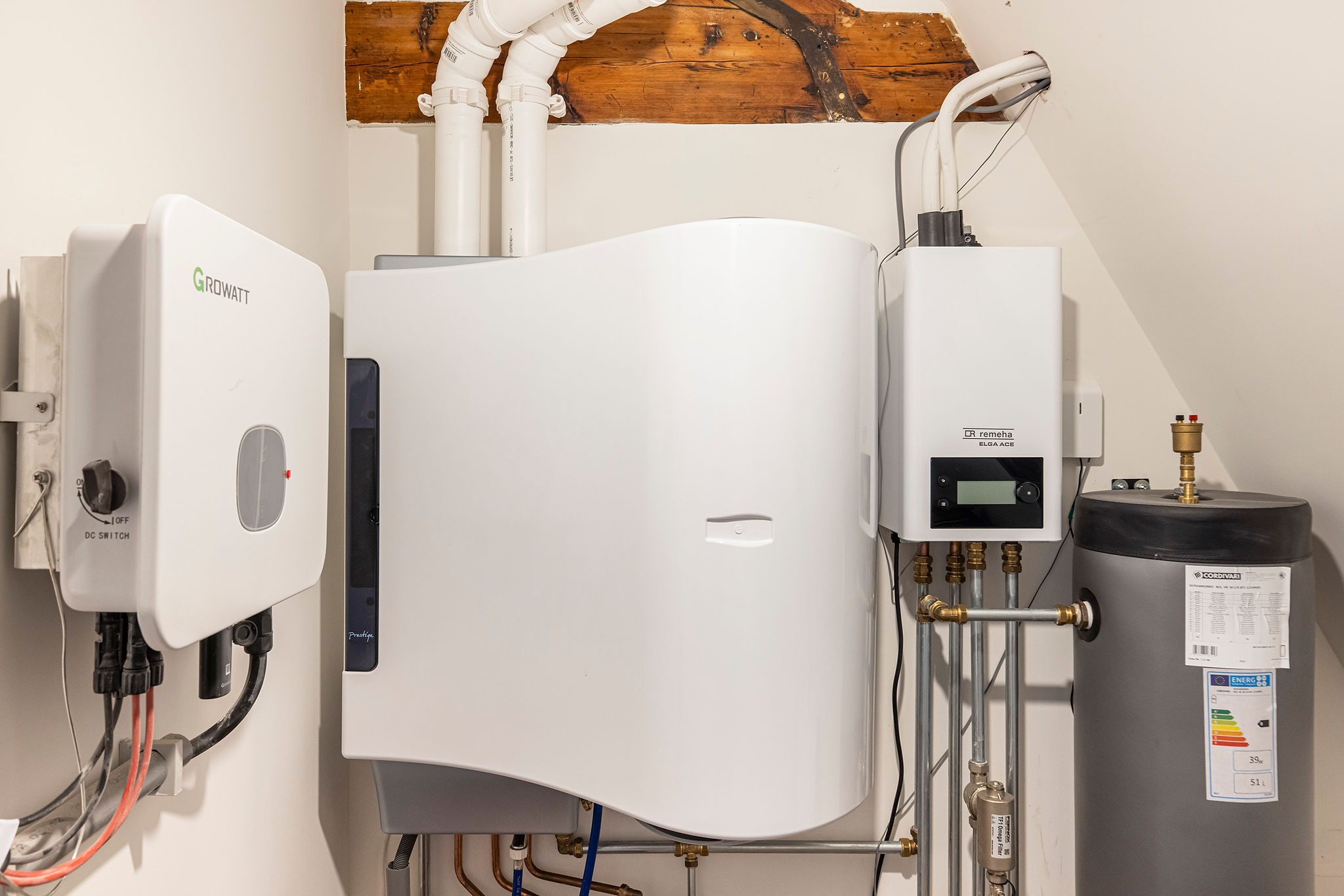 - Verwarming en warmwatervoorziening via een gasgestookte cv-ketel (Intergas Prestige A, CW6, HR, 2023), een 6 KW hybride warmtepomp (Remeha Elga Ace, 2023) i.c.m. een warmwater buffervat (Cordivari, 51 liter, 2023);