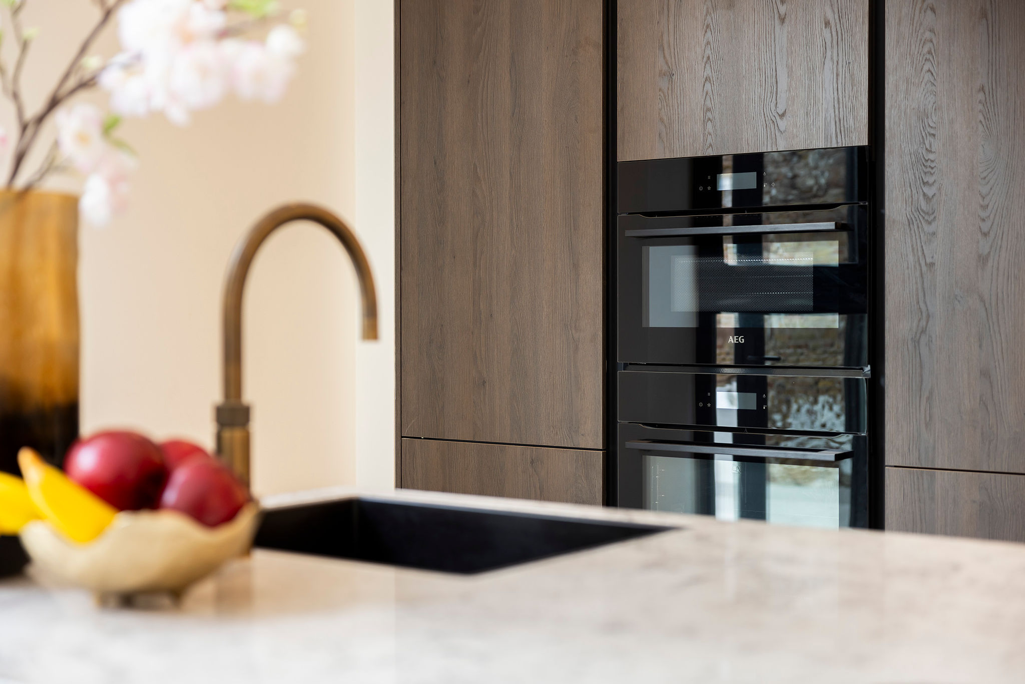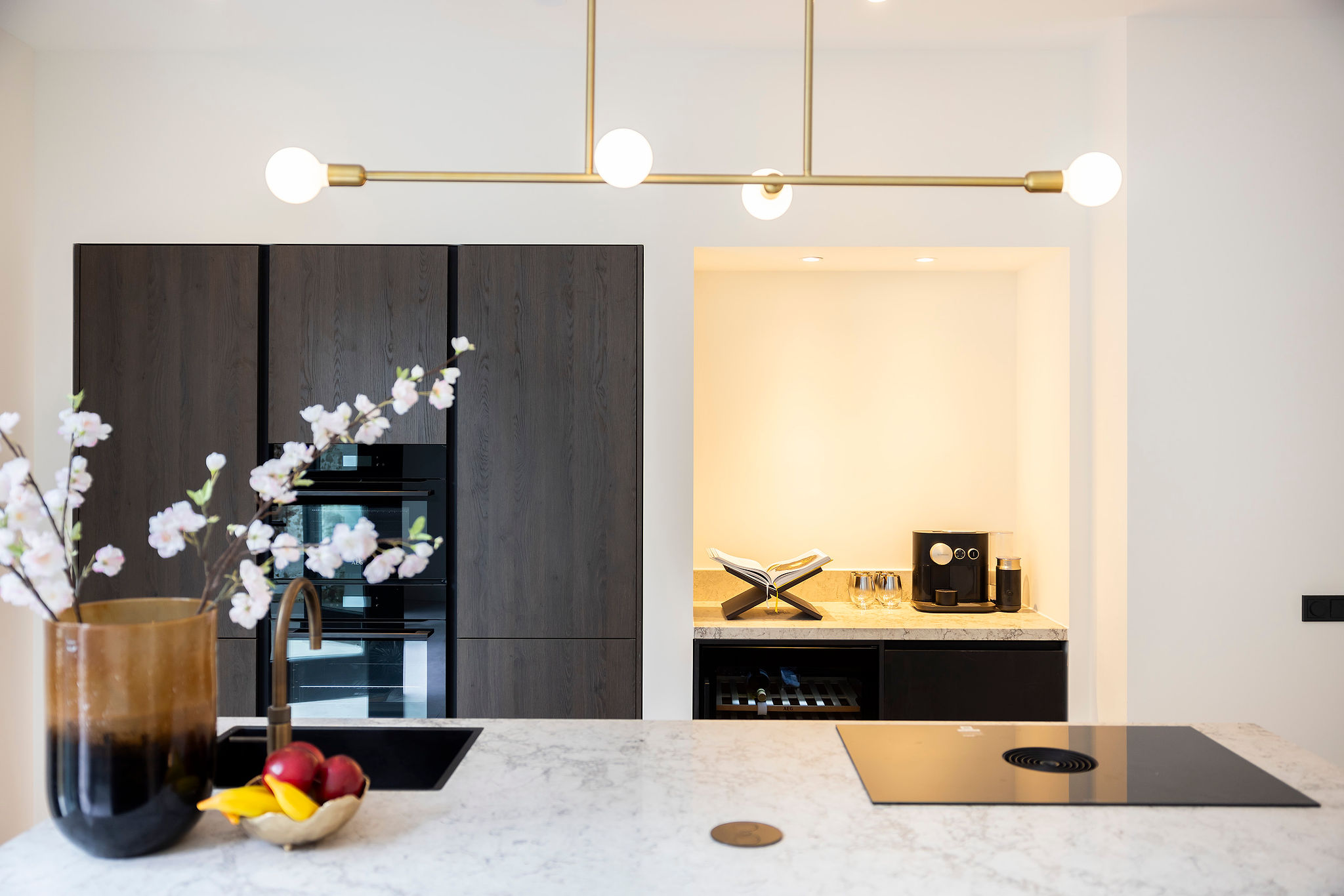 - Fantastische leefkeuken met een spectaculaire vide, openslaande tuindeuren, een hele fraaie en luxe keukeninrichting bestaande uit een spoel-/ kookeiland (tevens eetbar) en een wandopstelling. De keukeninrichting voorziet in o.a. composiet werkbladen, een enkele spoelbak, een Quooker kraan, diverse onder- en bovenkasten, laden, app. (AEG): een Bora 4-zone inductiekookplaat, een vaatwasser, een combi-oven en een hete lucht oven, een koel-/ vriescombinatie en een ‘coffee corner’ met 2 laden en een wijnklimaatkast. Stoere stalen glaspui naar de multifunctionele ruimte;