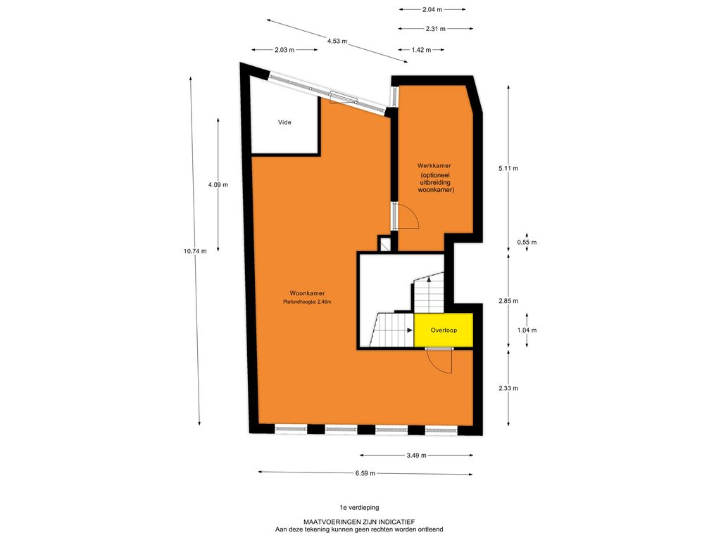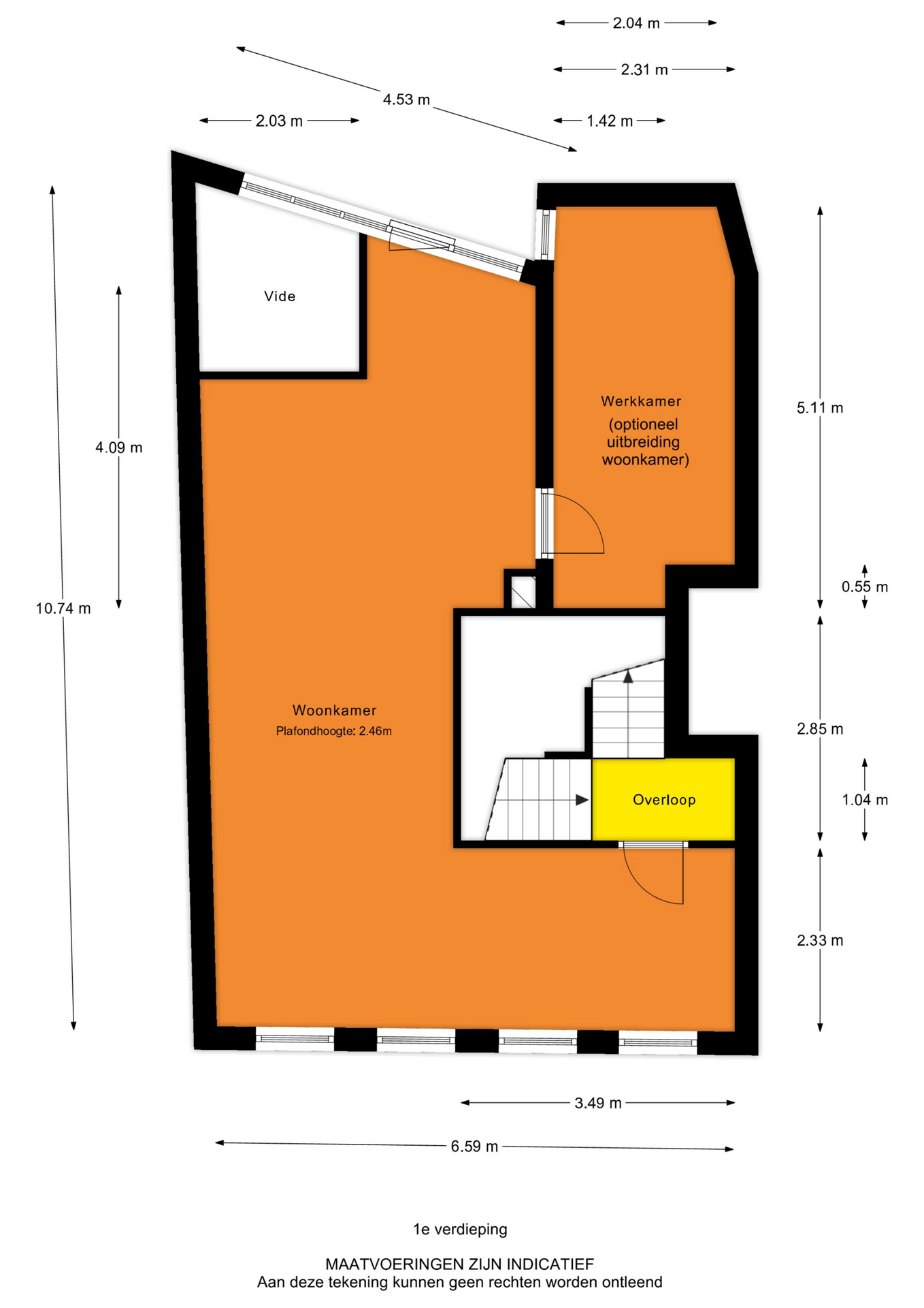 Eerste verdieping: overloop, een fijne L-vormige woonkamer met een prettige lichtinval en een praktische werkkamer (desgewenst samen te voegen).