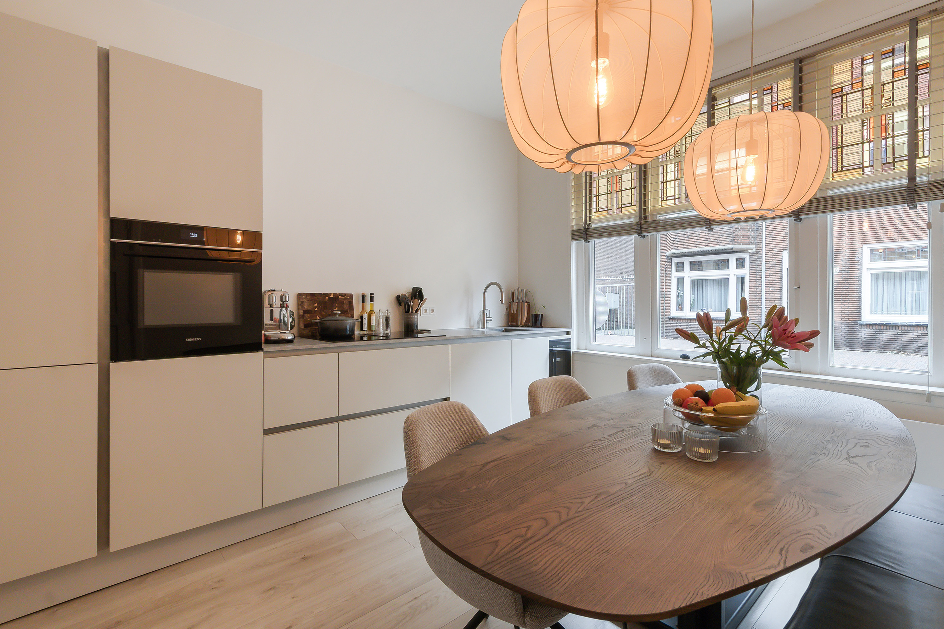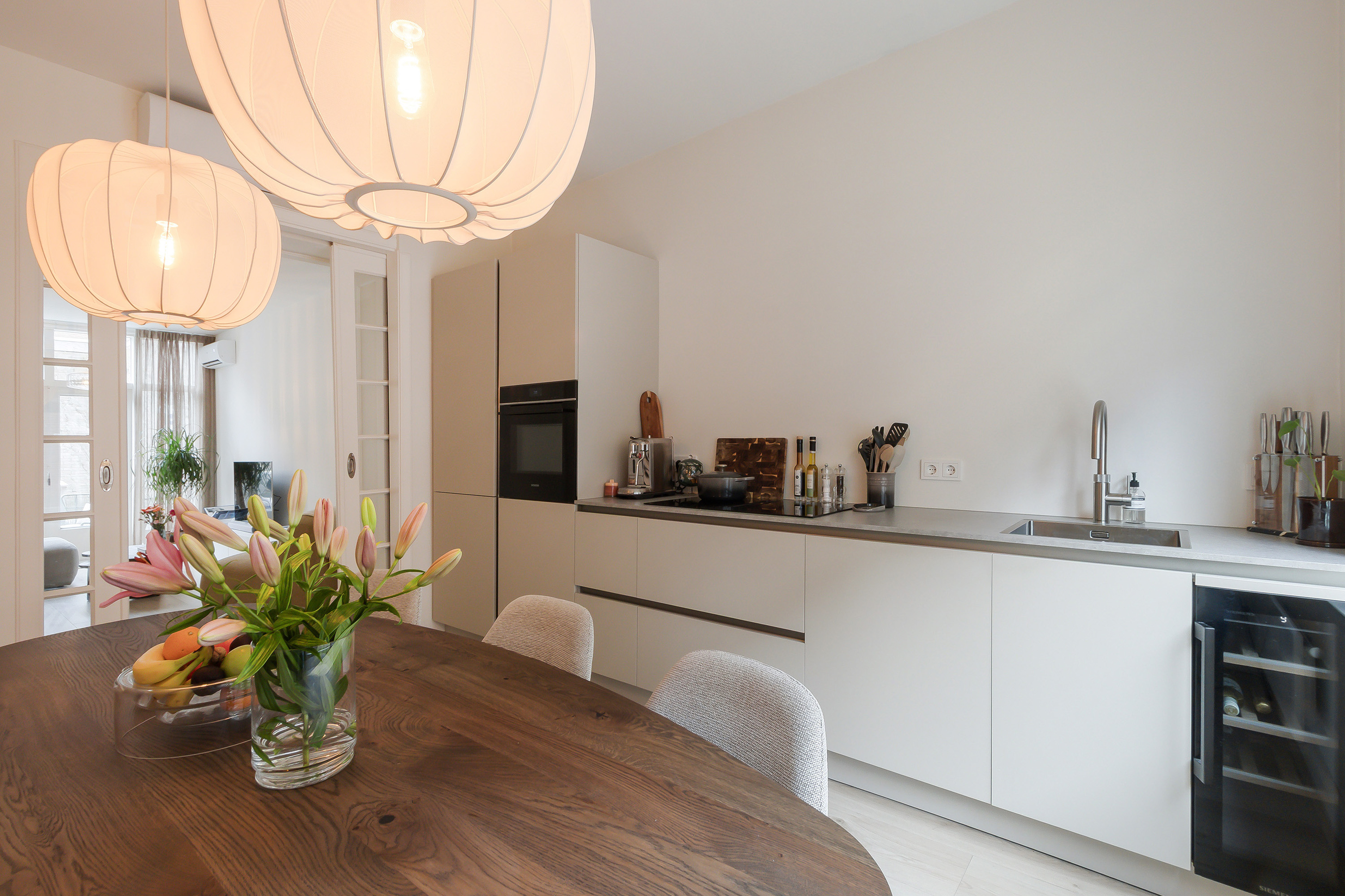 De absolute blikvanger is de prachtige woonkeuken, uitgevoerd in een stijlvolle matbeige kleur. Deze is van alle gemakken voorzien met hoogwaardige Siemens StudioLine apparatuur, waaronder een koel-vriescombinatie, vaatwasser, wijnklimaatkast en inductiekookplaat. Uiteraard ontbreekt de Quooker Flex niet.