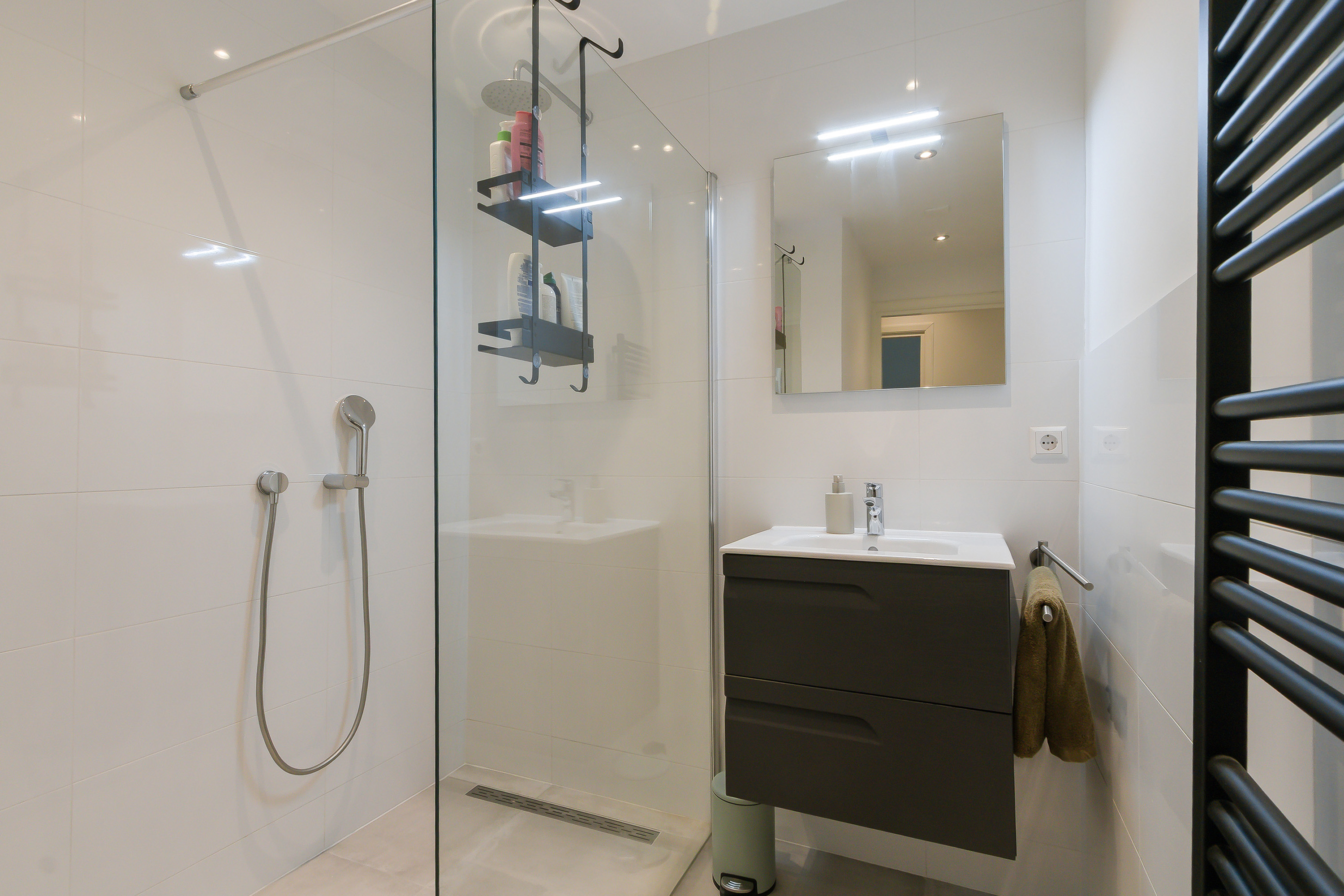 - Moderne badkamer, volledig betegeld, met inloopdouche, designradiator en wastafelmeubel;
