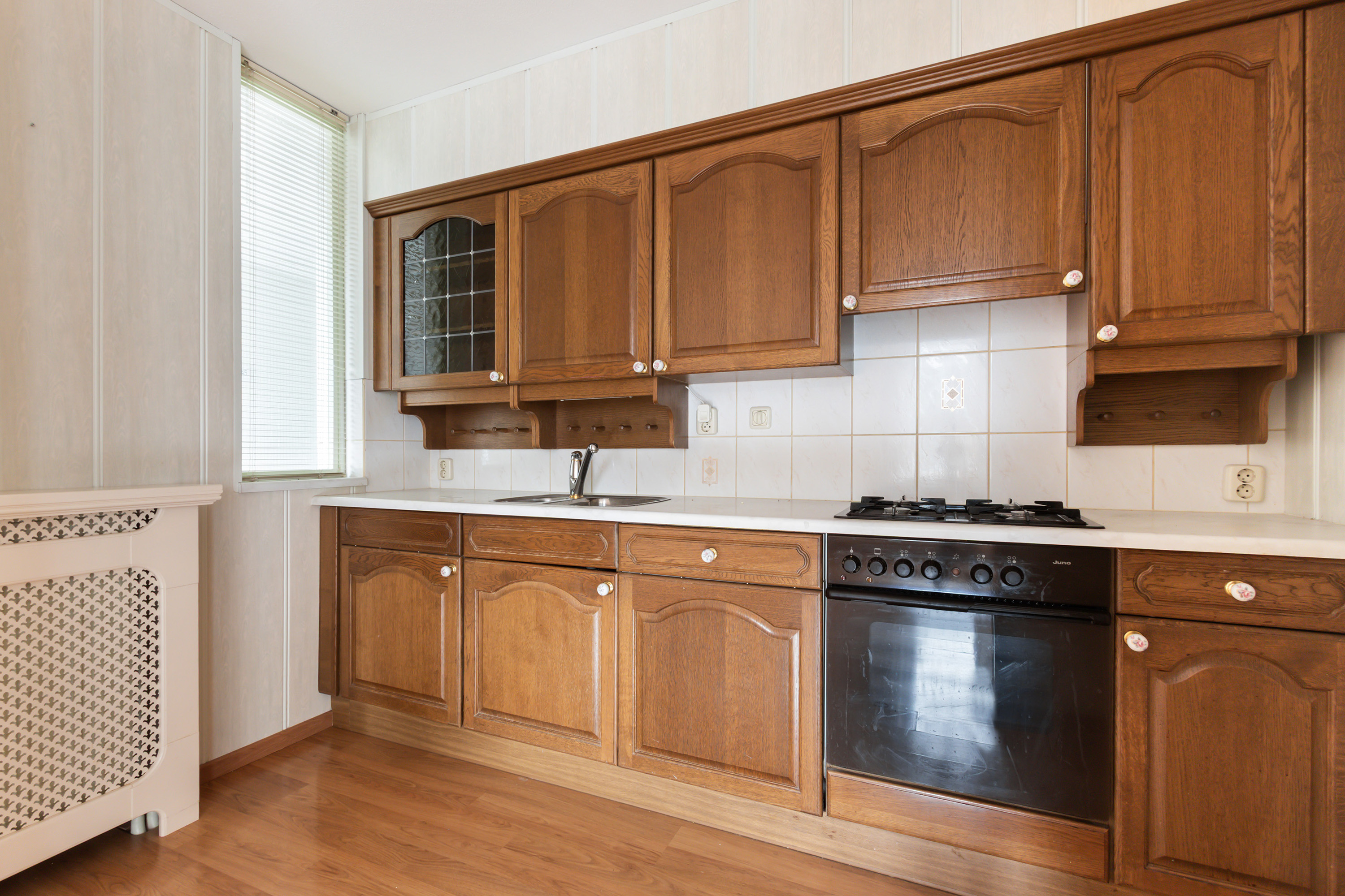 - Halfopen keuken (verouderd), uitgevoerd in een rechte wandopstelling met diverse onder- en bovenkasten, een 1,5 rvs spoelbak en een betegelde achterwand. app.: afzuigkap, 4-pits gasfornuis, oven, een vaatwasser en een onderbouw koelkast.
