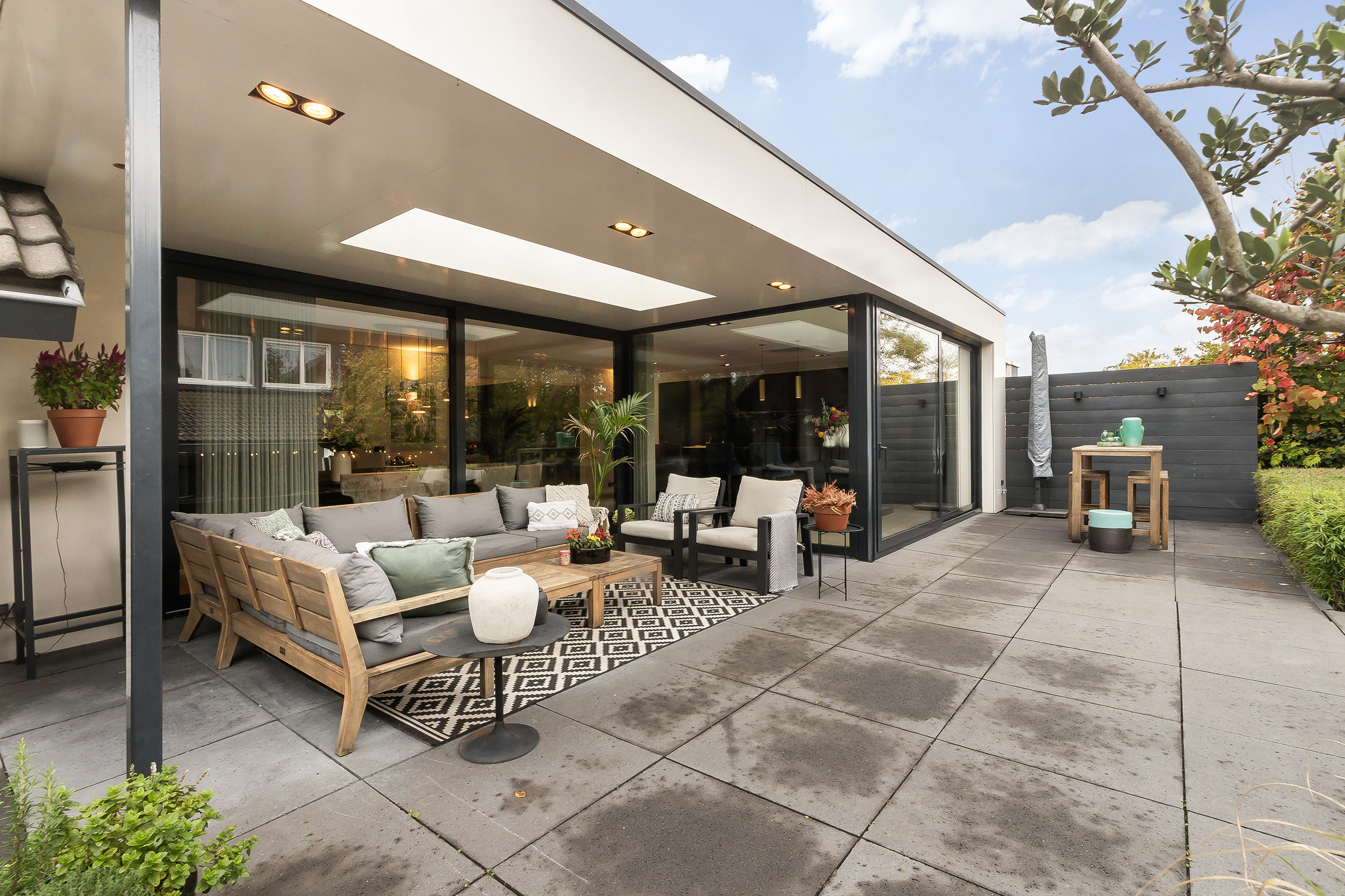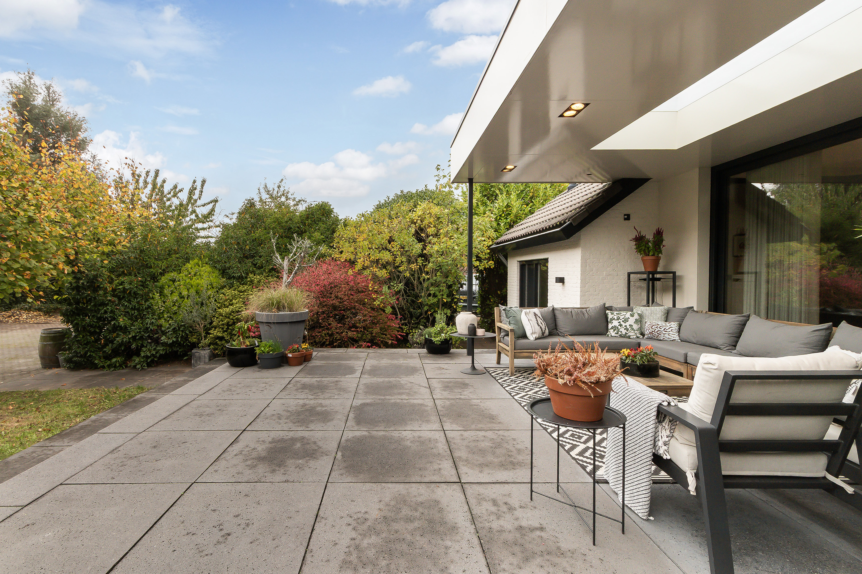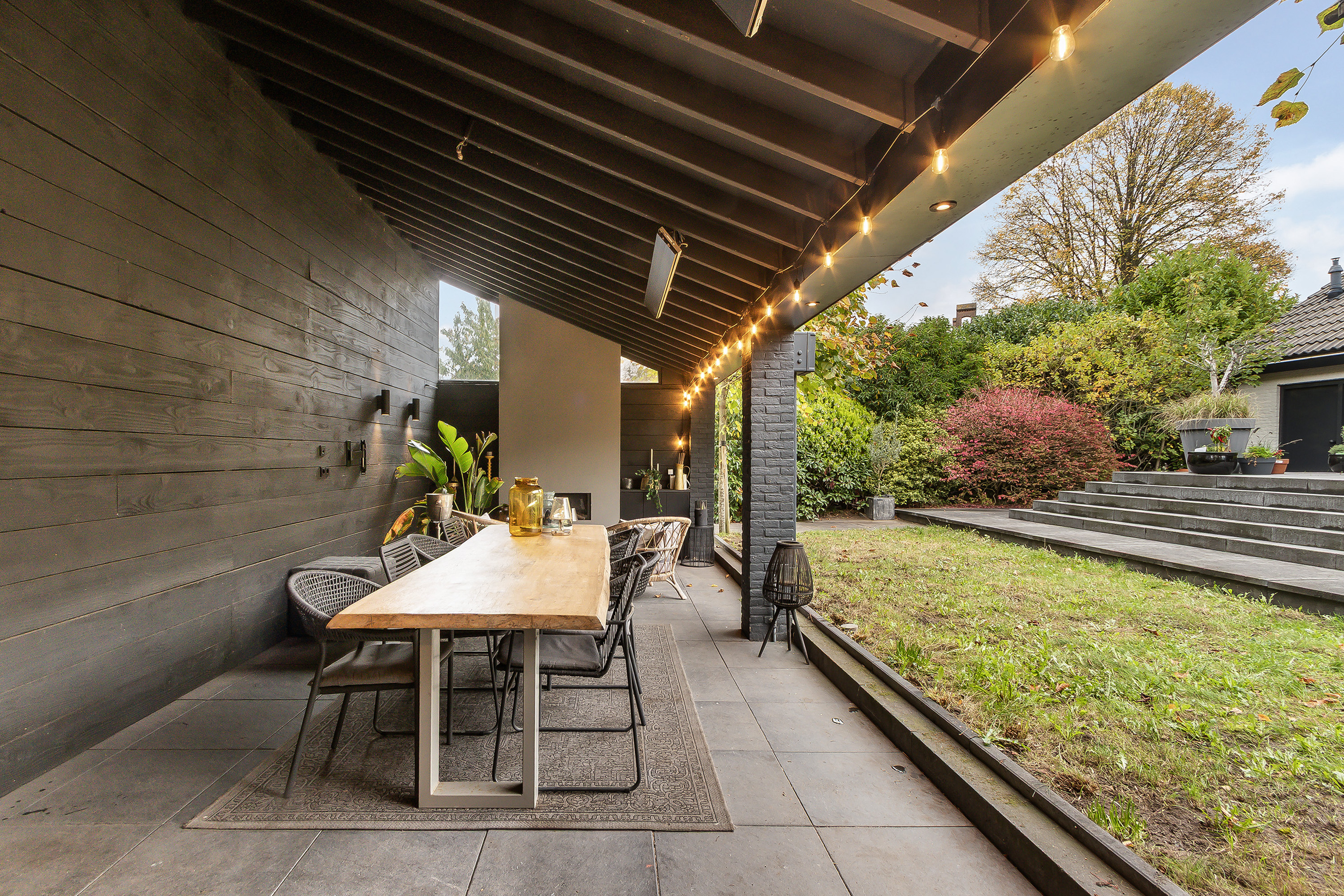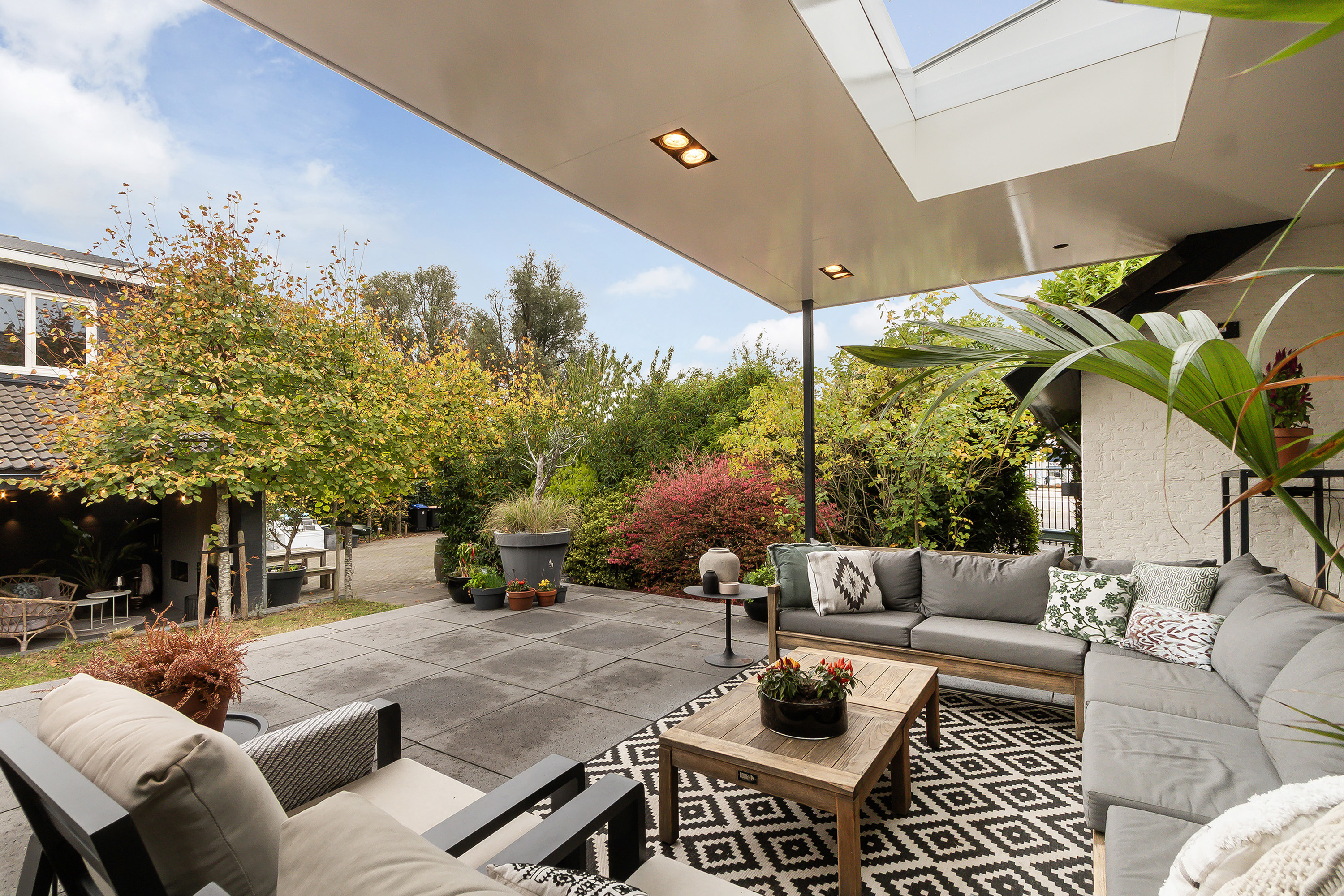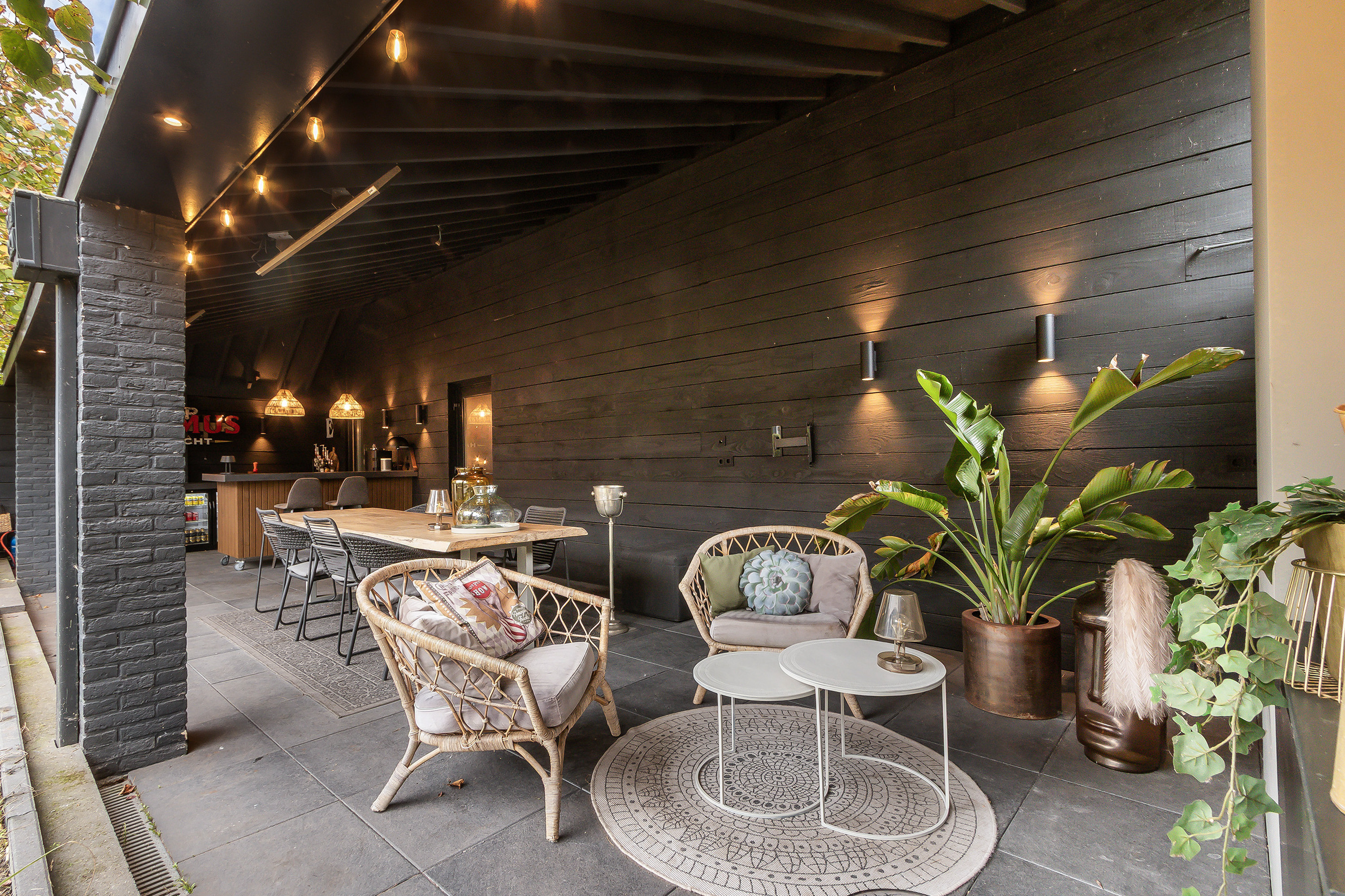 - Stoere grote lounge-overkapping voor het bijgebouw, georiënteerd op het oosten;