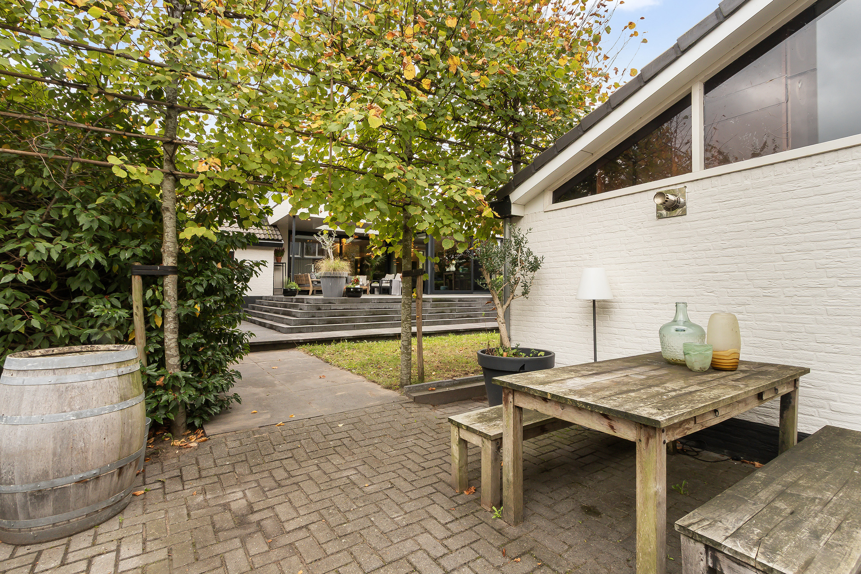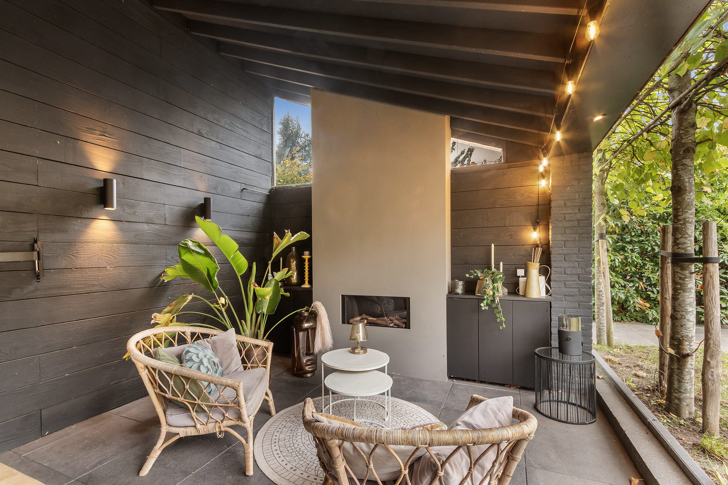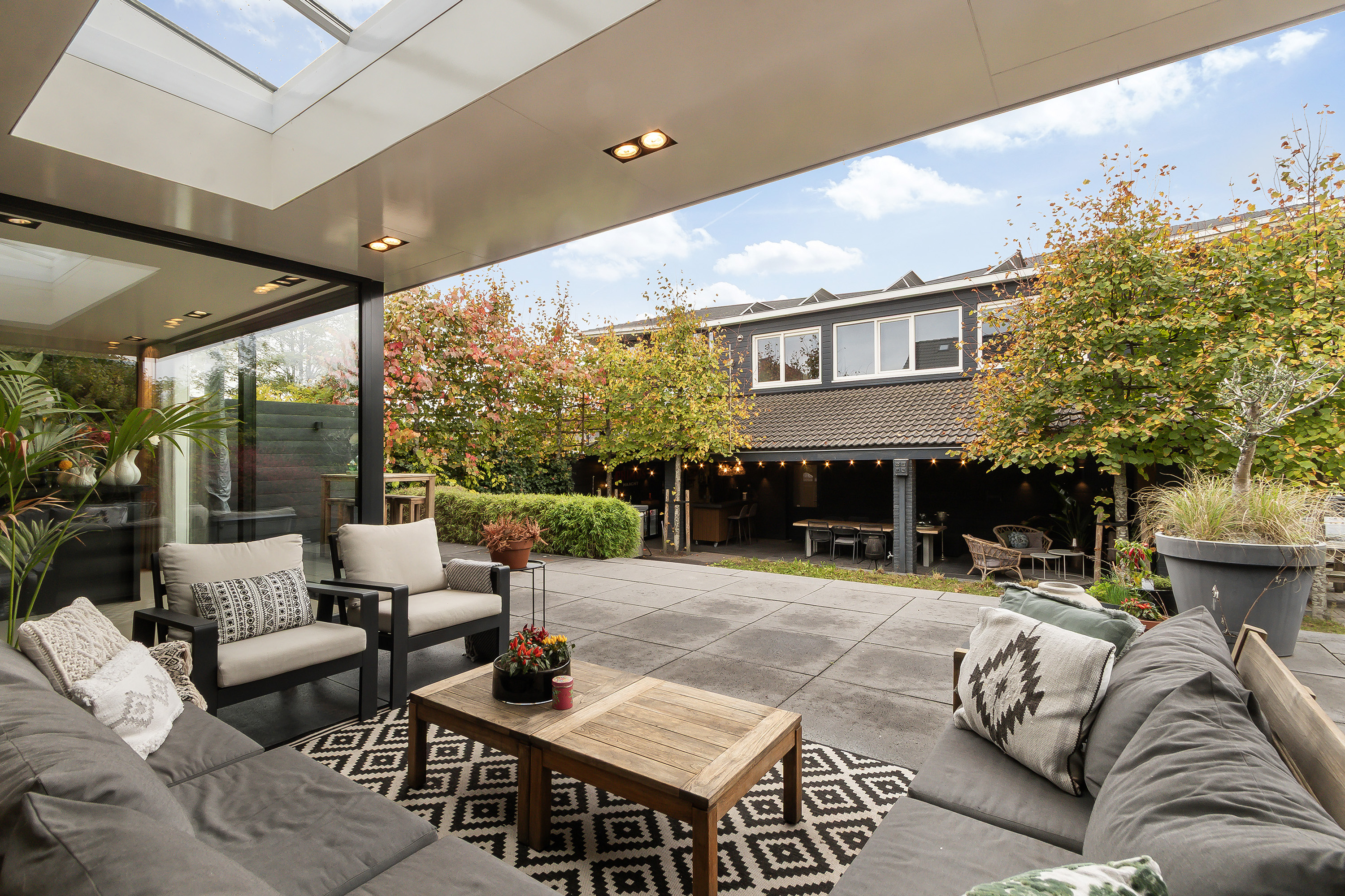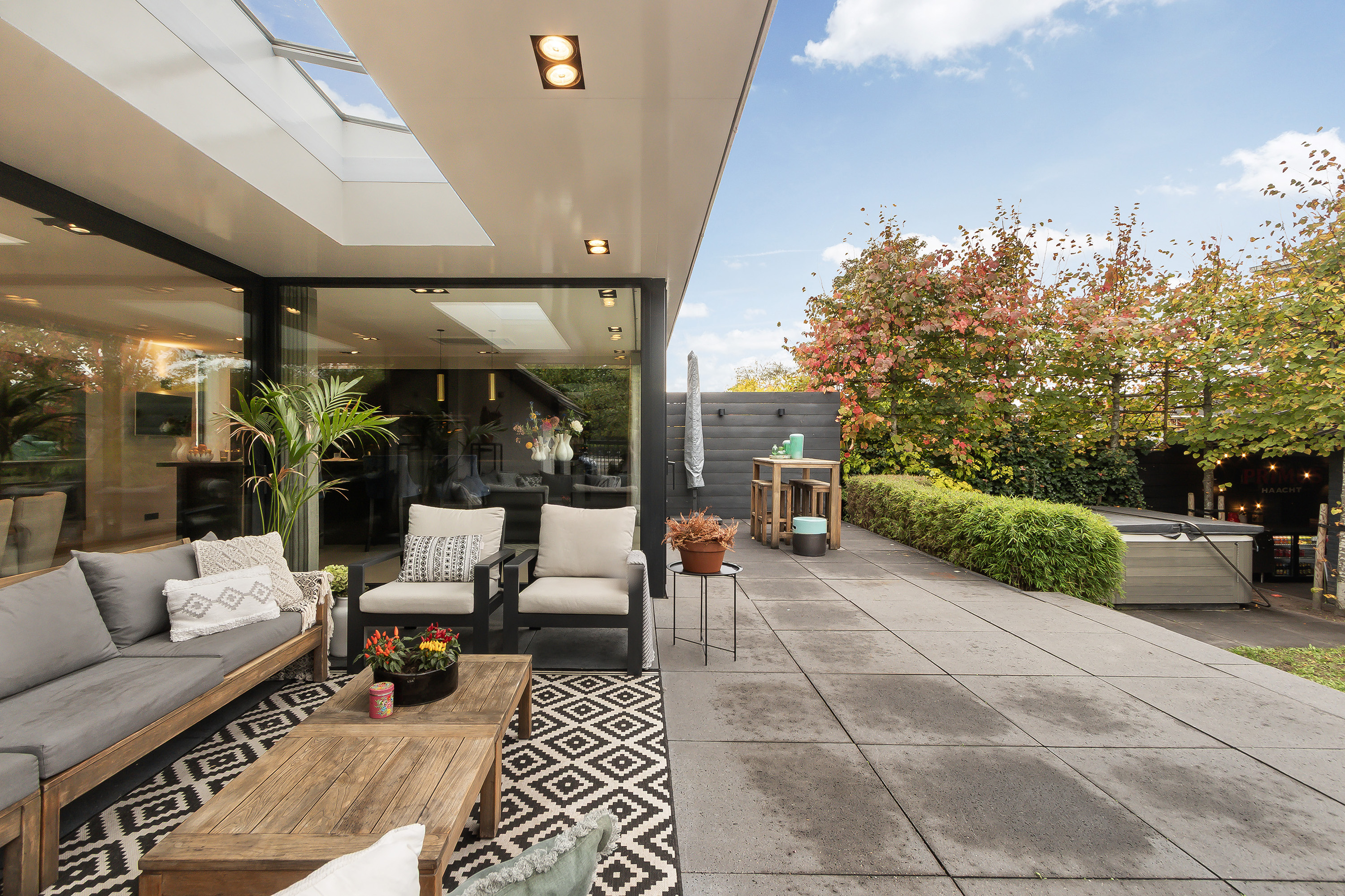 - Stoere grote lounge-overkapping voor het bijgebouw, georiënteerd op het oosten;