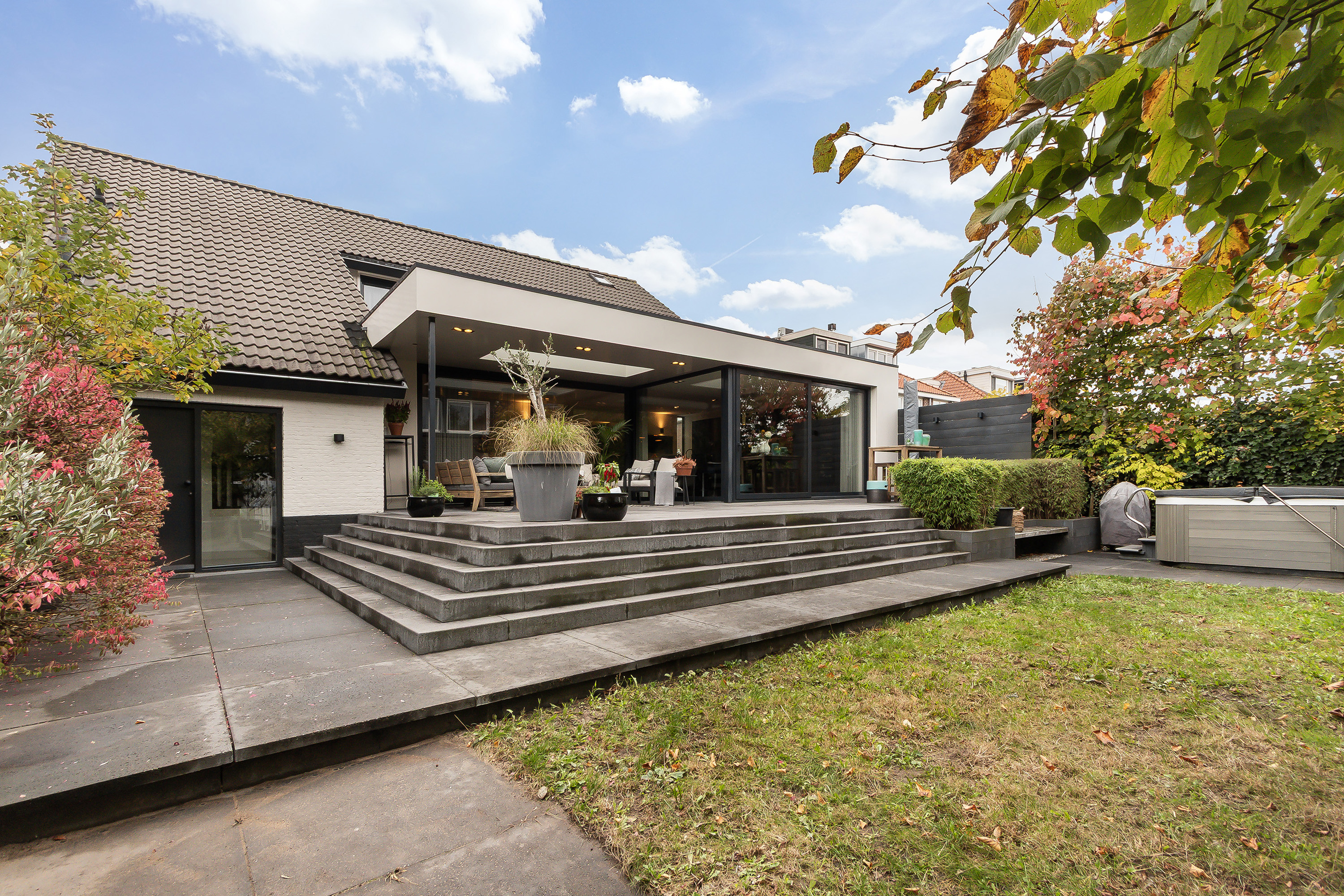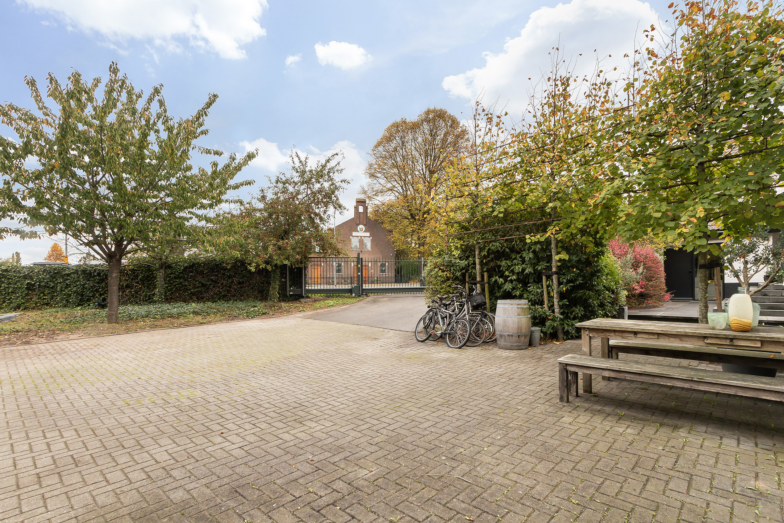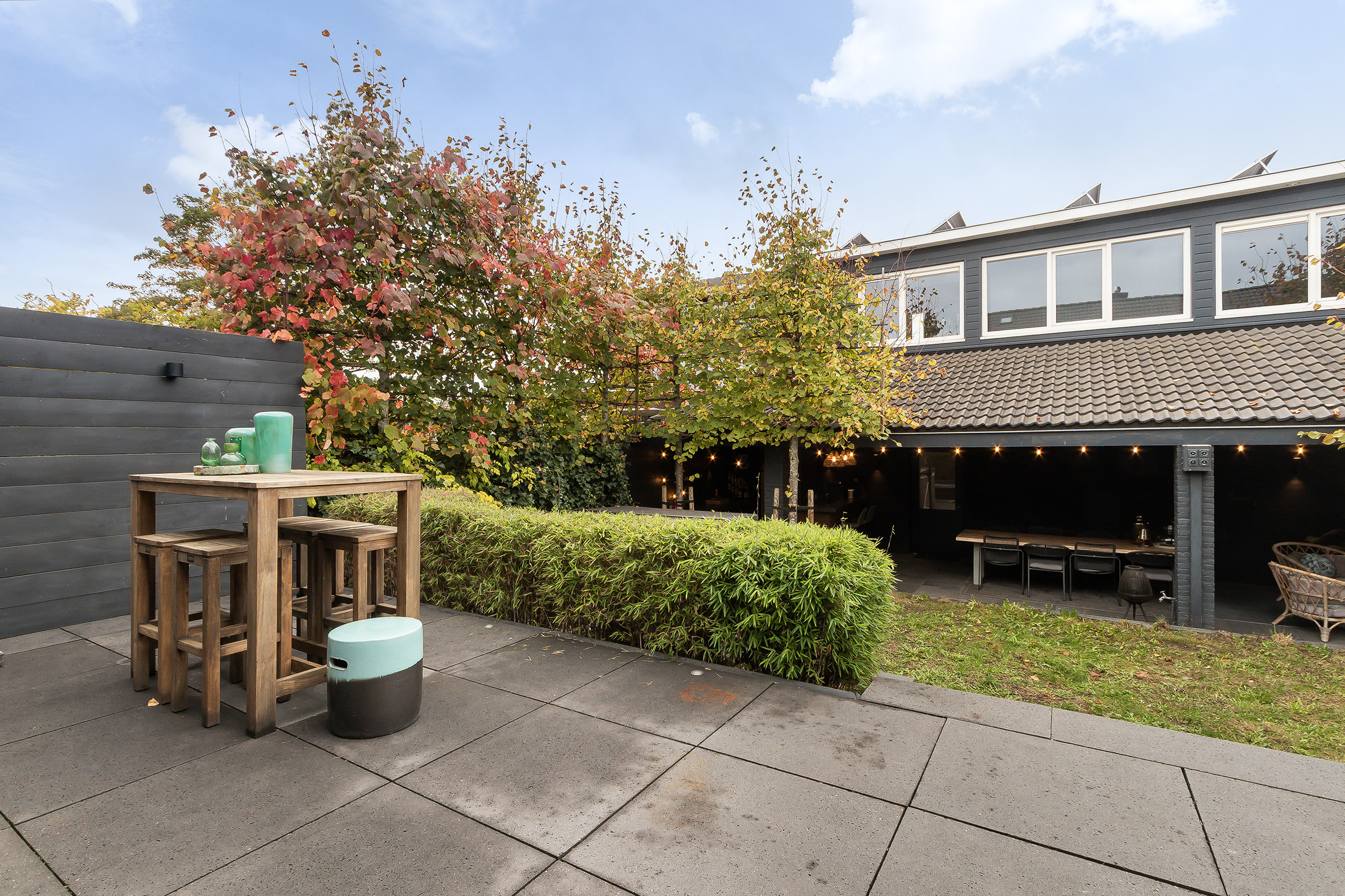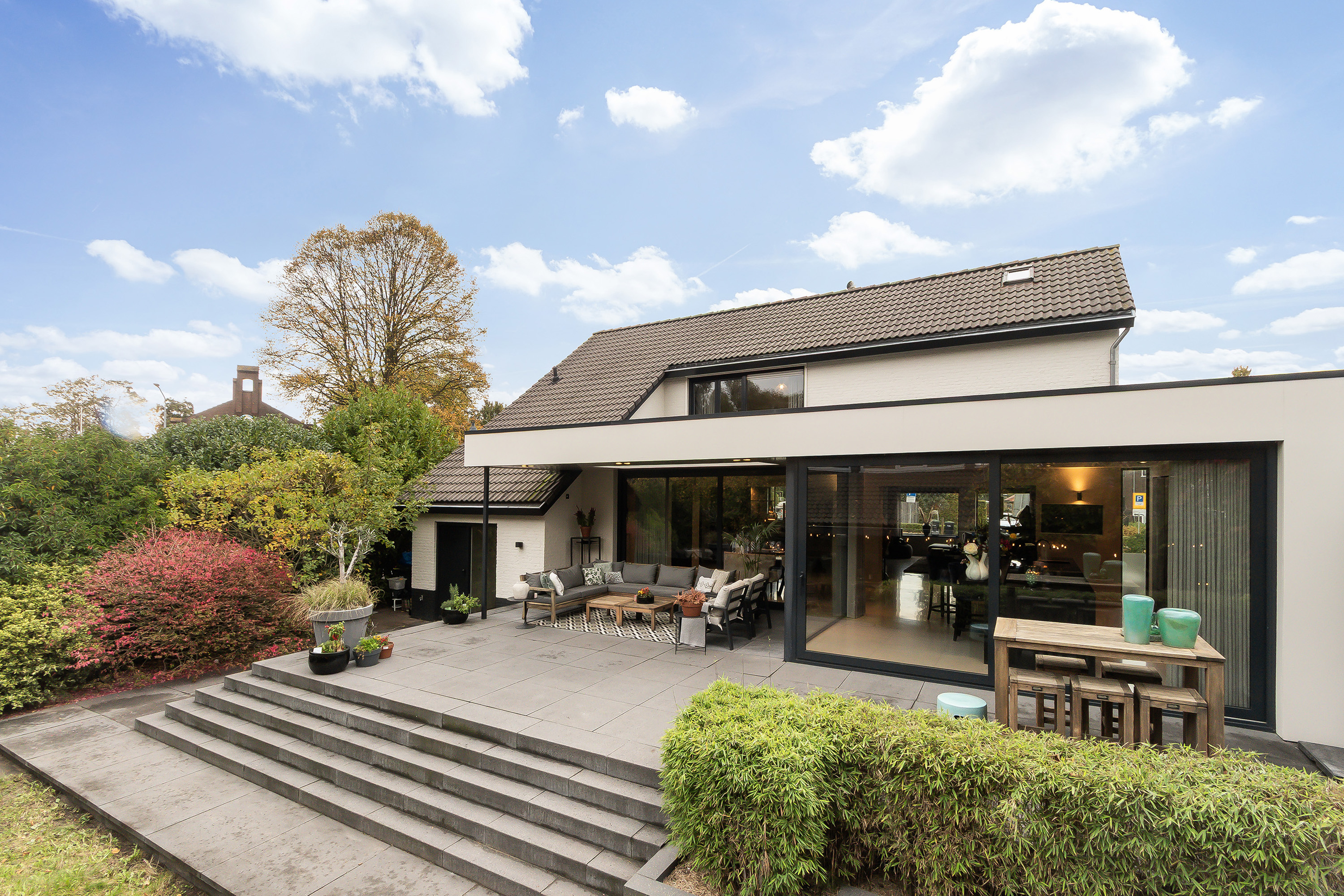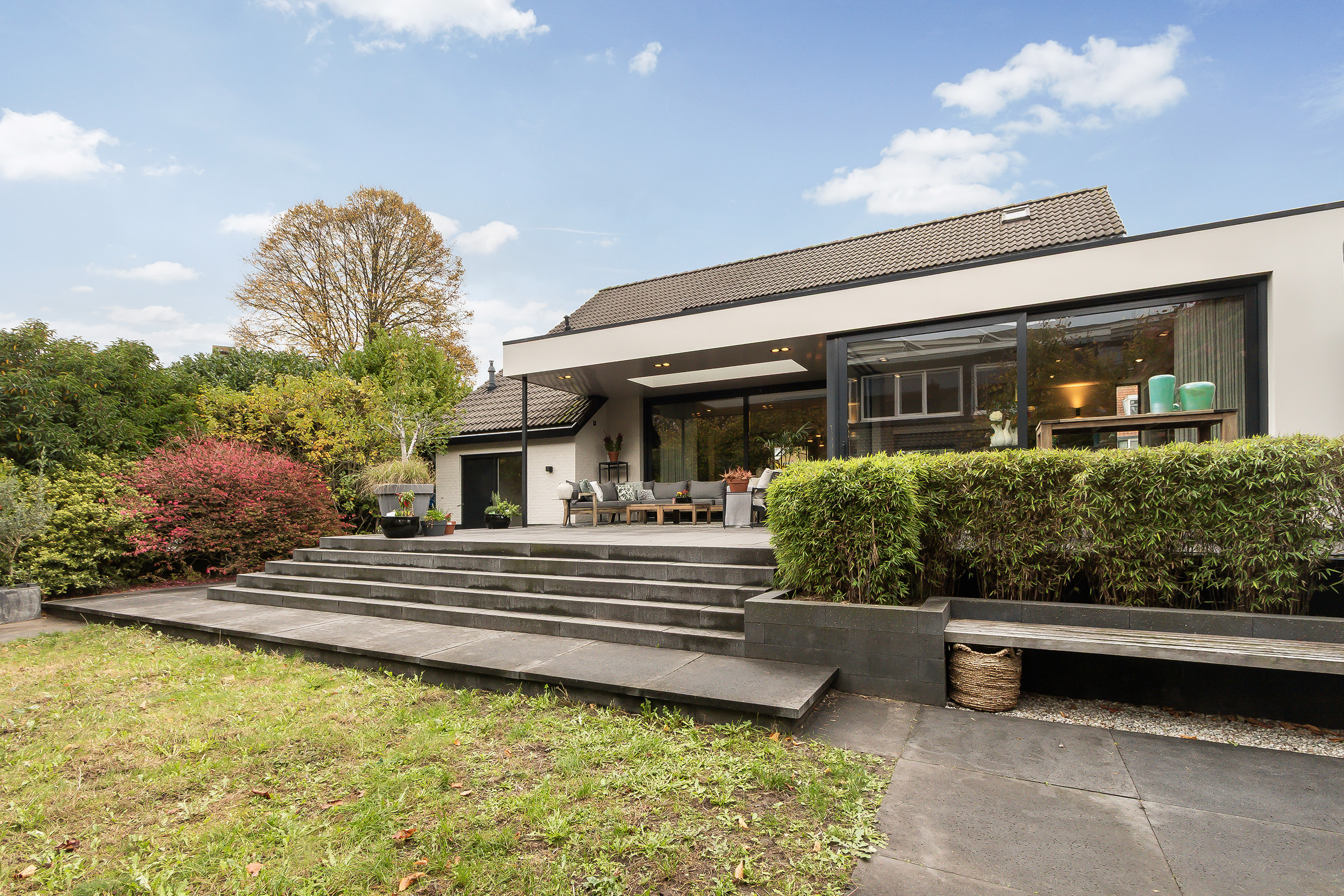 - Stoere grote lounge-overkapping voor het bijgebouw, georiënteerd op het oosten;