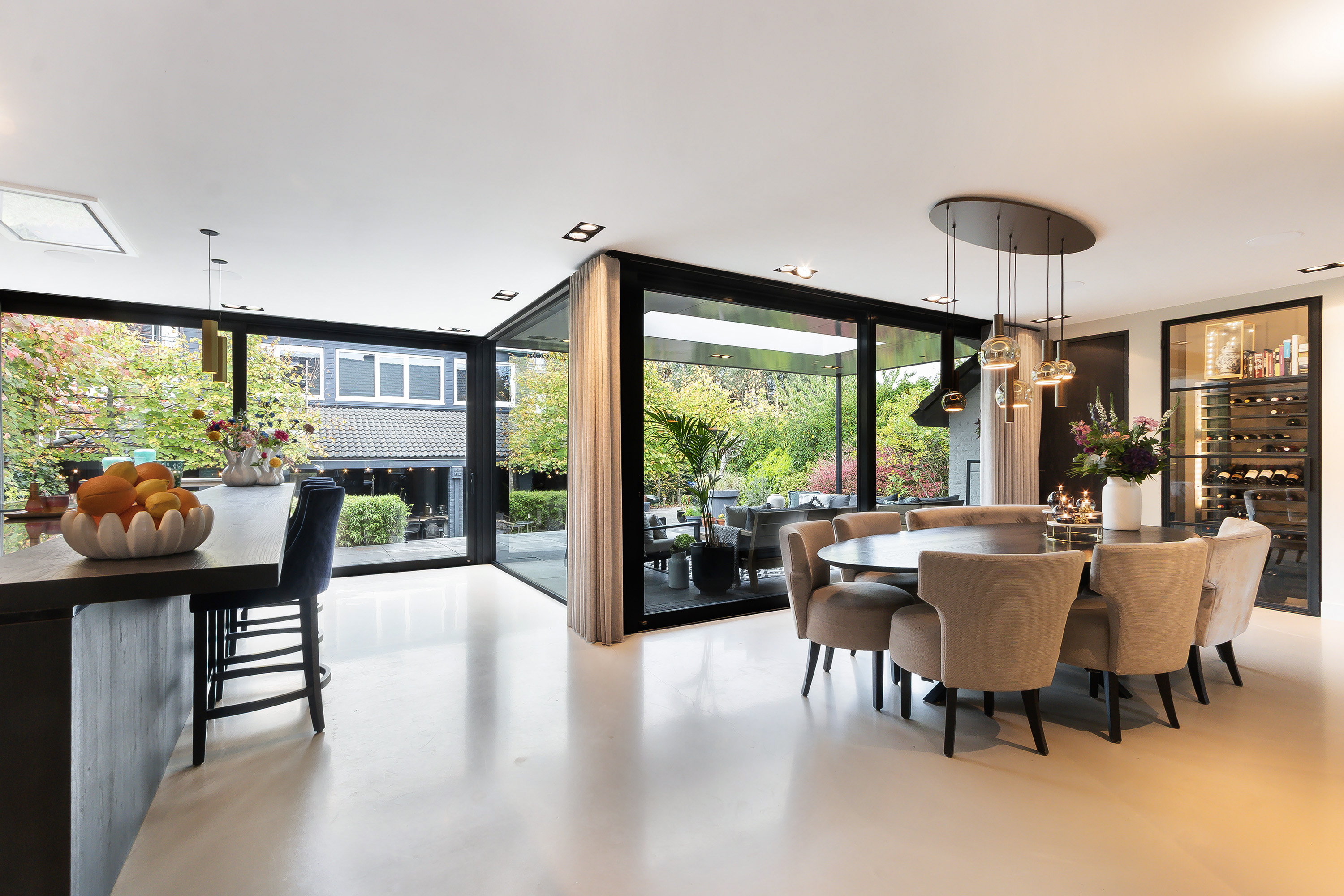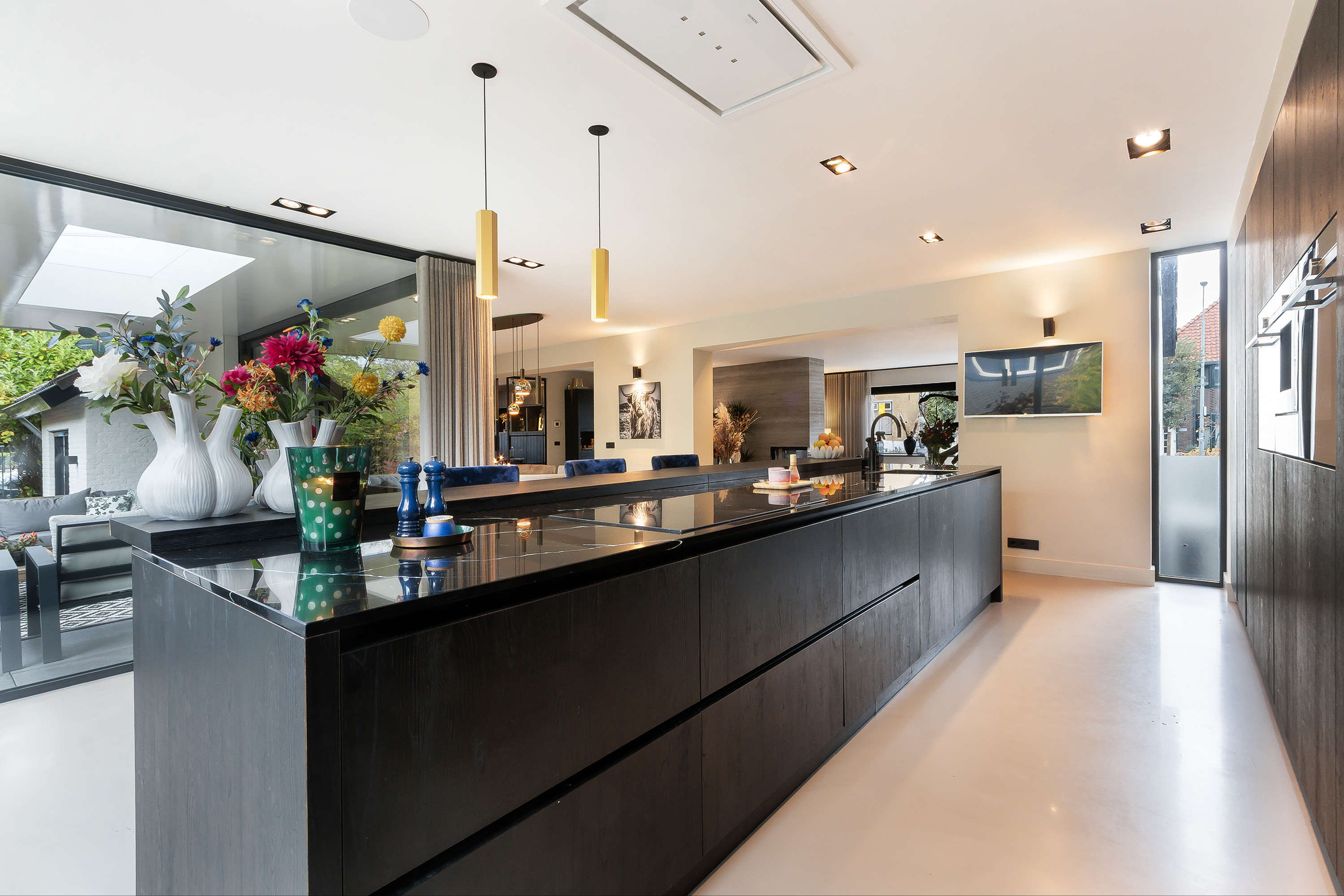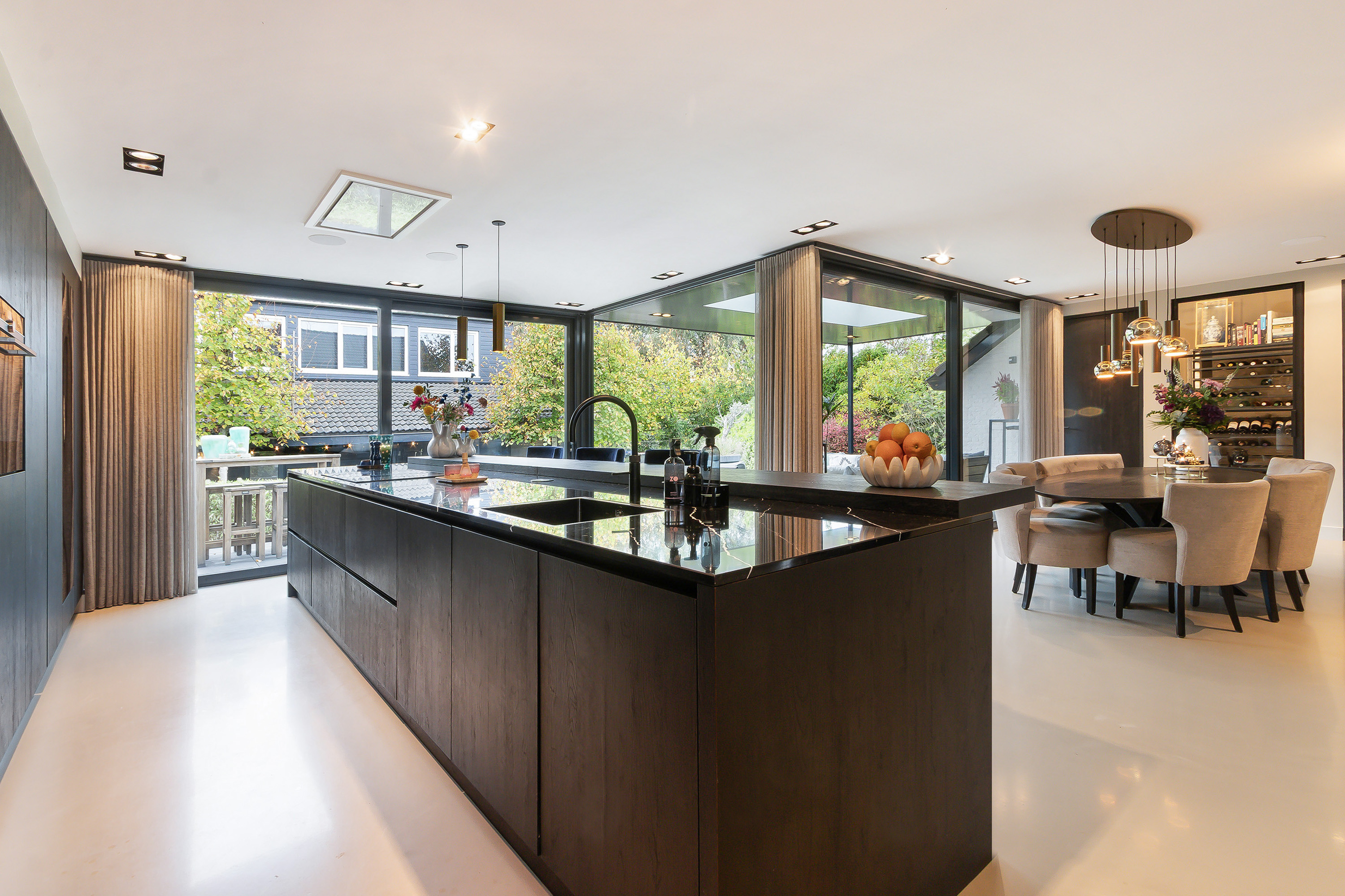 - Echt een topcombinatie is de L-vormige leefkeuken met aansluitend de veranda met 2 schuifpuien. De keukeninrichting bestaat uit 2 secties; een spoel- en kookeiland (1.10 m. diep en 1.40 t.p.v. de eetbar) in combinatie met een eetbar en een wandopstelling. Composiet werkblad, een enkele spoelbak, een Quooker kraan (incl. bruiswater), diverse onder en bovenkasten, diverse laden en een apothekerskast, app.: afzuigunit, 5-zone inductiekookplaat, een vaatwasser, een koelkast, een vriezer, een oven, een stoomoven, een warmhoud lade, een wijnklimaatkast en een koffiezetmachine. Twee hele praktische kasten (een wijnkast en een bergkast);