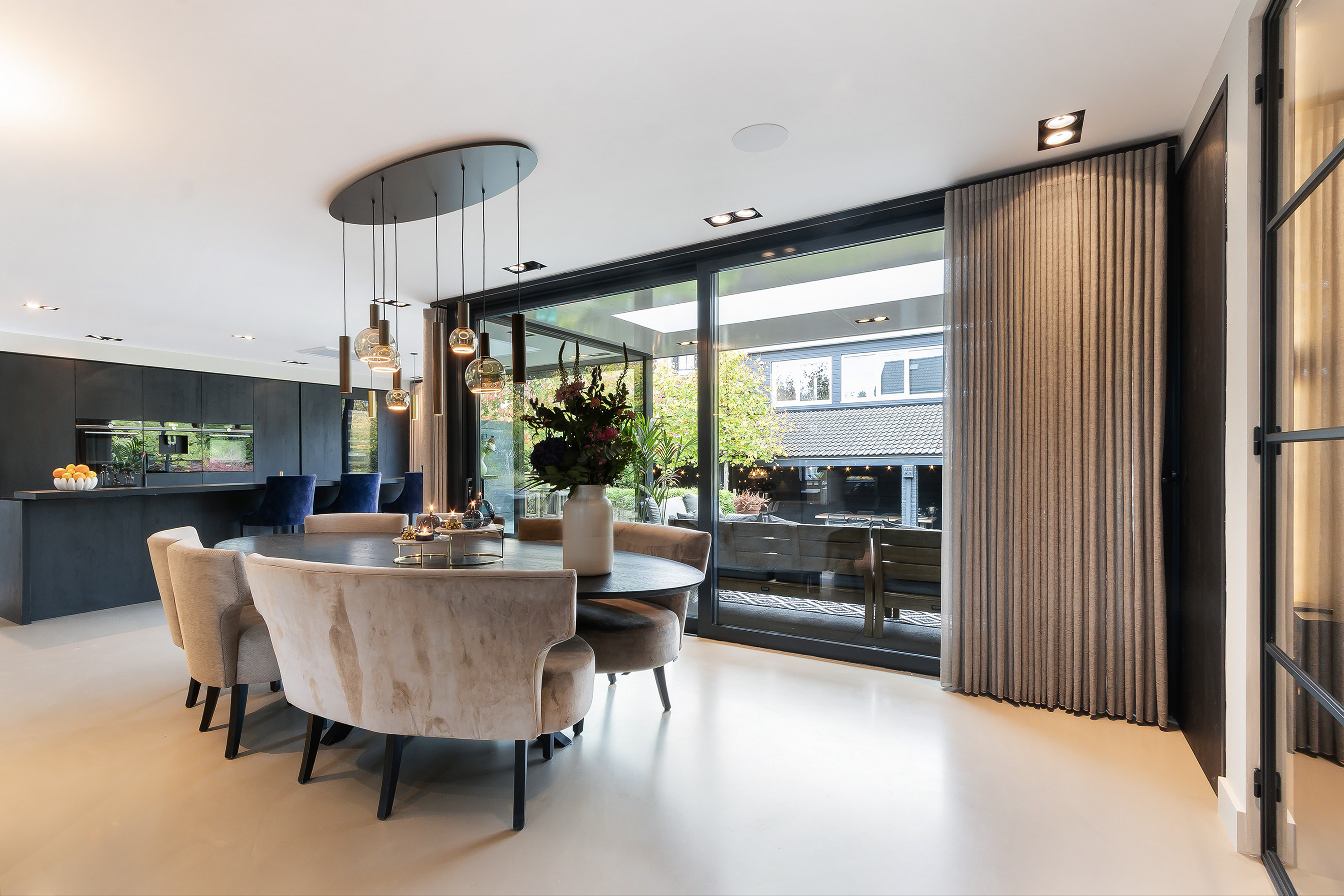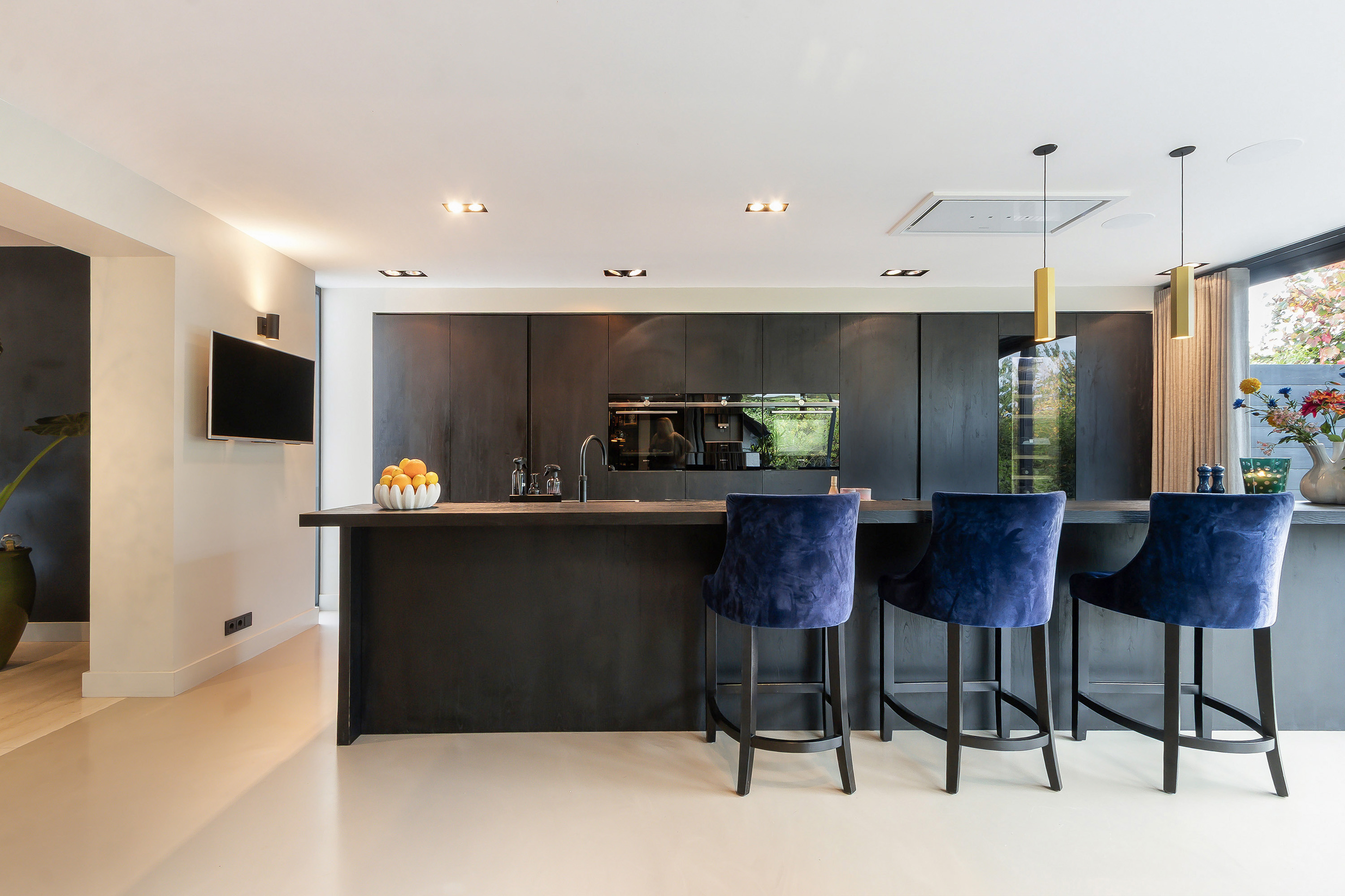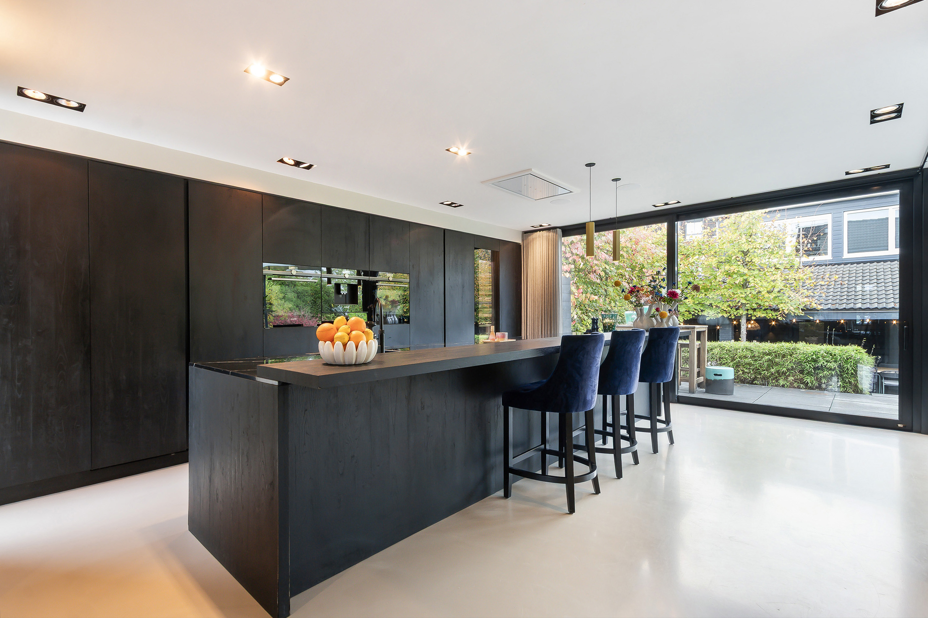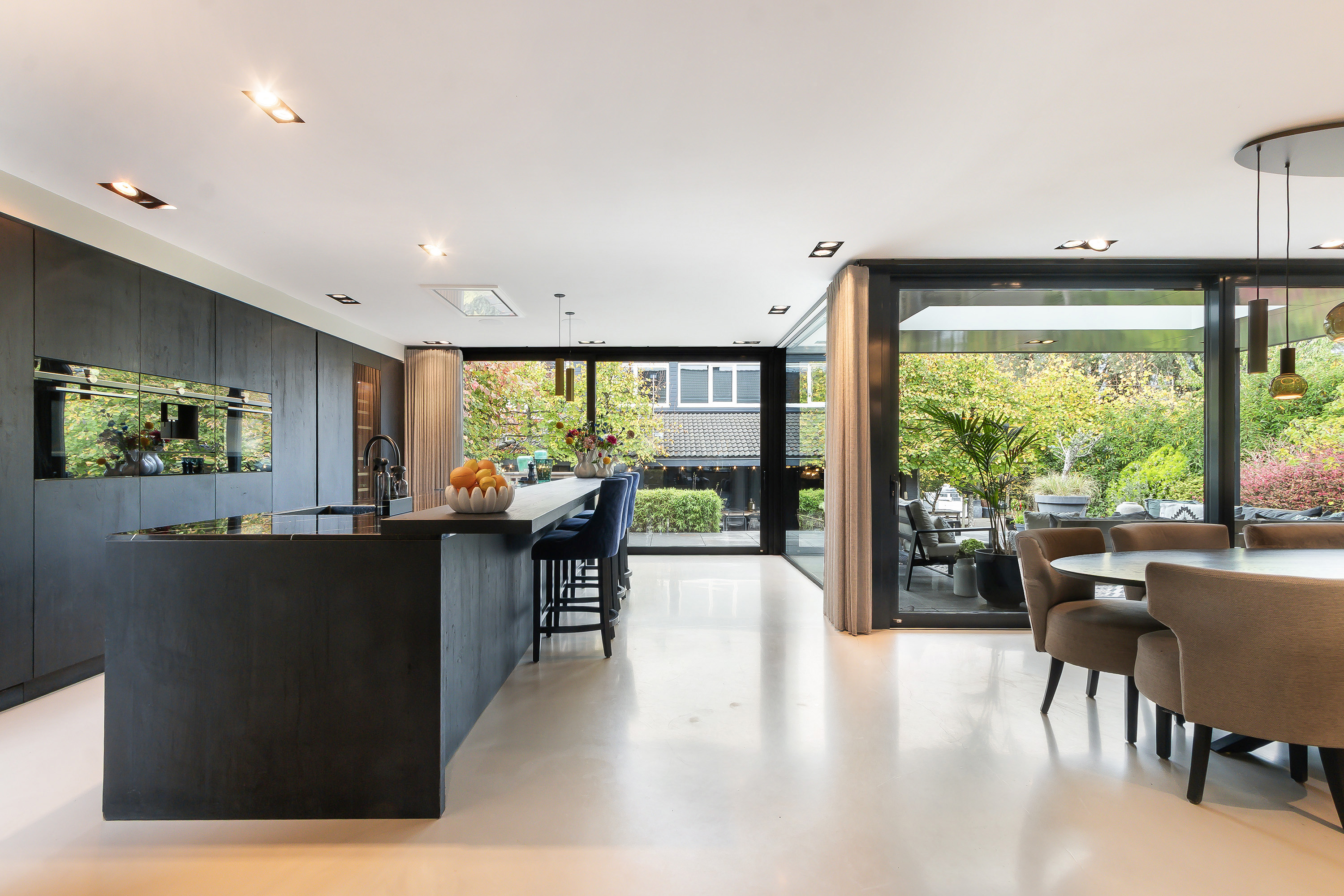 - Echt een topcombinatie is de L-vormige leefkeuken met aansluitend de veranda met 2 schuifpuien. De keukeninrichting bestaat uit 2 secties; een spoel- en kookeiland (1.10 m. diep en 1.40 t.p.v. de eetbar) in combinatie met een eetbar en een wandopstelling. Composiet werkblad, een enkele spoelbak, een Quooker kraan (incl. bruiswater), diverse onder en bovenkasten, diverse laden en een apothekerskast, app.: afzuigunit, 5-zone inductiekookplaat, een vaatwasser, een koelkast, een vriezer, een oven, een stoomoven, een warmhoud lade, een wijnklimaatkast en een koffiezetmachine. Twee hele praktische kasten (een wijnkast en een bergkast);