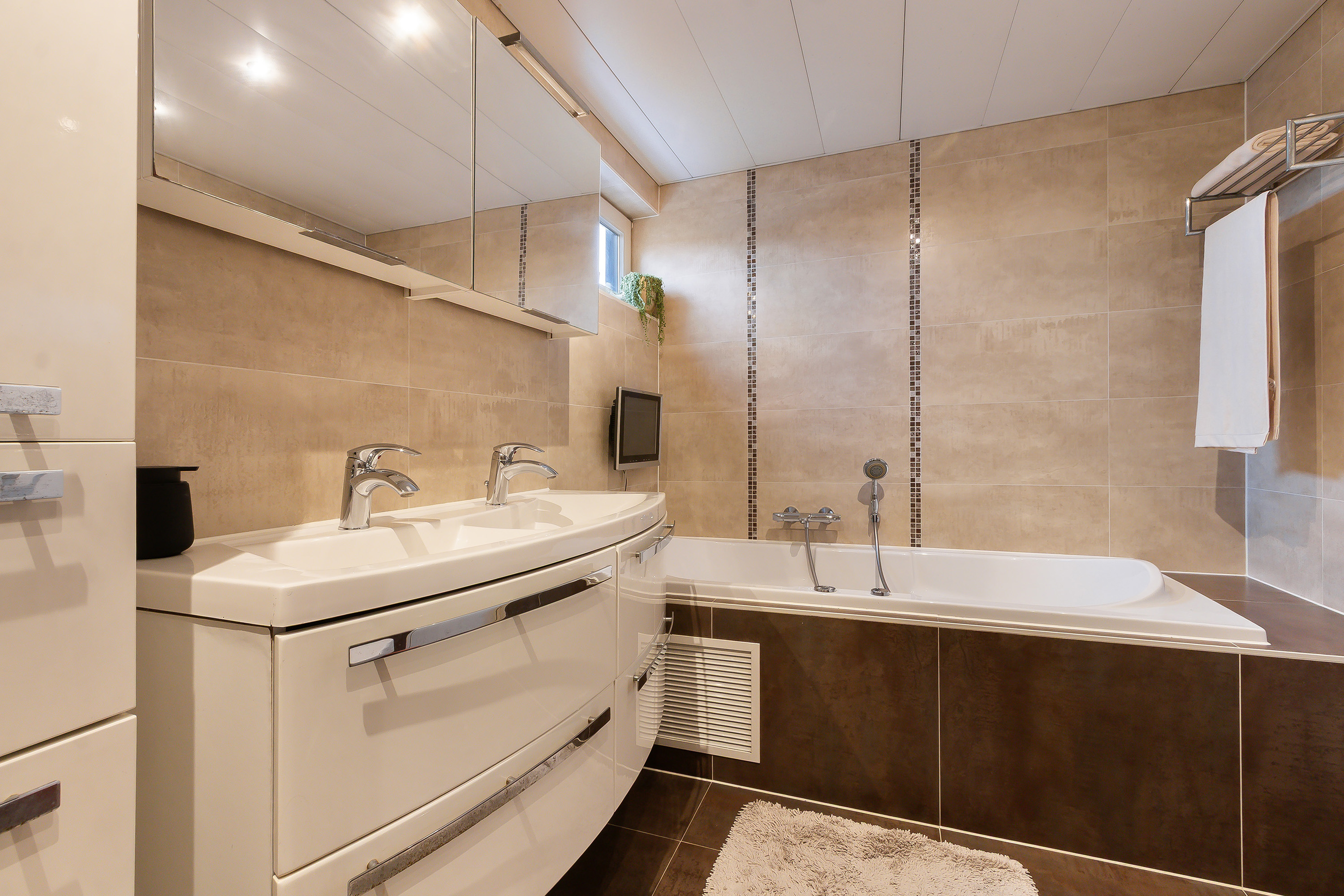 - Badkamer, gelegen aan de voorzijde met geheel betegelde wanden, een plavuizen vloer met elektrische vloerverwarming, wit sanitair, een wastafelmeubel met 2 waskommen, een inloopdouche, een jacuzzi met tv, een hangcloset en een designradiator. Aluminium lamellen plafond.