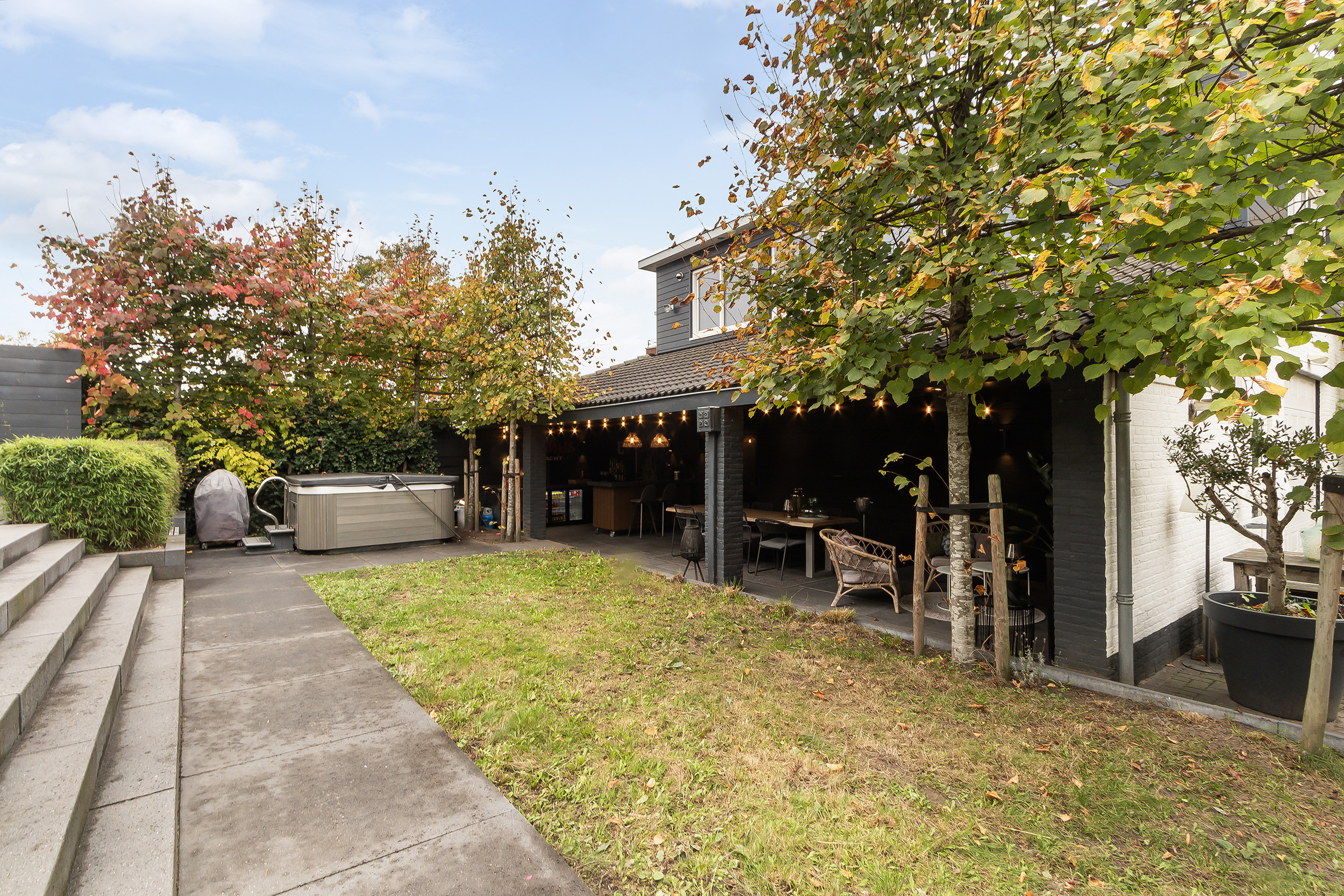 - Tuin rondom met de achtertuin op het westen met een heerlijke veranda van ca. 15 m² met overkapping, een jacuzzi en een grote stoere lounge-overkapping. Omheind en aangelegd met borders. Container opstelplaats. Meerdere stroom - en waterpunten. Aan de noordzijde van de tuin bevindt zich een schuifpoort (elektronisch - en op afstand bedienbaar), de tuin dient hier nog nader aangelegd te worden. Aan de voorzijde van de woning is er parkeergelegenheid voor 3 auto’s;