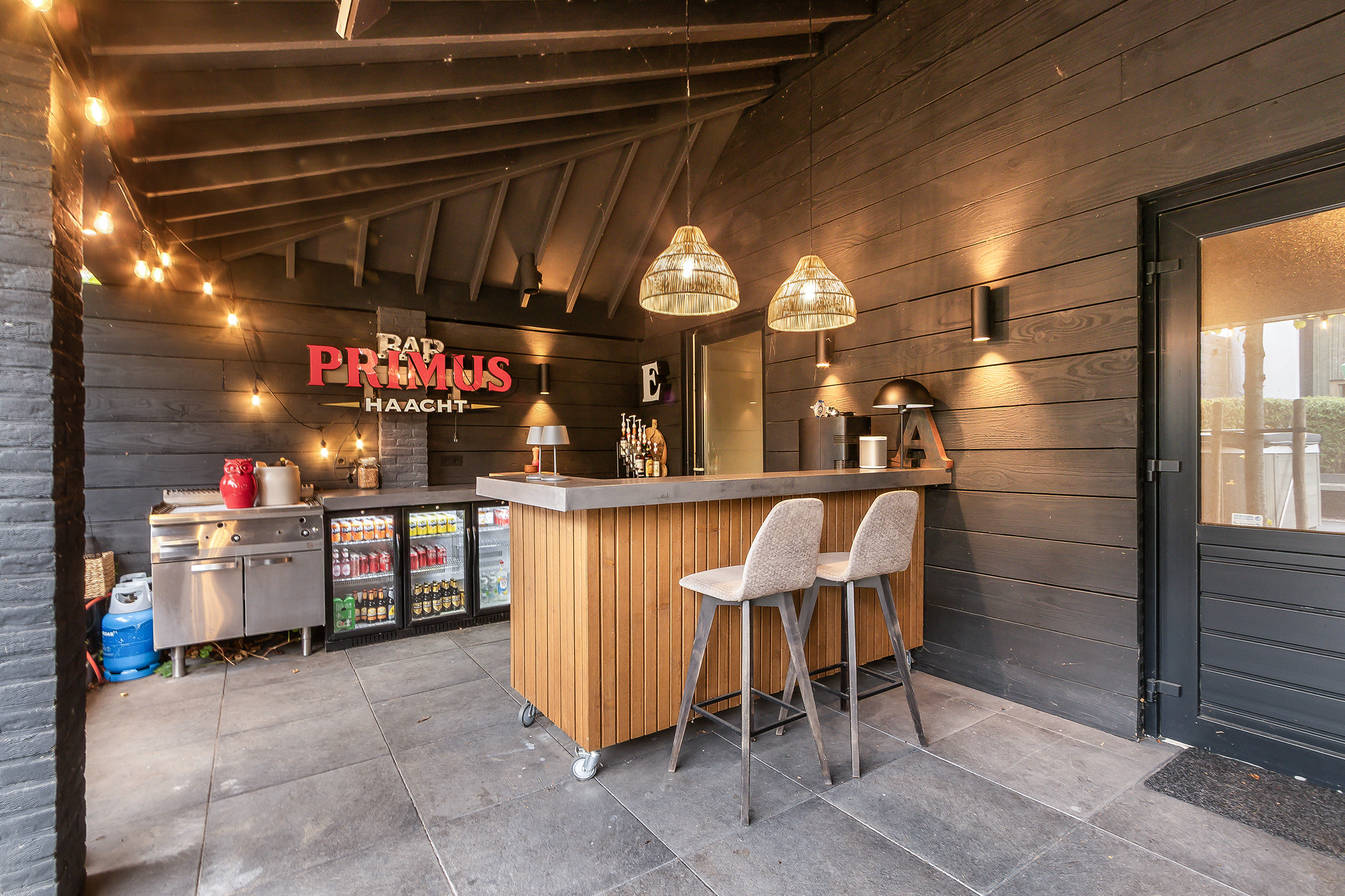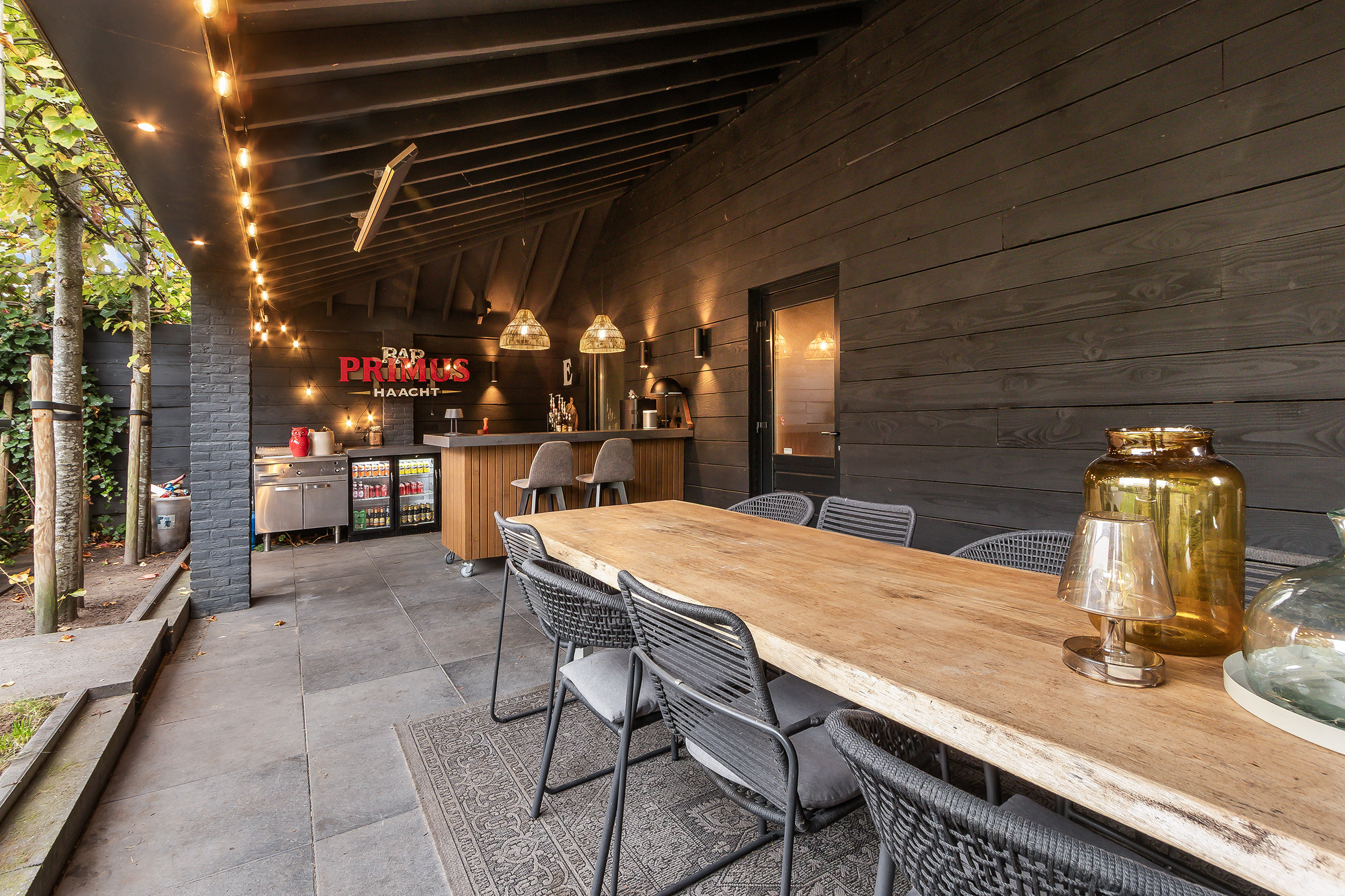 - Grote stoere houten lounge-overkapping voor het bijgebouw met een plavuizen vloer (60 x 60 cm.), een sfeervolle gashaard, 2 elektrische heaters, een bar, een keukeninrichting met professionele apparatuur zoals een bakplaat en koelingen.