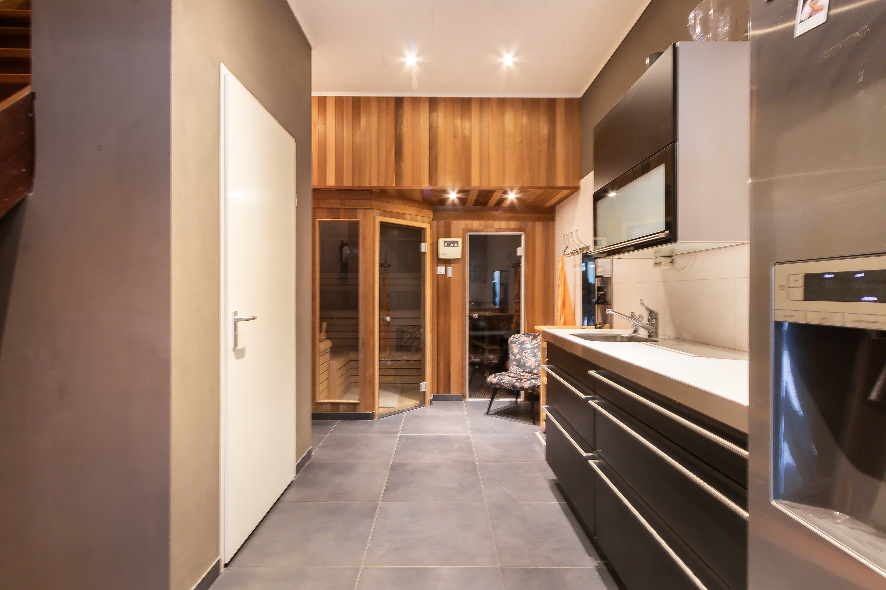 In het midden een entreehal met een keukenblok, de trapopgang naar de verdieping en een wellness met o.a. een traditionele sauna, een stoombad, een douche en een toilet.