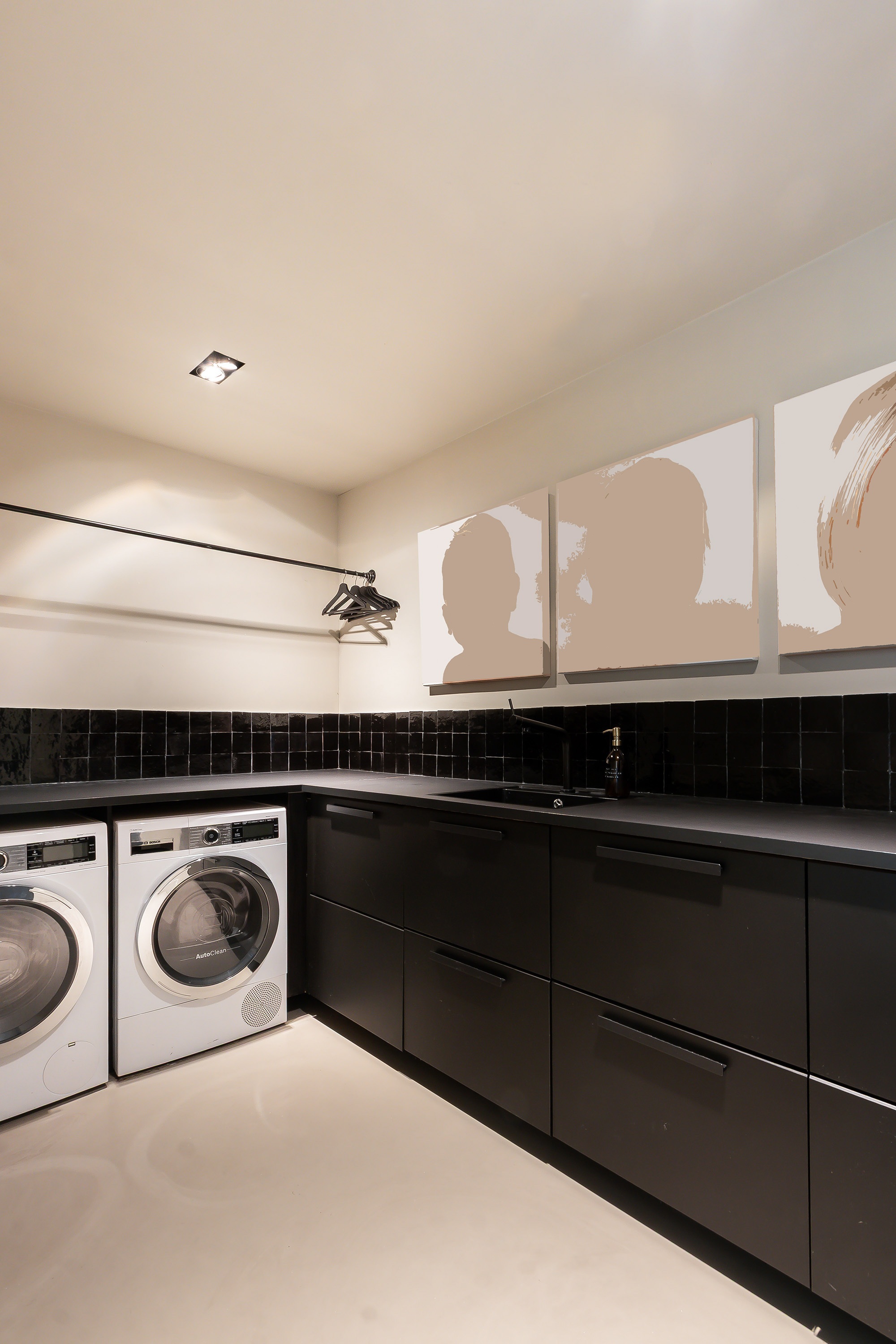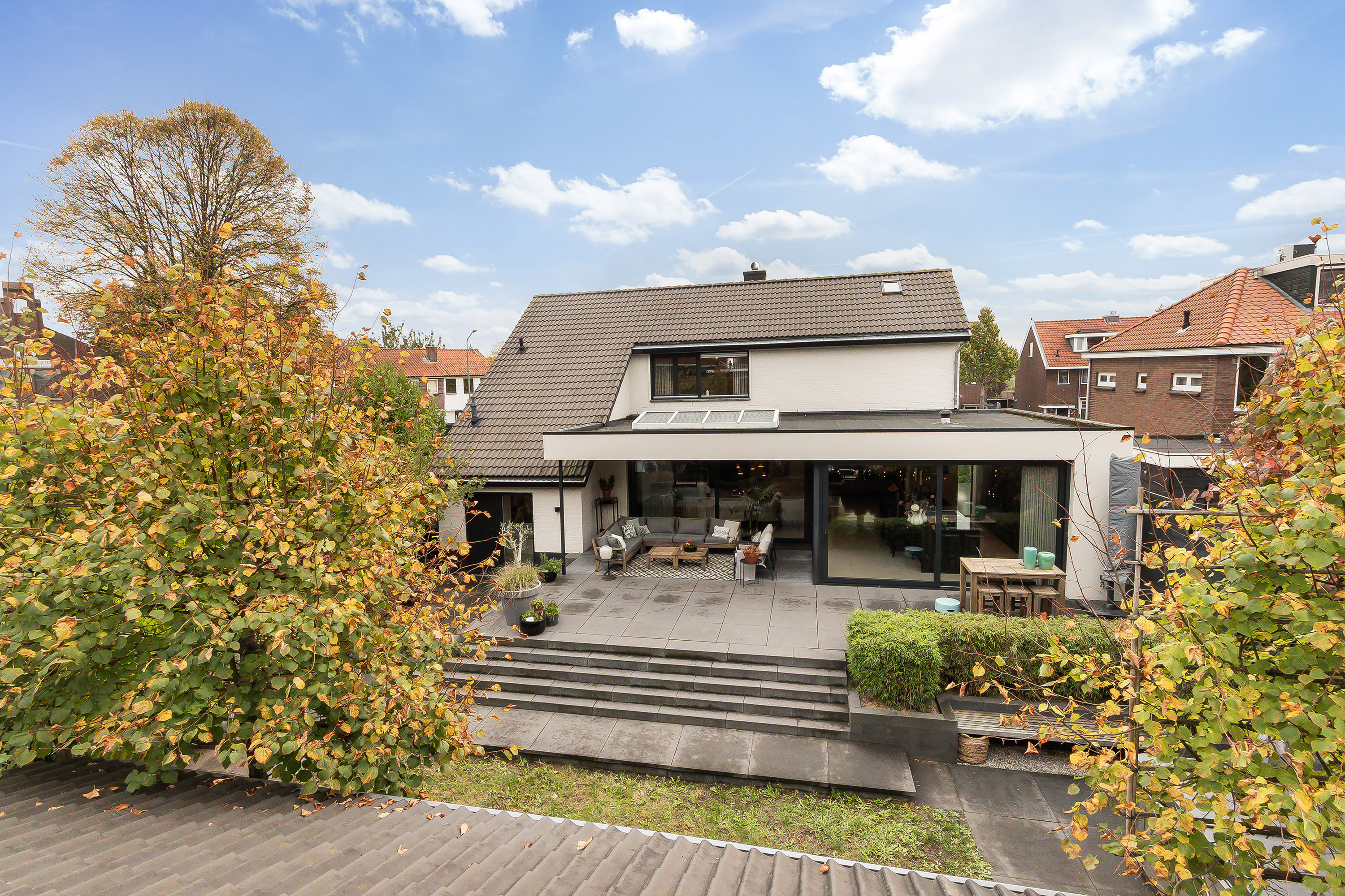 - Bijkeuken met een keukenblok en de opstelplaats t.b.v. de wasmachine en de wasdroger, trapje af naar hal tuinzijde;