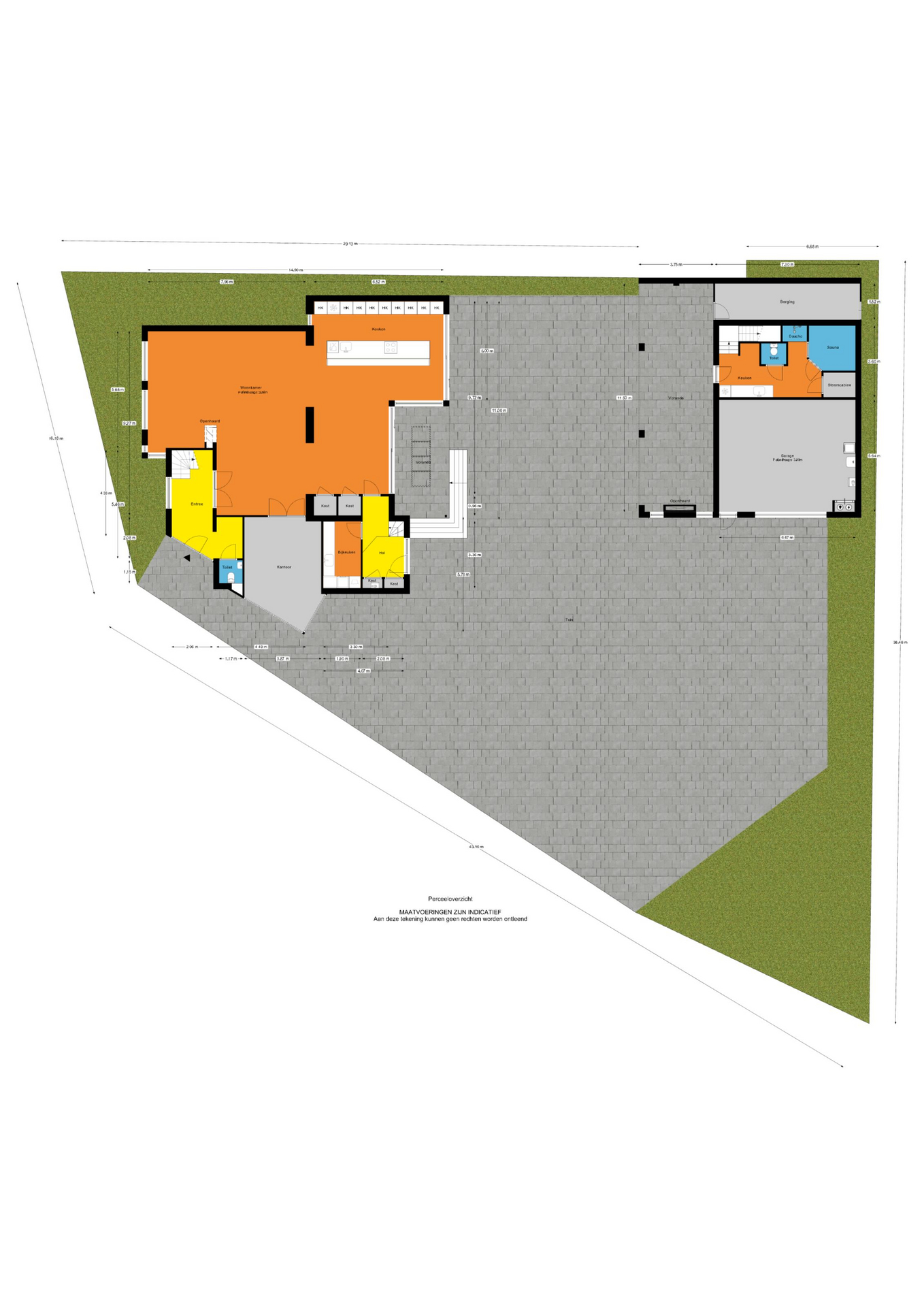 - Een super bijgebouw (ca. 147 m² in 2 bouwlagen) met op de begane grond een grote garageruimte/ multifunctionele ruimte (ca. 39 m²), een wellness (ca. 25 m²) en een separate opbergruimte (ca. 13 m²) en op de verdieping een kantoorruimte (ca. 70 m²);