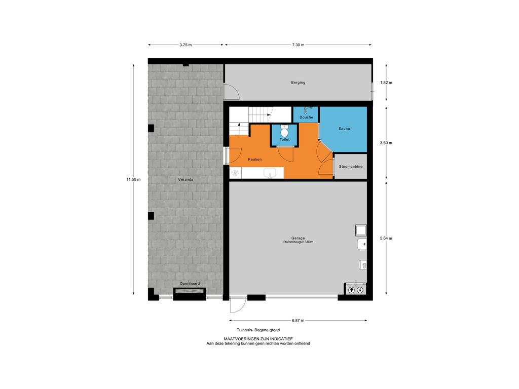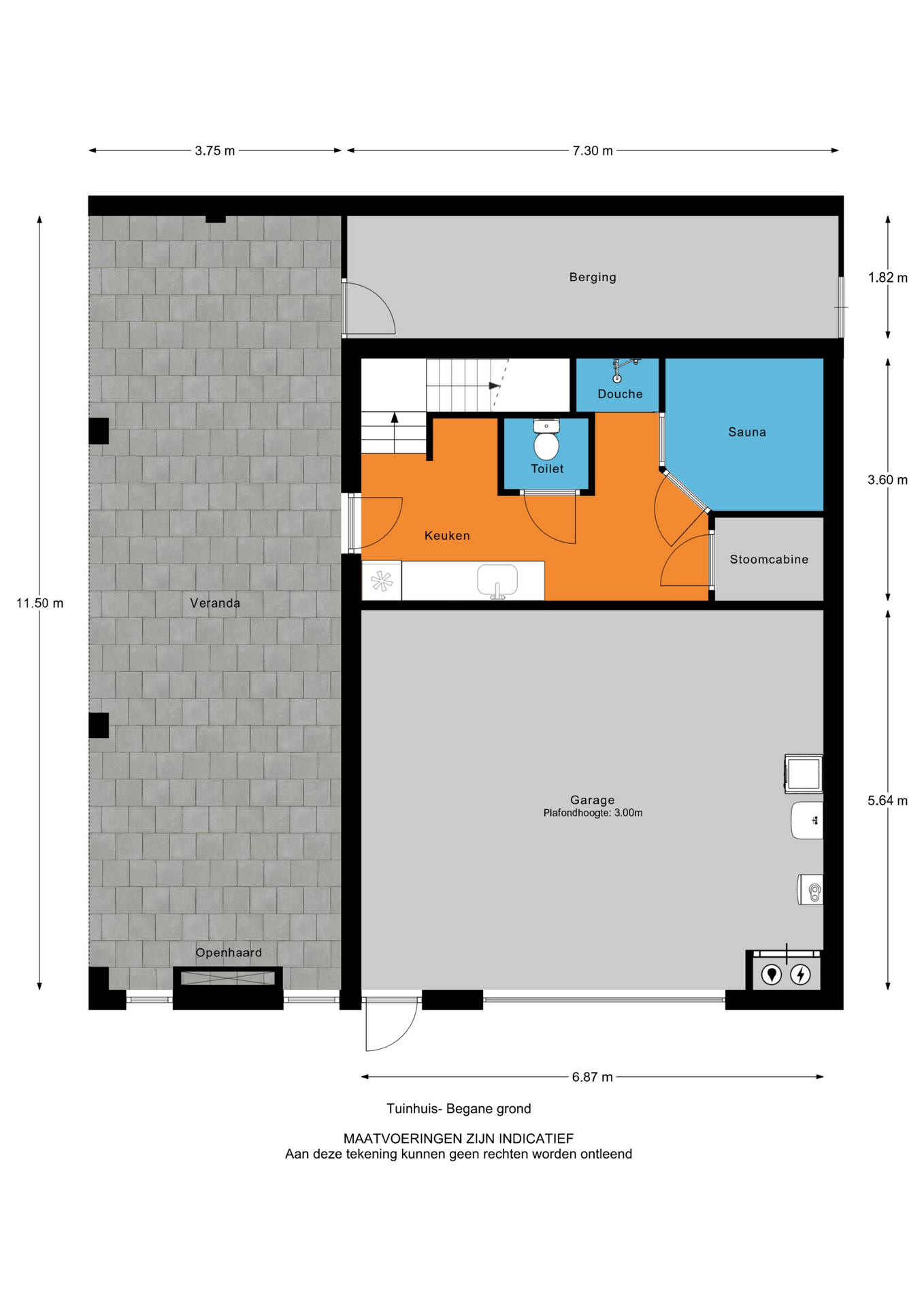 Aan de linkerzijde een opslag-/ gereedschapsruimte met een vliering en een buitendeur. V.v. elektra.