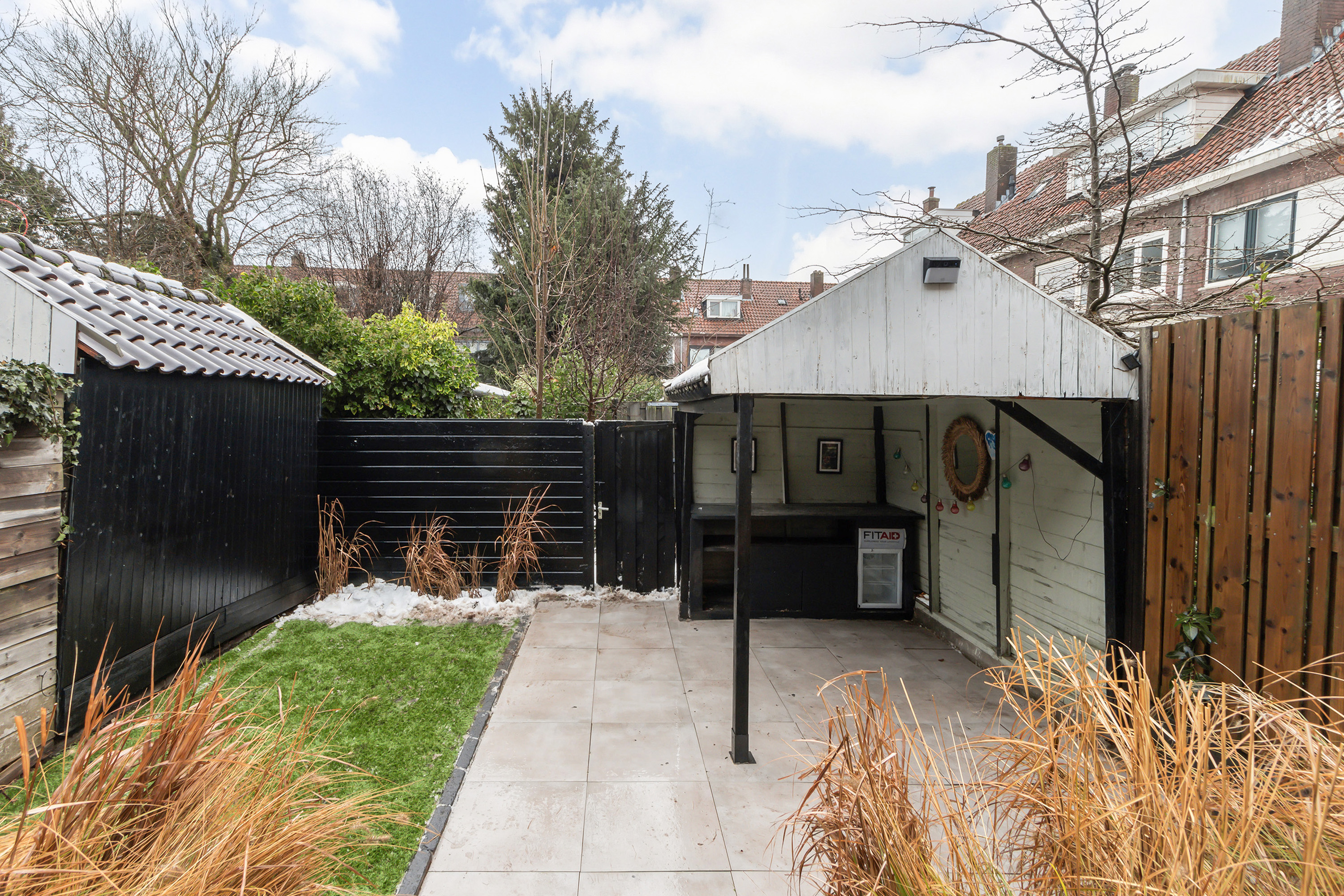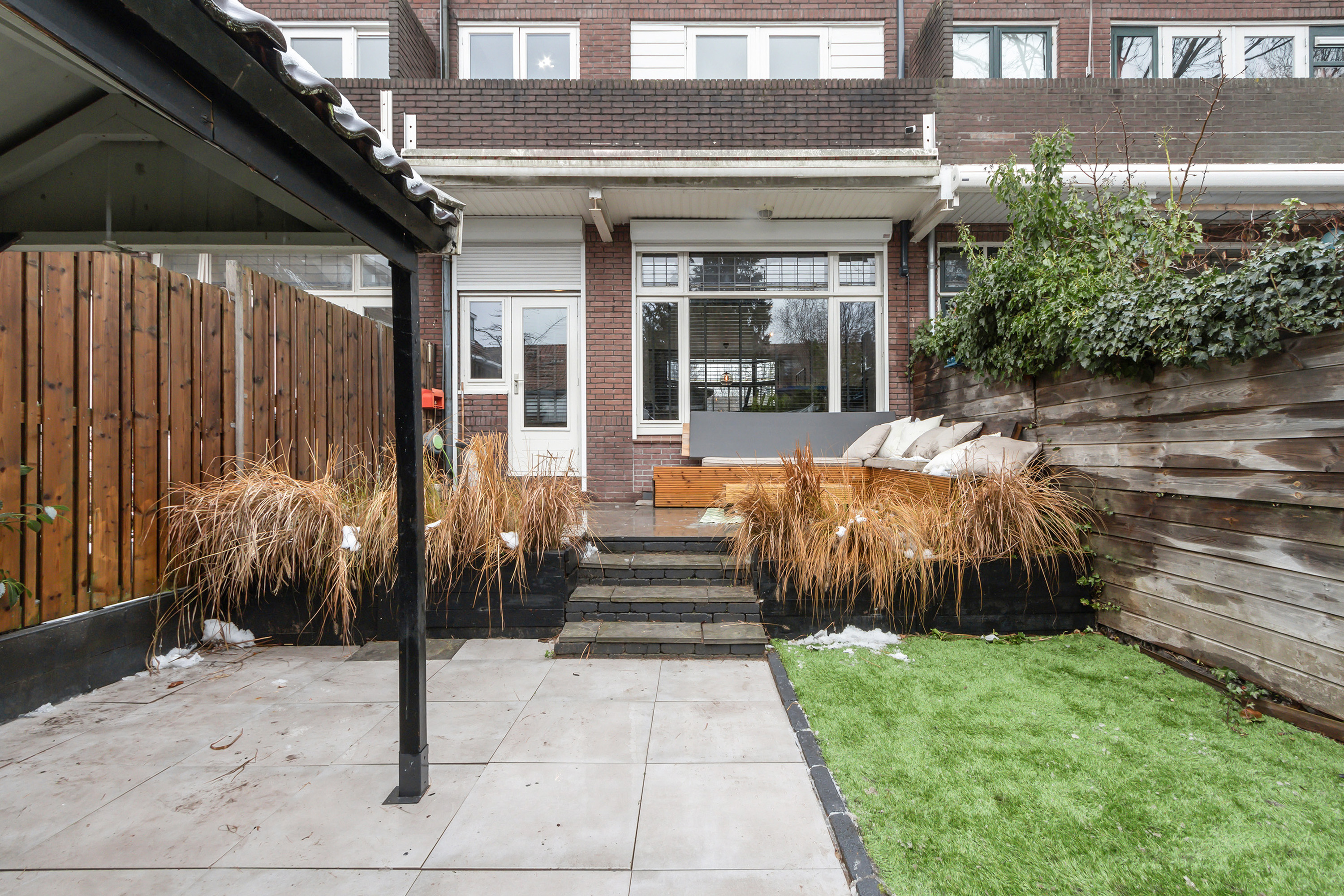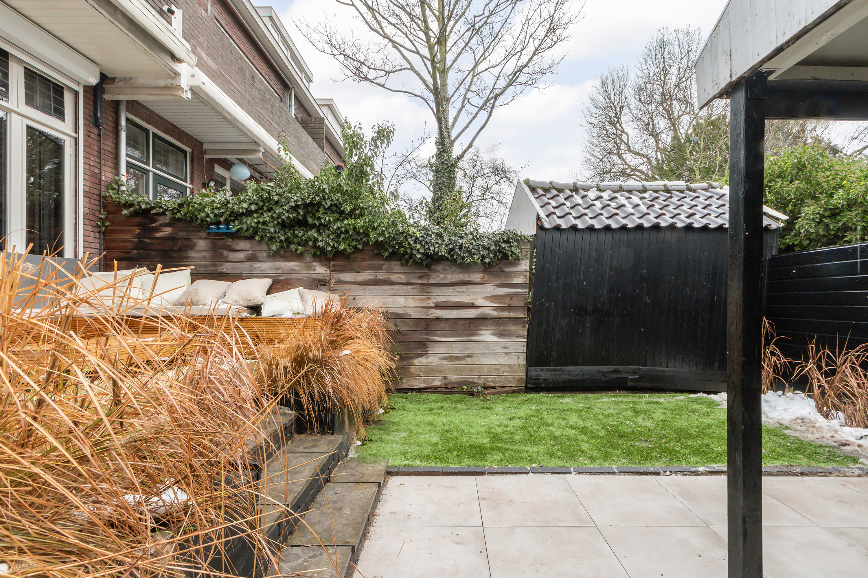 - Achtertuin: ca. 5.34 x 8.00 m., gesitueerd op het zuidoosten. Fraai aangelegd met achterom en vrijstaande houten overkapping voorzien van elektra.