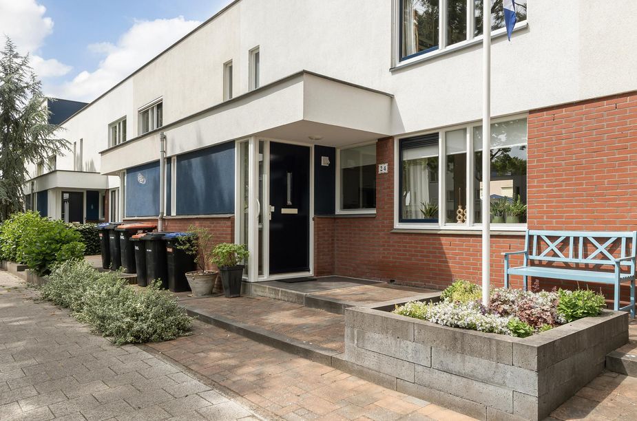 - Voortuin: gesitueerd op het oosten. Aangelegd met tegels en een gedeelde plantenbak met de buren.