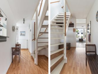 - Begane grond: glasvliesbehang. Eiken lamelparketvloer en laminaat vloerafwerking.