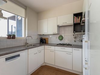 - Open keuken aan de voorzijde van de woning met een standaard wit kunststof blok in hoekopstelling met 1,5 rvs spoelbak, een betegelde achterwand, diverse onder en bovenkasten, laden en een apothekerskast, app.: vlakscherm afzuigunit, een 4-pits gaskookplaat, een vaatwasser en een combimagnetron.