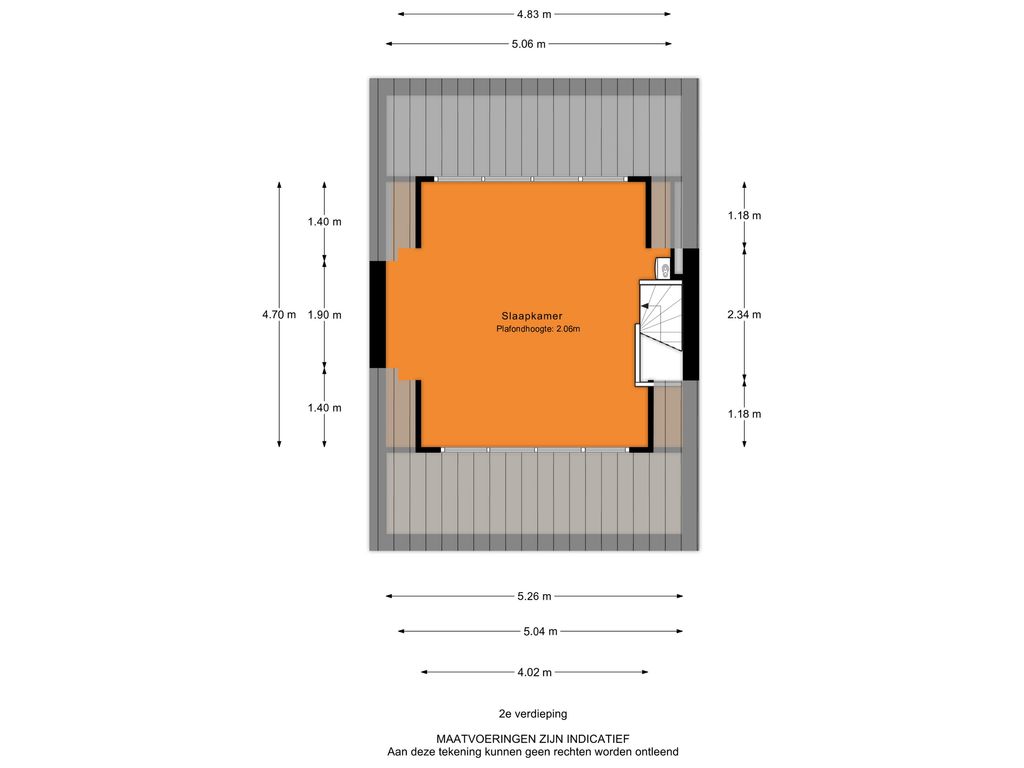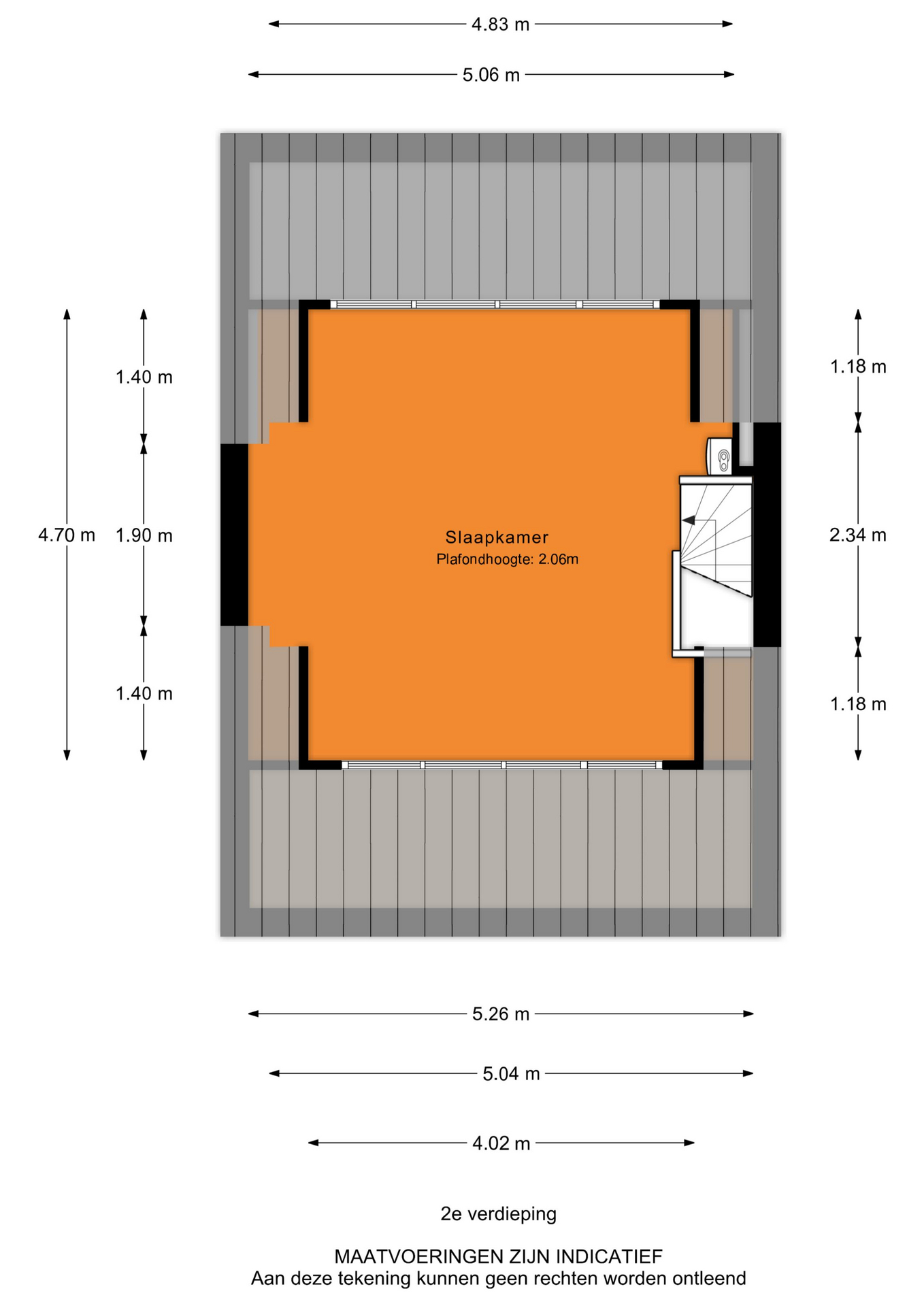 De zolderruimte (plafondhoogte ca. 2.06 m.) is ruim door de 2 dakkapellen en biedt mogelijkheden als extra slaapkamer of als hobby-/ werkruimte.