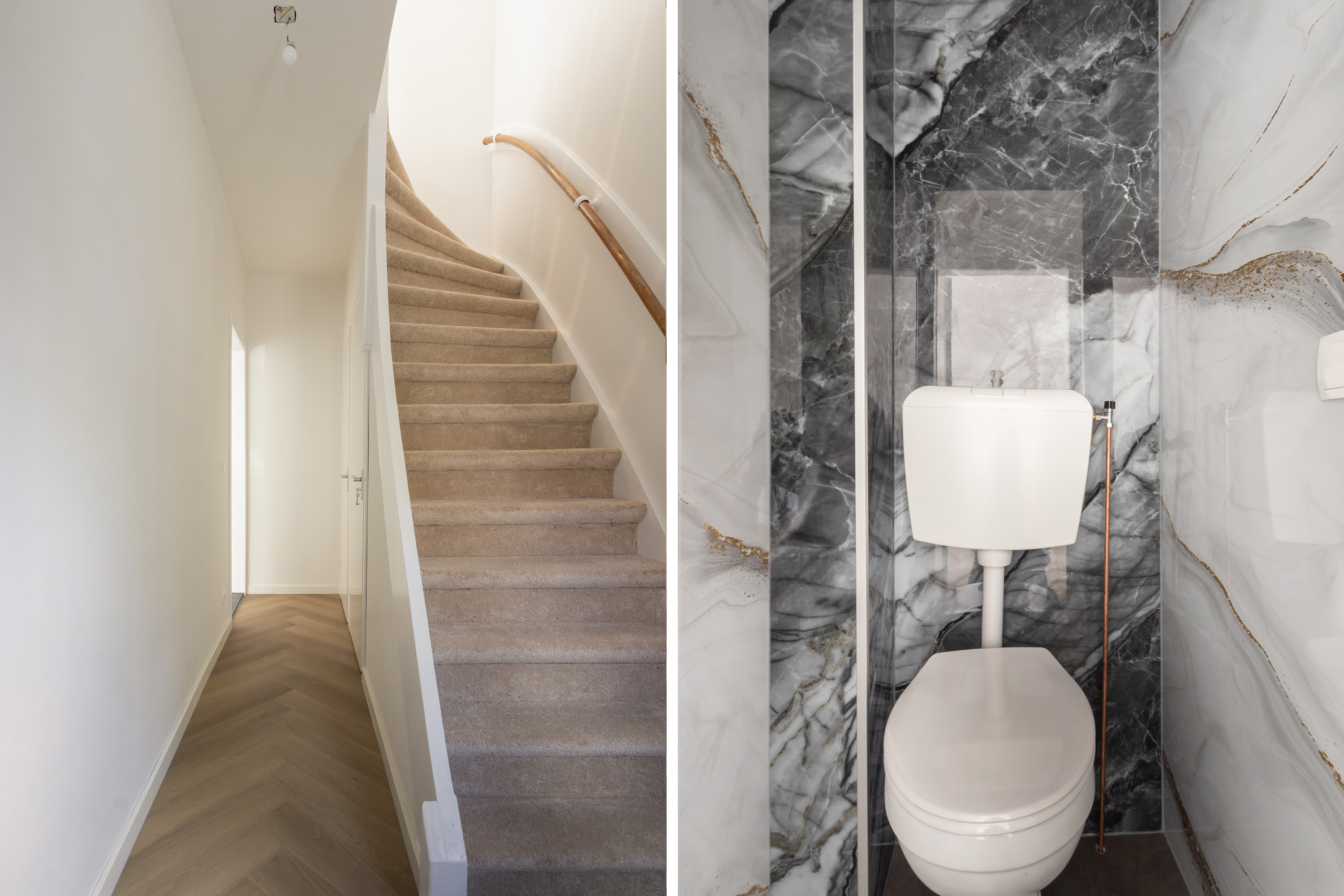 - Overloop met open trap naar 2e verdieping en een toilet;