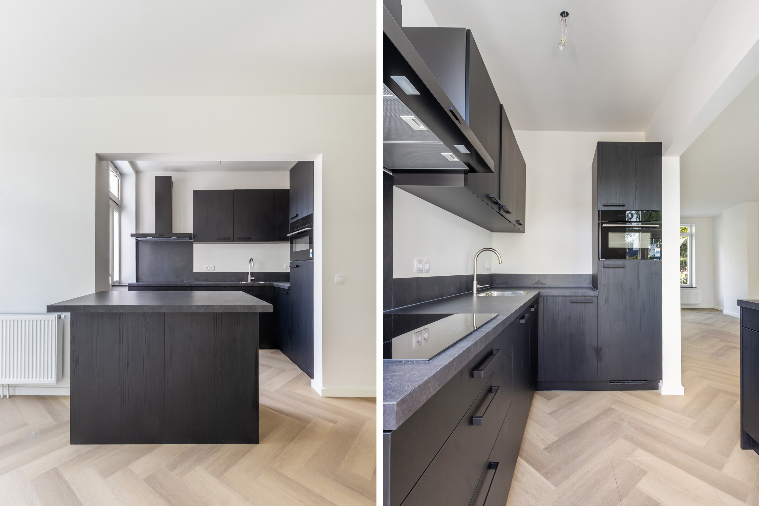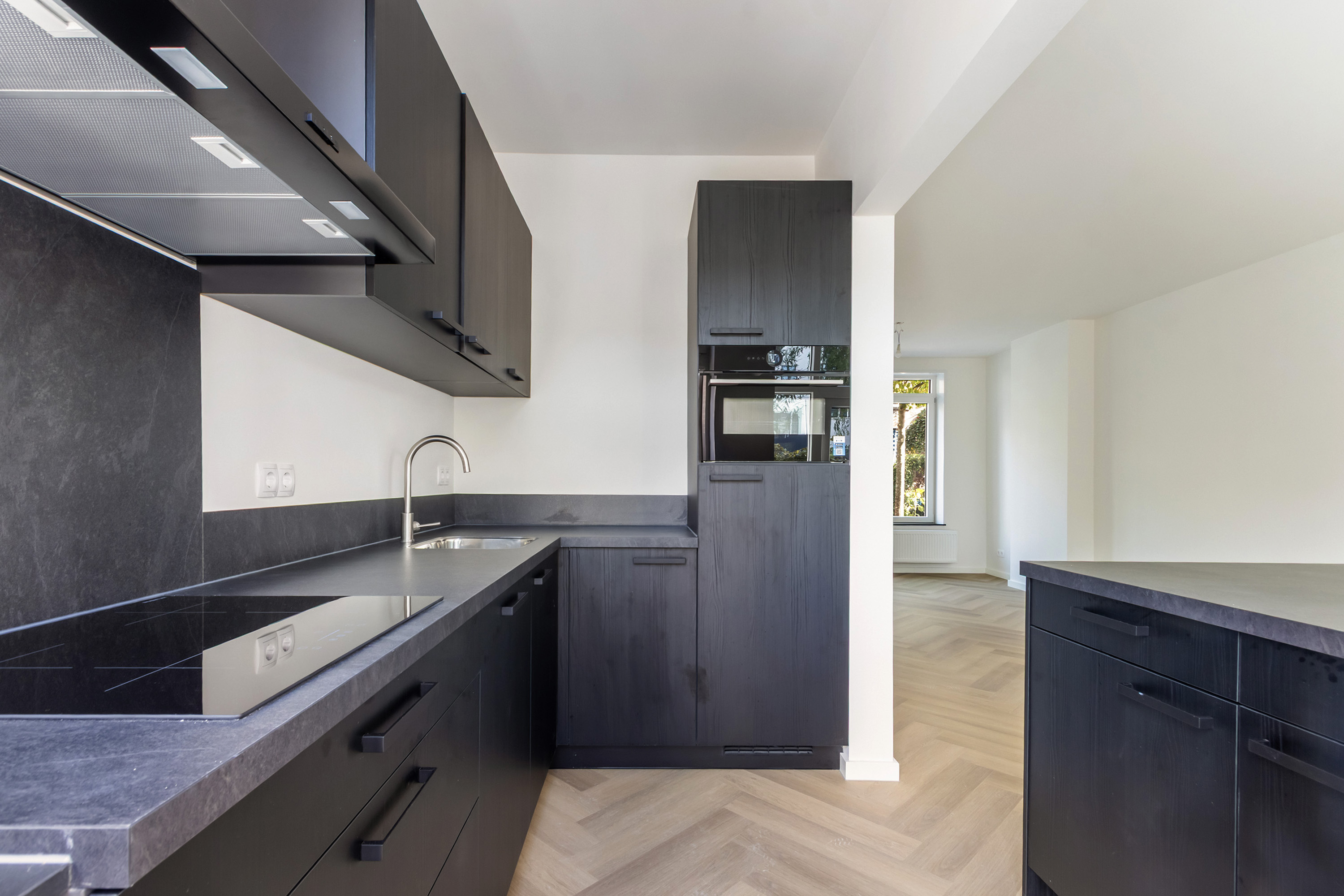 - Open keuken met moderne/ nieuwe inrichting in hoekopstelling en een eilandblok annex eetbar met extra kastruimte. Enkele rvs spoelbak, diverse onder en bovenkasten, ‘magic corner’, laden, app. (o.a. Bosch en Inventum): afzuigkap, 4-zone inductiekookplaat, vaatwasser, koelkast met vriesvak en een combi-oven. Tuindeur.