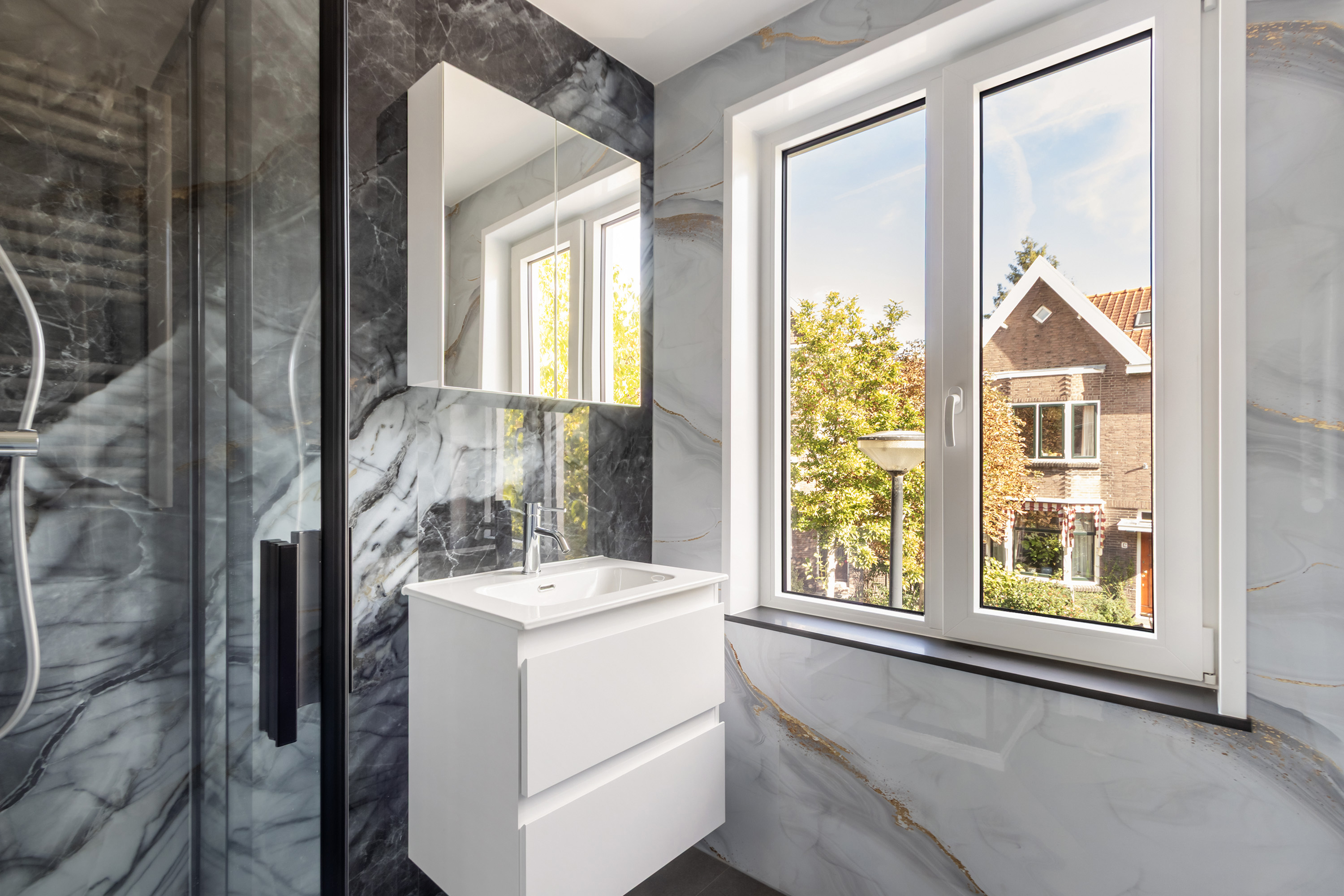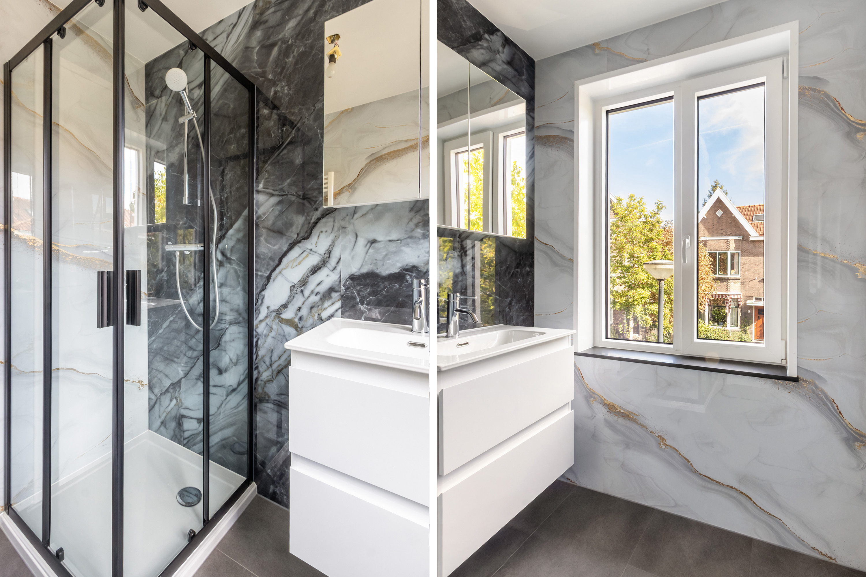 - Luxe badkamer, hotel chique met fraaie marmer look pvc wandafwerking, een plavuizen vloer, wit sanitair, wastafelmeubel met spiegelkastcombinatie, een douchecabine met thermostaatkraan en een elektrische designradiator.