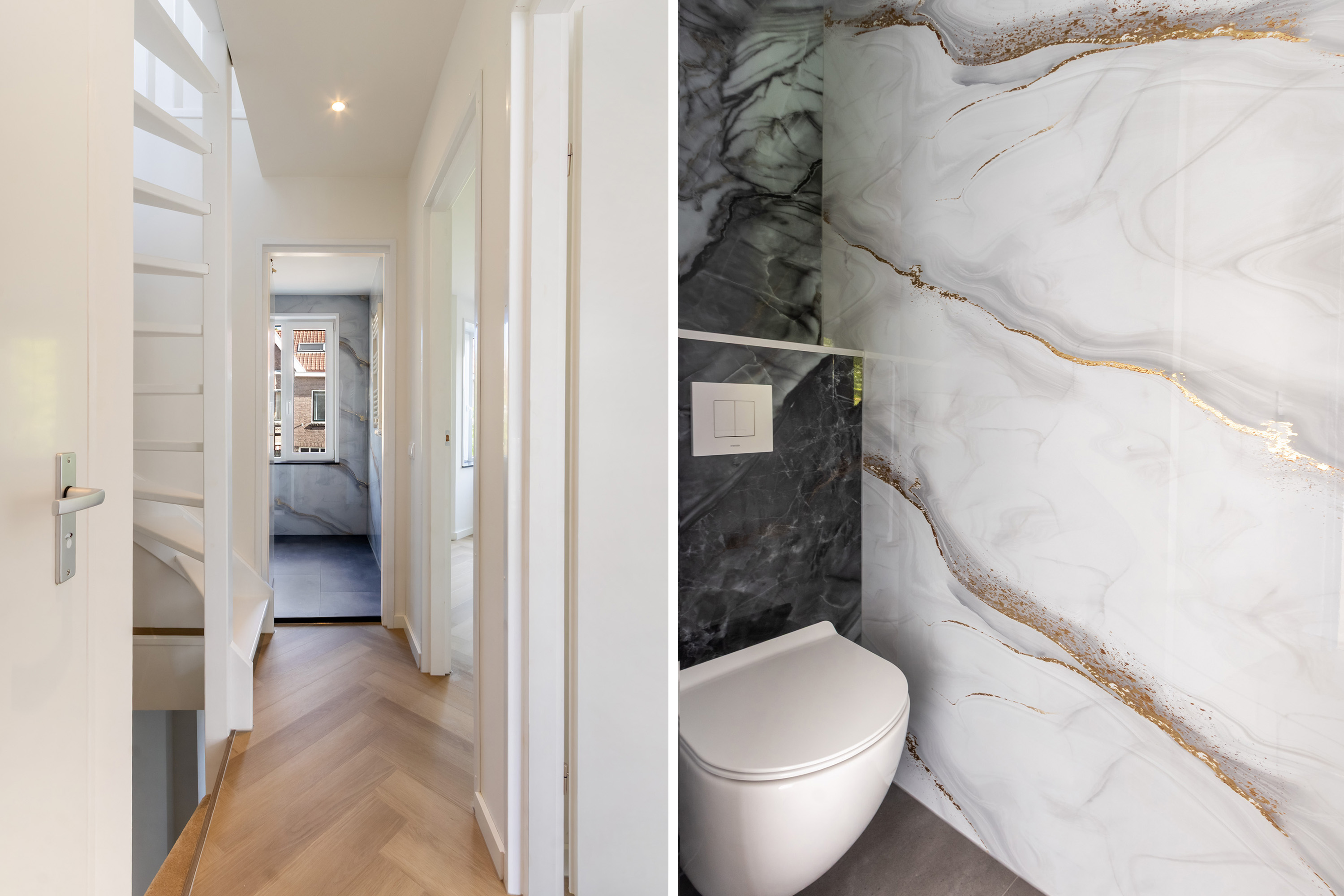 - Luxe toilet, hotel chique met fraaie marmer look pvc wandafwerking, een plavuizen vloer, wit sanitair, hangcloset;