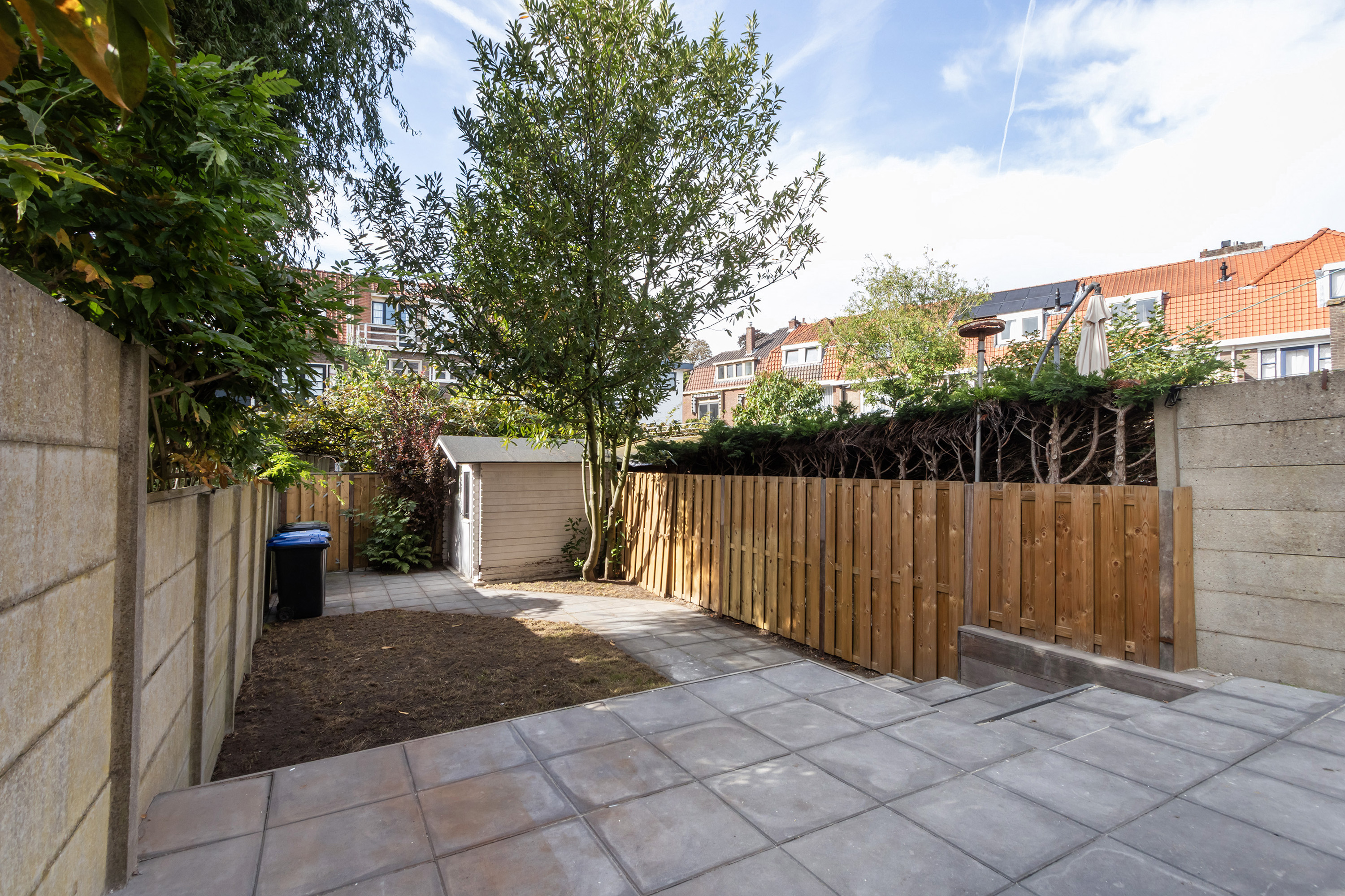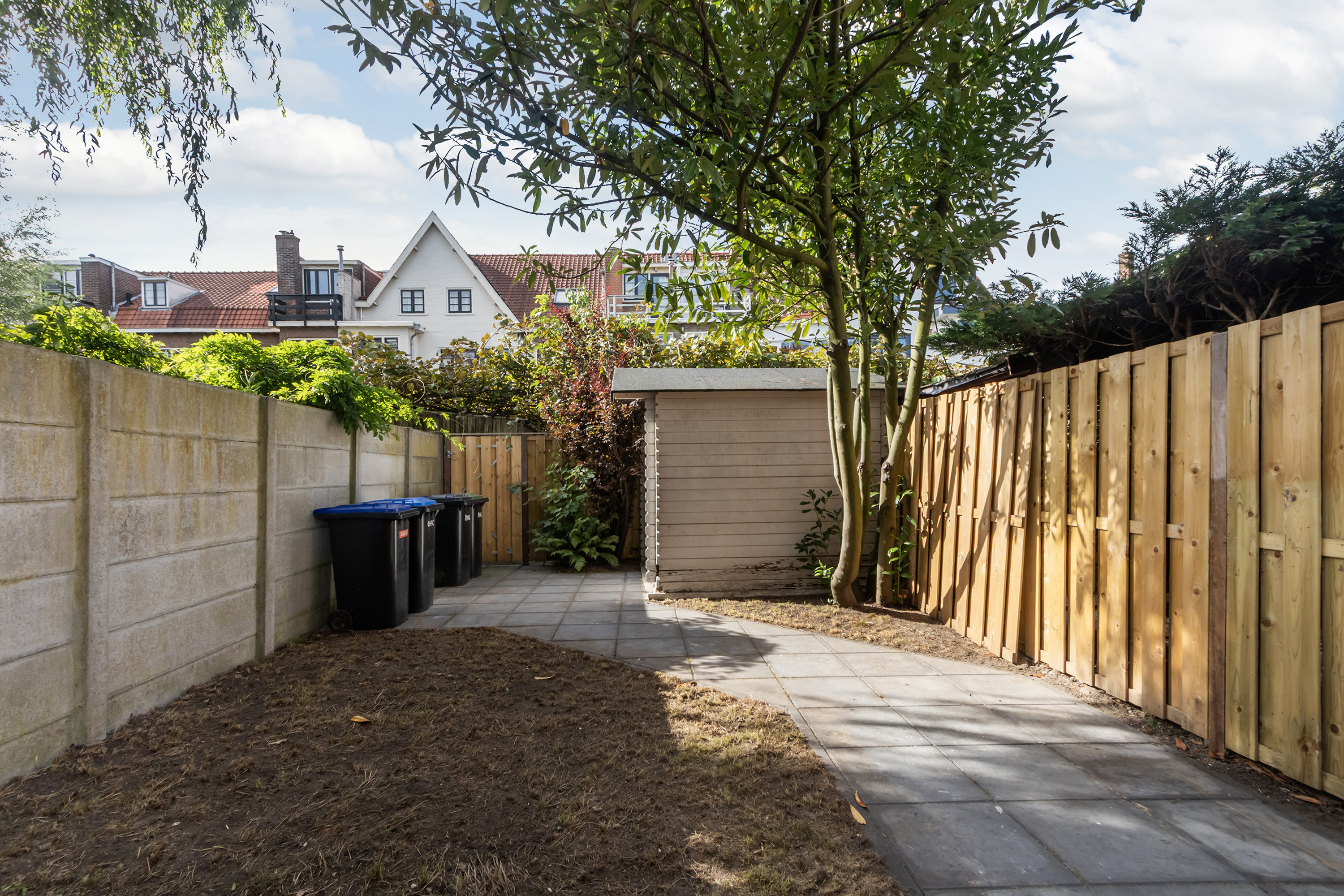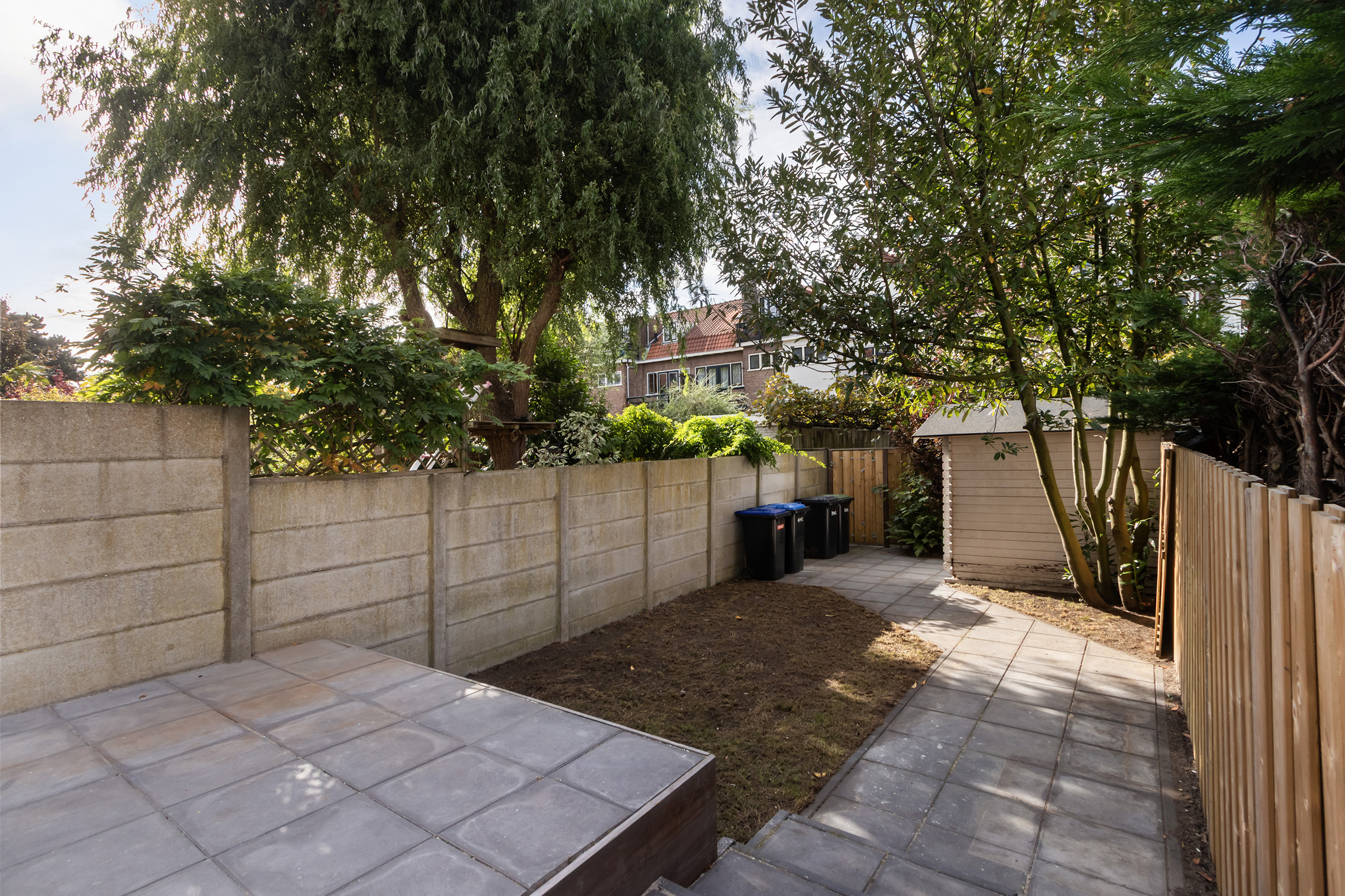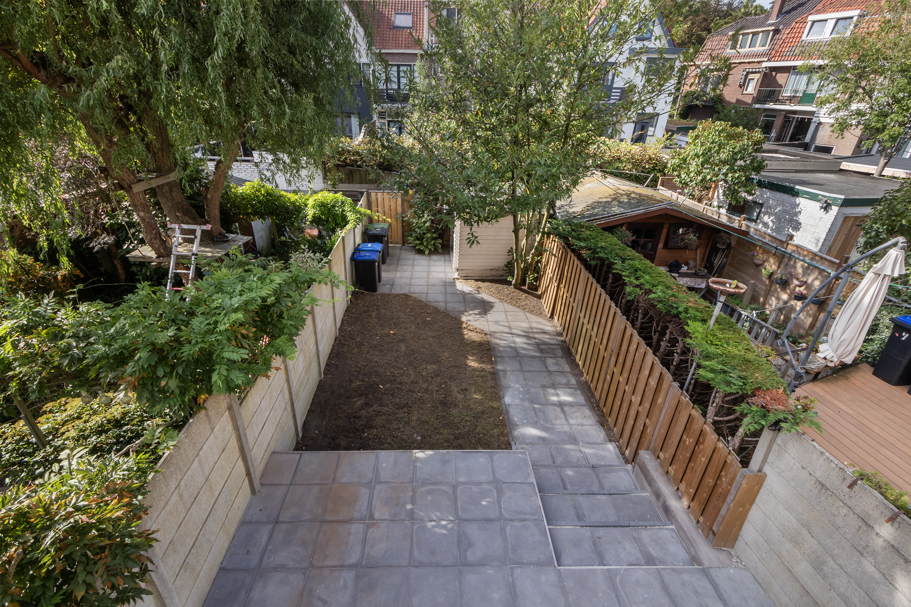 De achtertuin is een echte blikvanger. Met een diepte van maar liefst ca. 14 meter en een ligging op het zuidwesten is het hier heerlijk genieten van de middag en avondzon. Achter in de tuin staat een houten berging die ideaal is voor het stallen van fietsen.