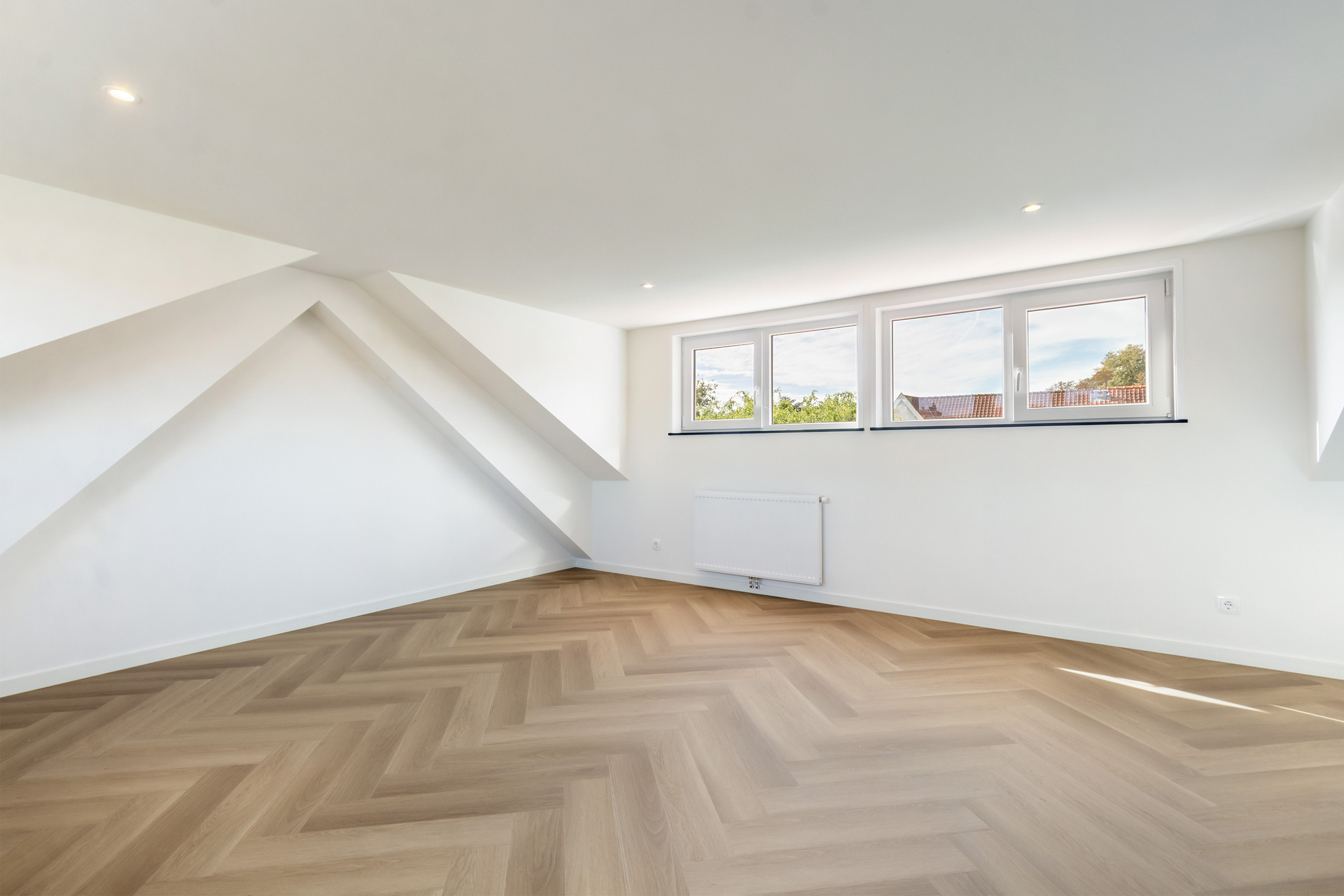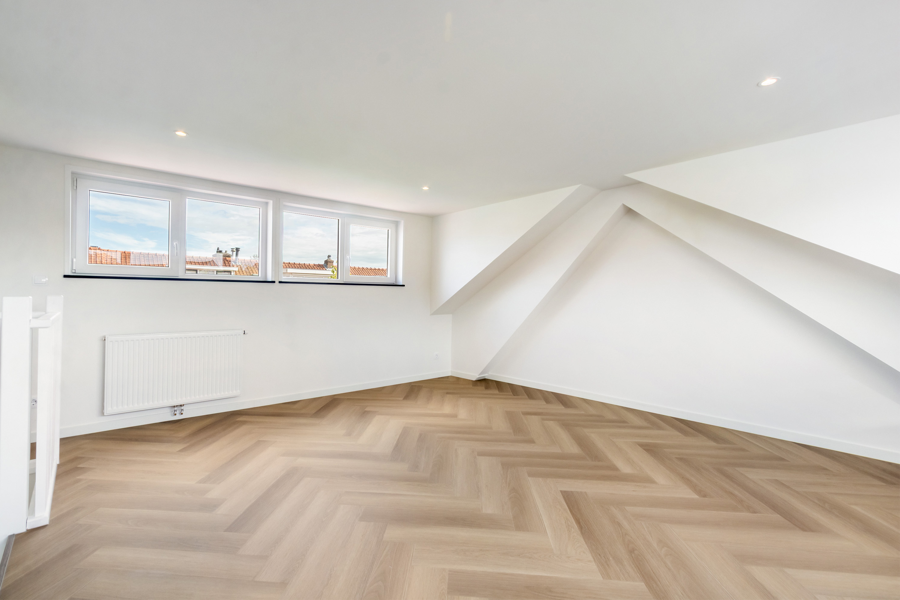 - Tweede verdieping: glad gestucte wandafwerking, wit gesausd. Pvc visgraat vloerafwerking.