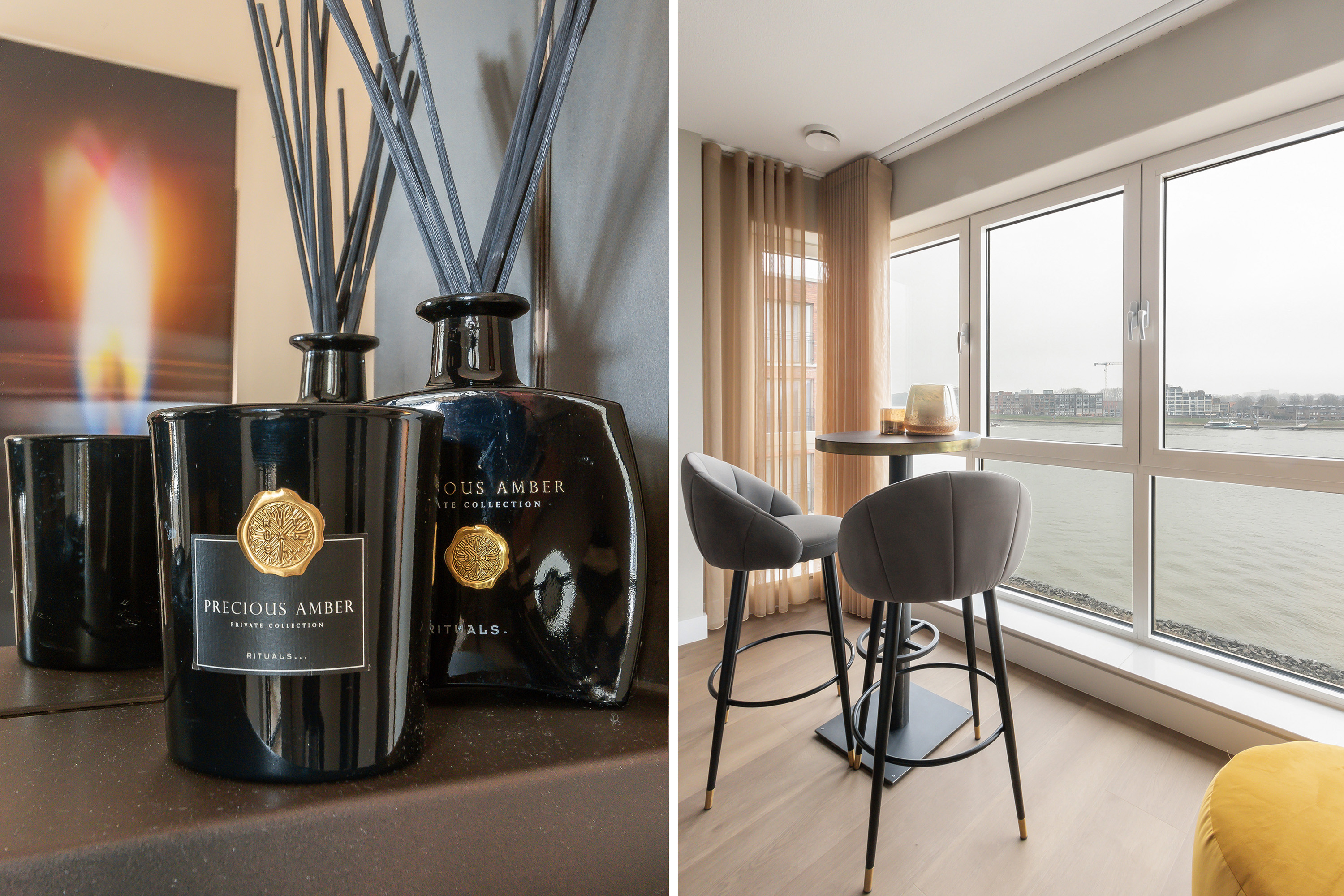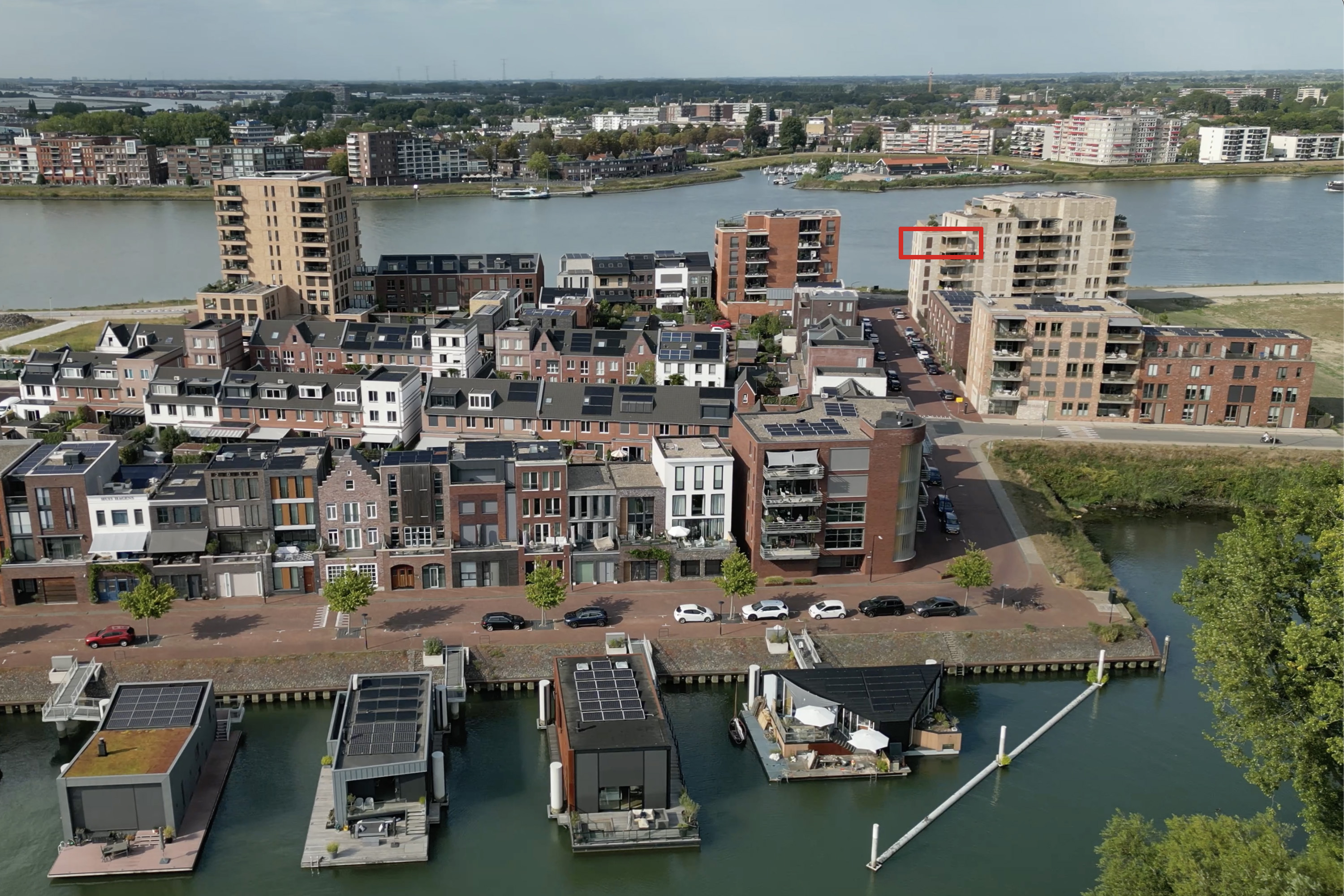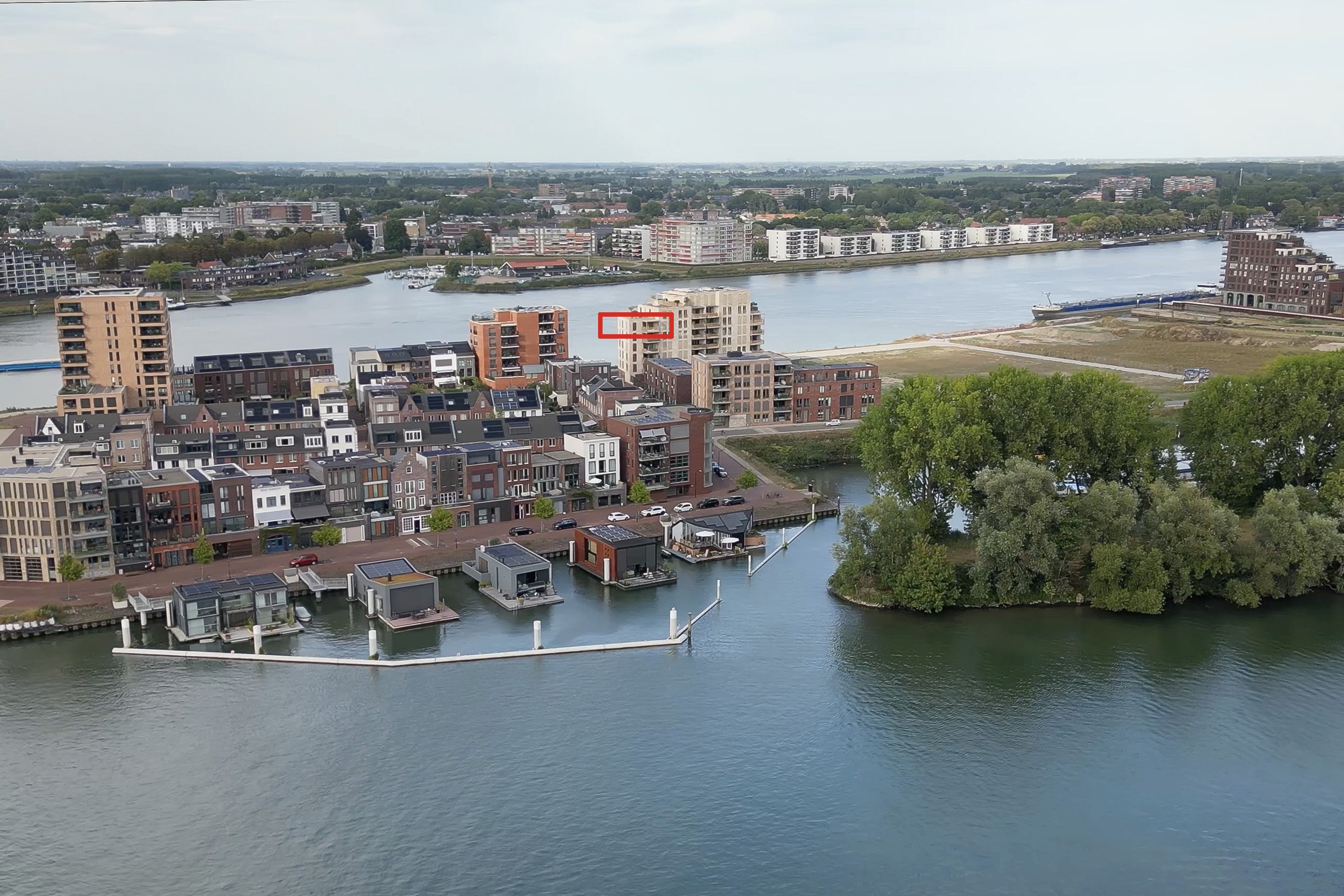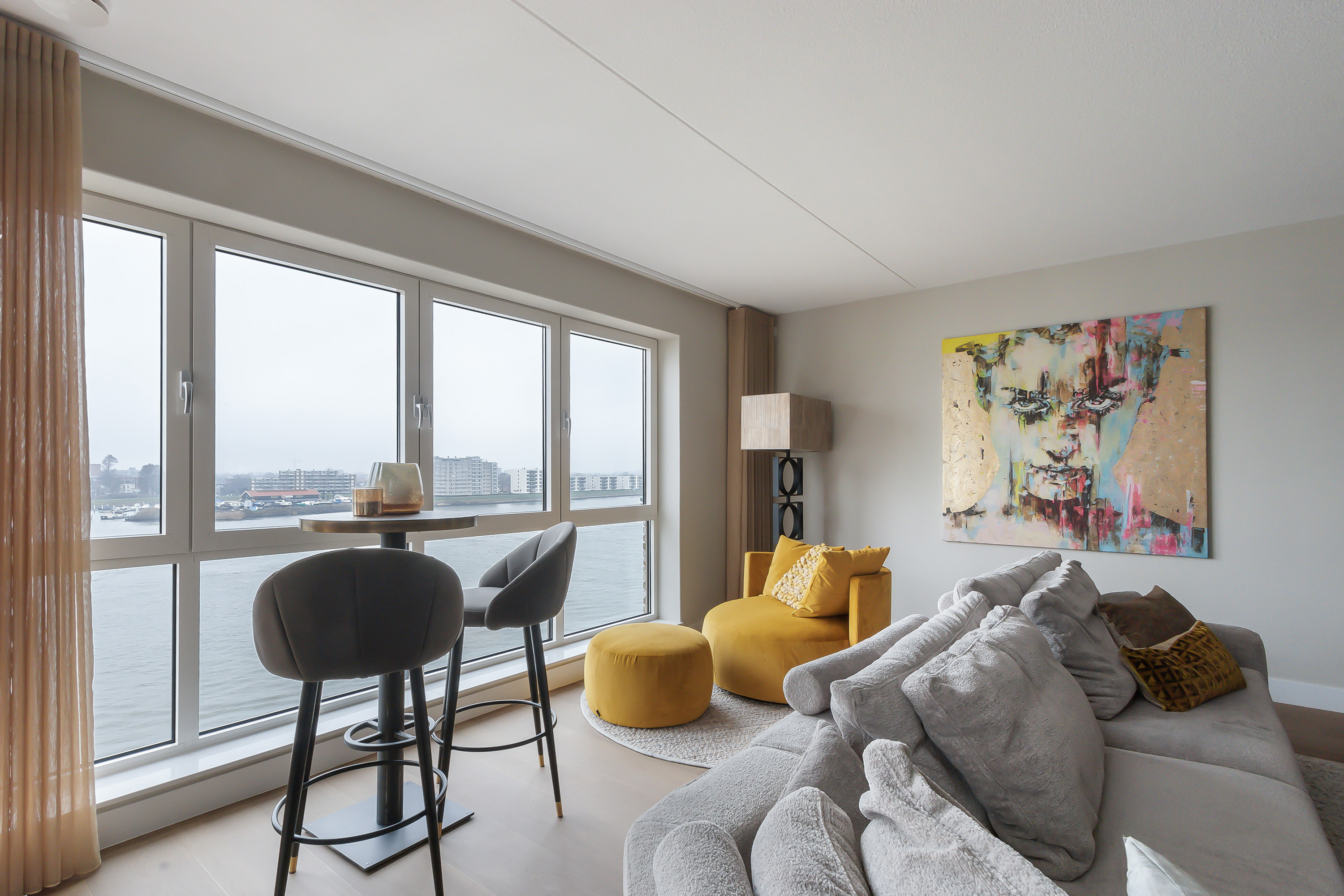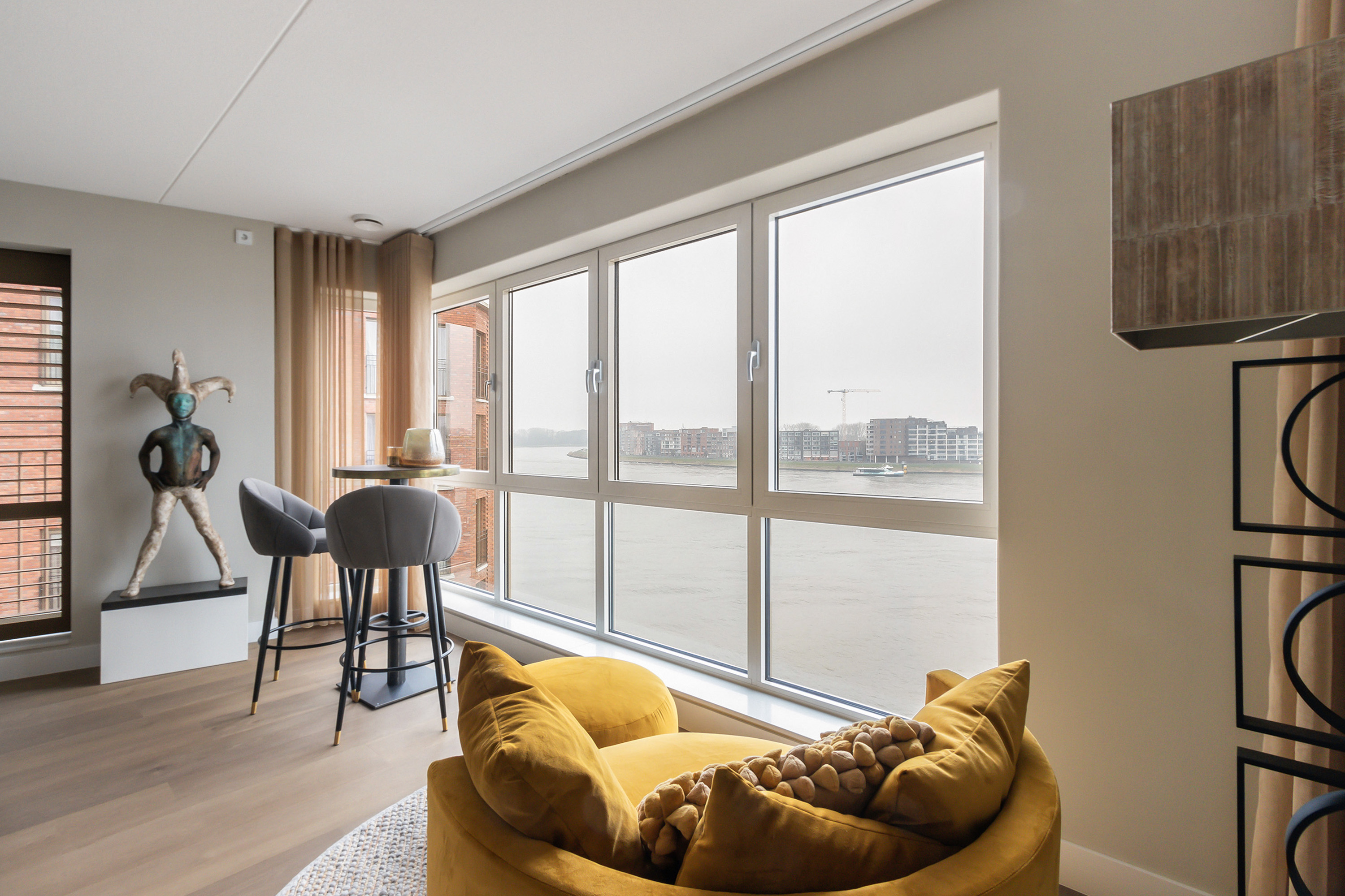 Heel bijzonder is dat in dit appartement twee werelden samenkomen, namelijk enerzijds het altijd dynamische en boeiende uitzicht op de rivier (Beneden Merwede) vanuit de woonkamer en anderzijds het zicht op de directe omgeving en de stad vanuit de leef keuken met o.a. de Molen aan de Noordendijk, villa Augustus, de Grote Kerk en de Zwijndrechtse brug. Vanaf het balkon is er een speelse doorkijk op het drie-rivierenpunt (Beneden Merwede, Noord en Oude Maas).