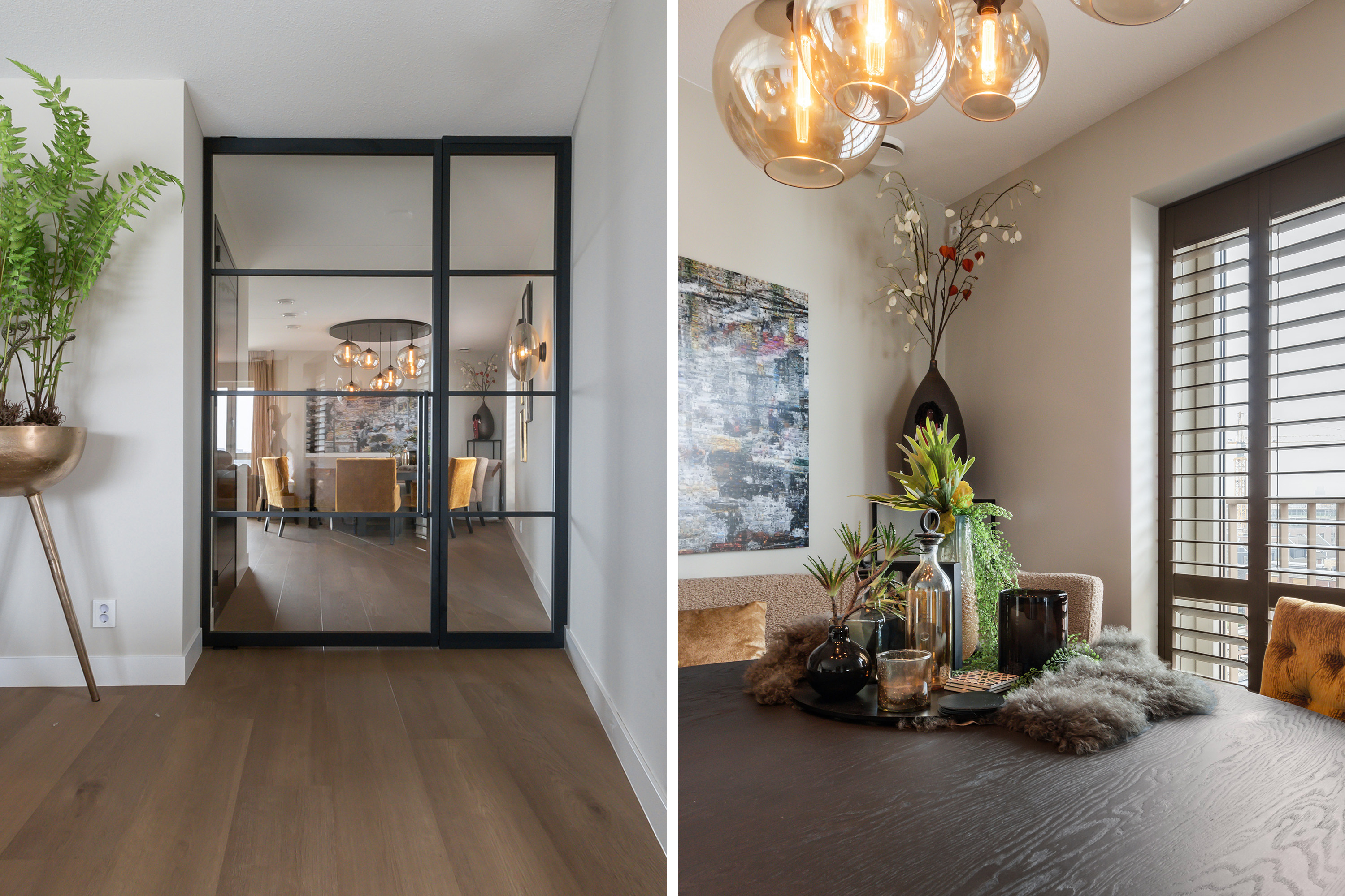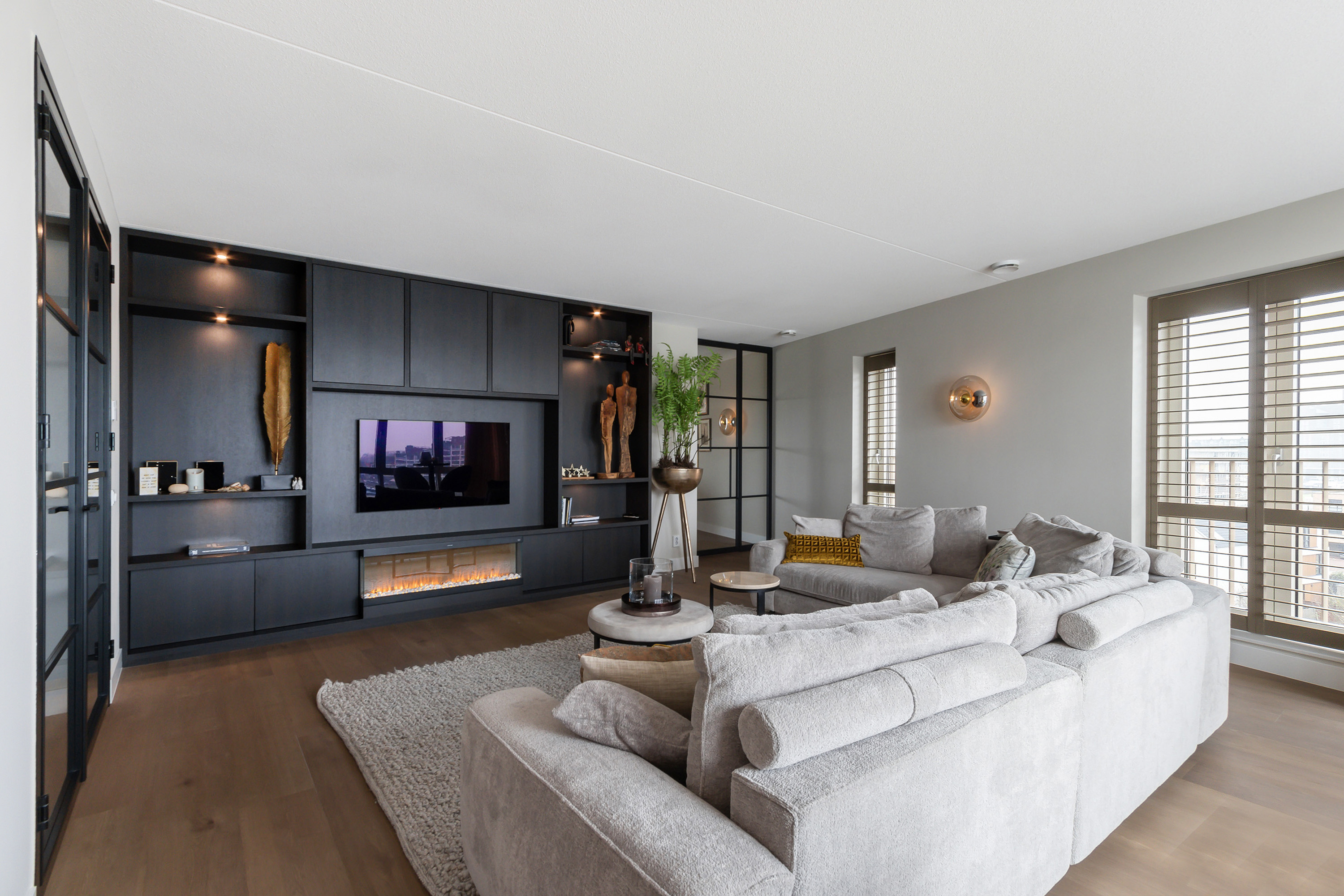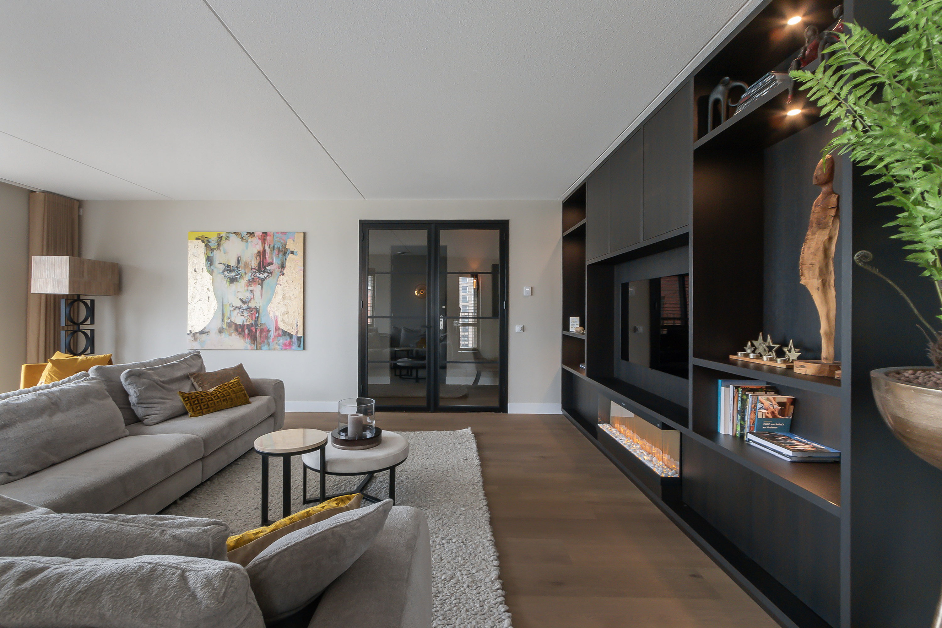 - Woonkamer met dubbele stalen deur vanuit de gang, een schitterend uitzicht op rivier de Beneden Merwede, een mooie op maat gemaakte kastenwand inclusief sfeervolle elektrische sierhaard, dubbele stalen deur als afscheiding met de leef keuken en de doorloop hiervoor ;