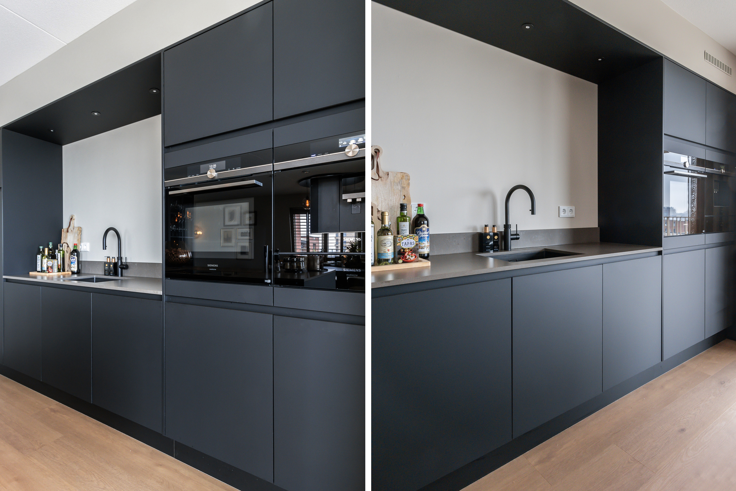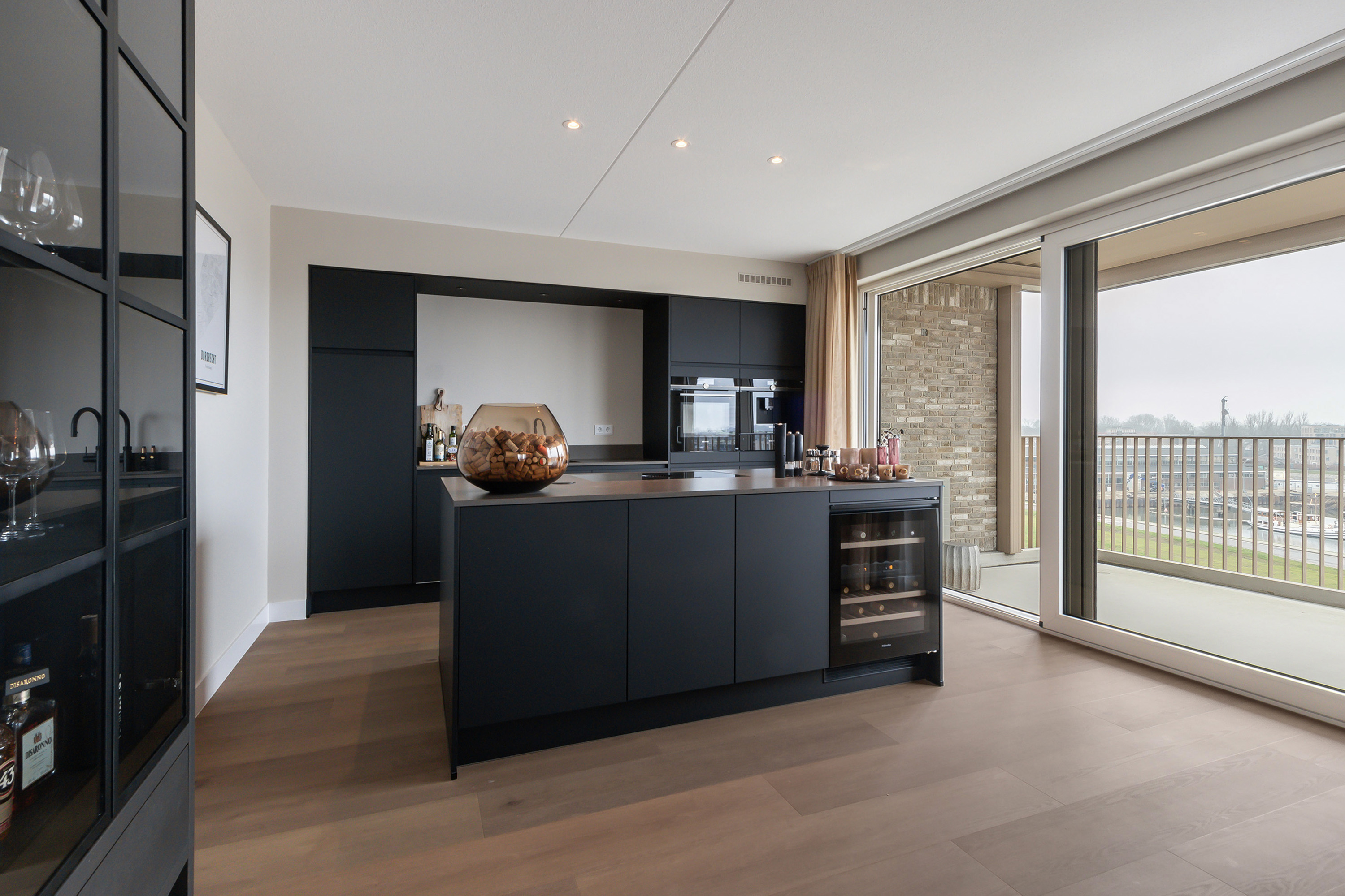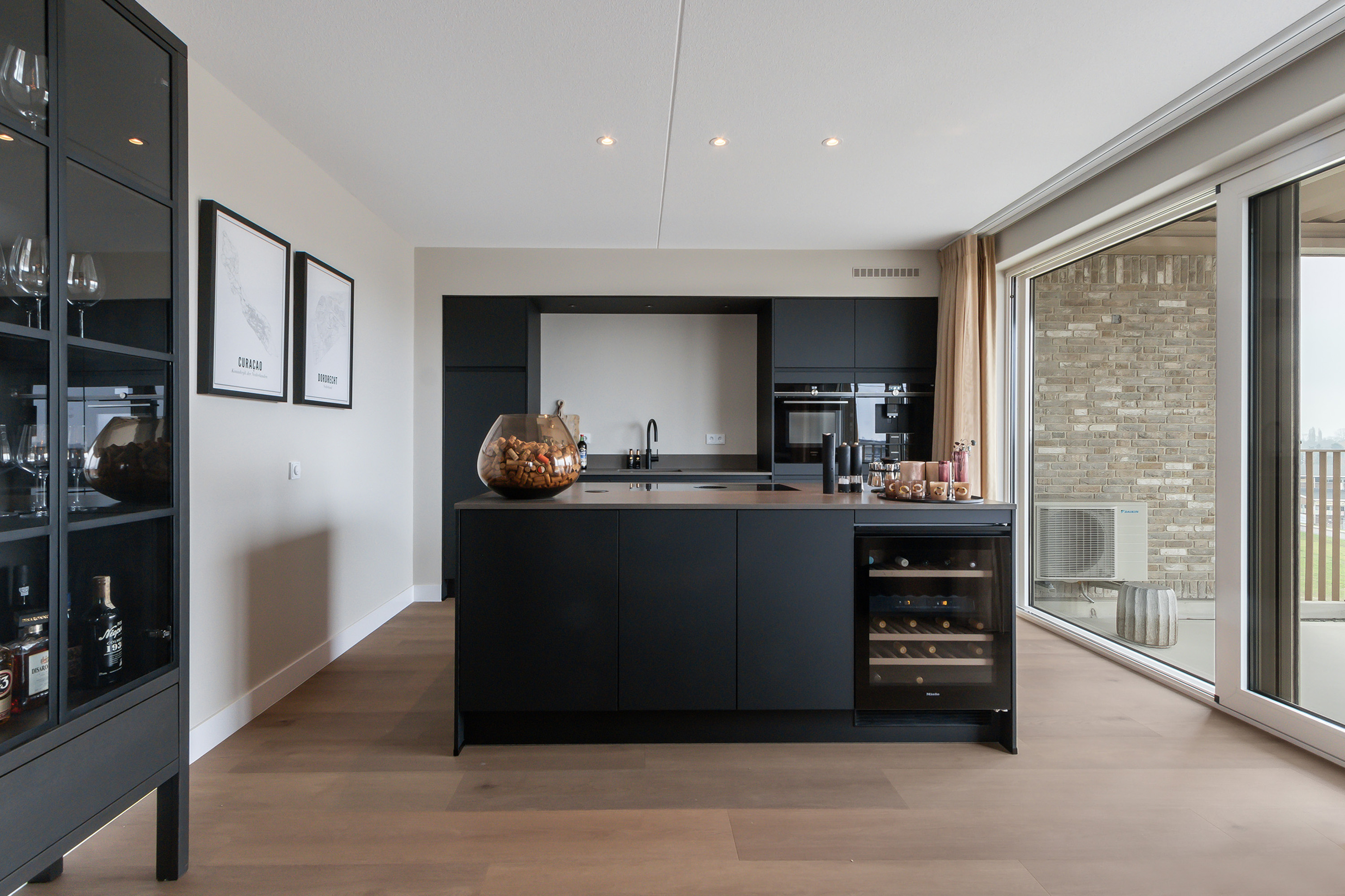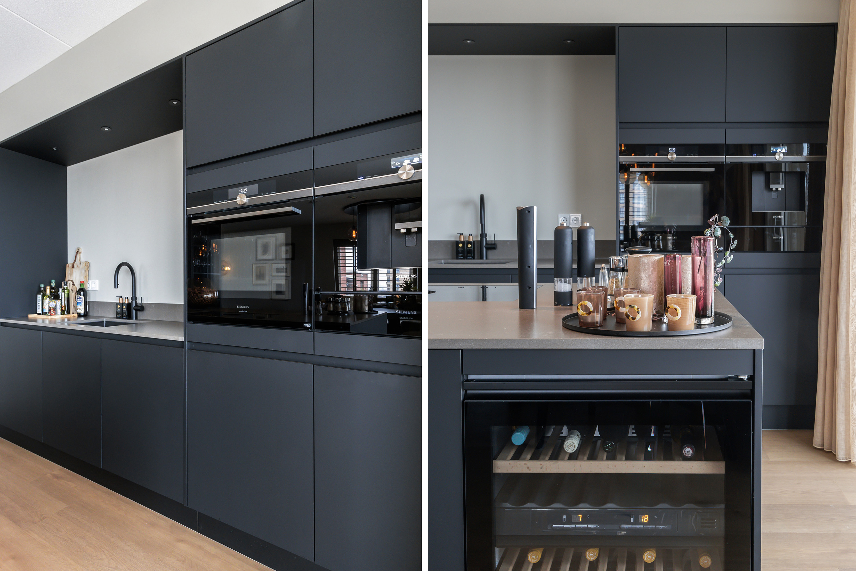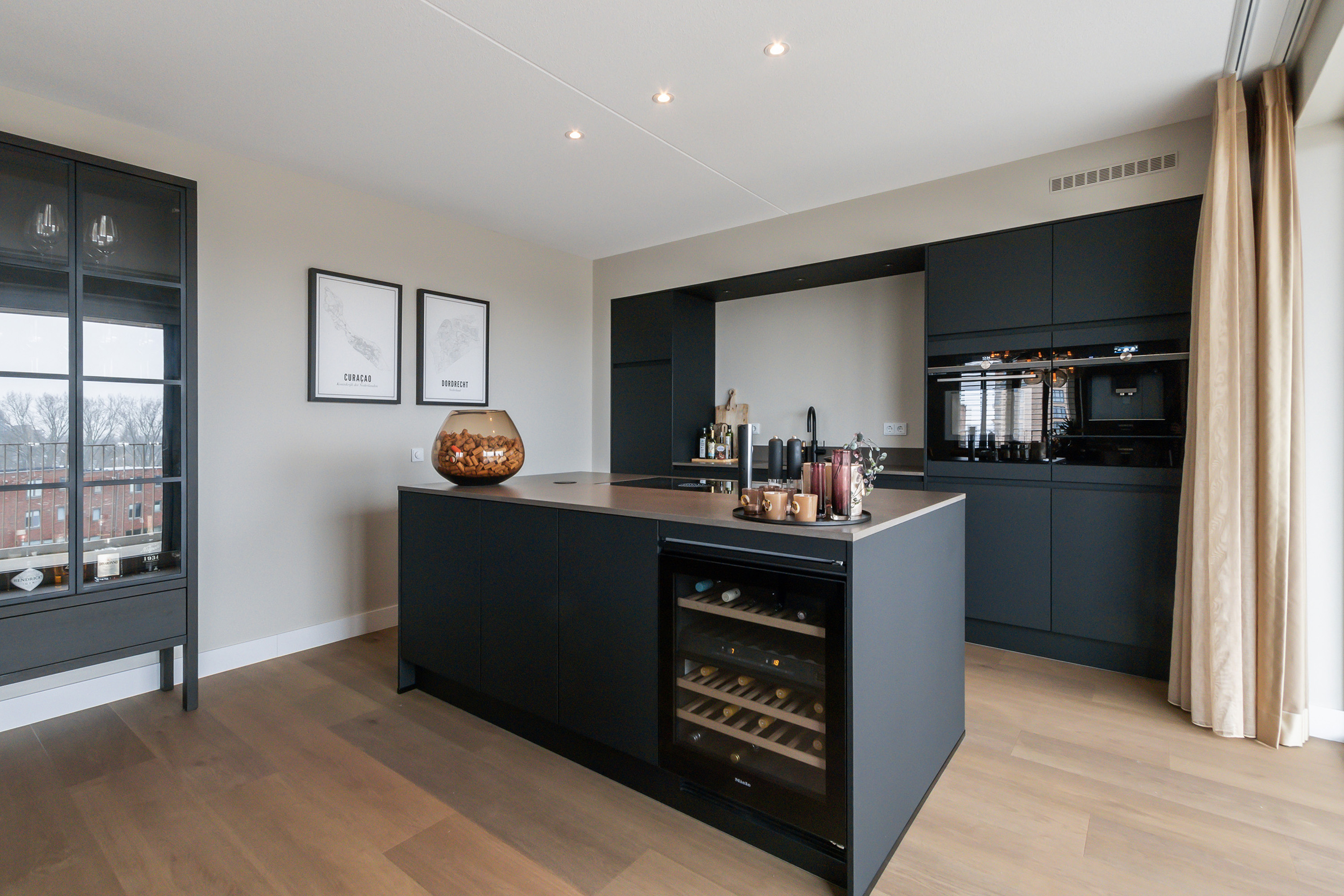 - Een hele prettige leef keuken met aluminium schuifpui naar het balkon en een luxe keukenopstelling met 2 secties in chique zwarte kleurstelling (wandopstelling en een kookeiland van ca. 1.20 x 2.14 m.) met o.a. composiet werkbladen (met geïntegreerde stroomaansluiting t.p.v. het kookeiland), een enkele spoelbak, een Quooker kraan, veel kastruimte en laden, apparatuur (Siemens Studio Line, m.u.v. de Bora inductiekookplaat): inductiekookplaat met geïntegreerde afzuiging, een vaatwasser, een koelkast, een vriezer, een oven, een koffiezet machine, een warmhoud lade en een wijnklimaatkast;