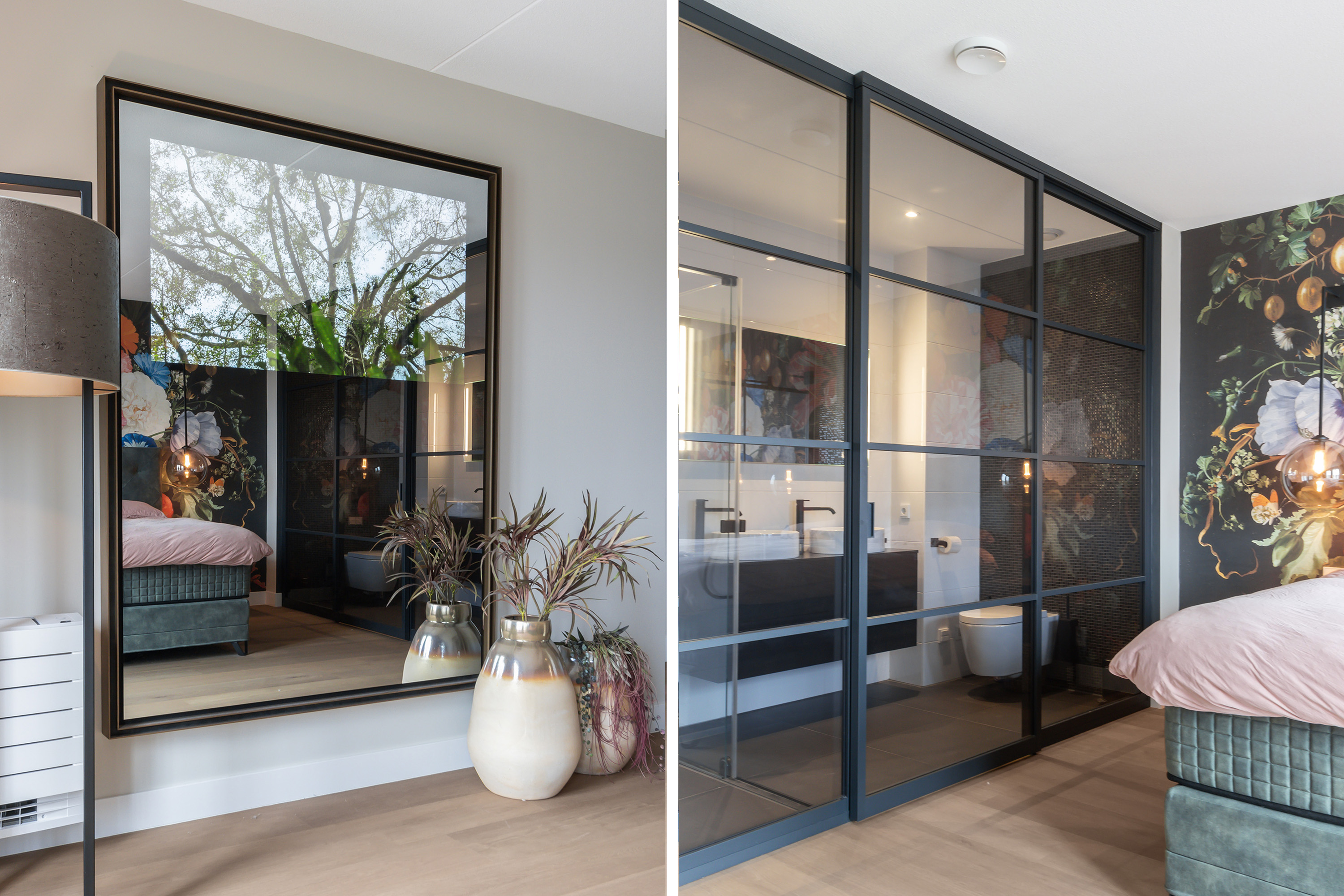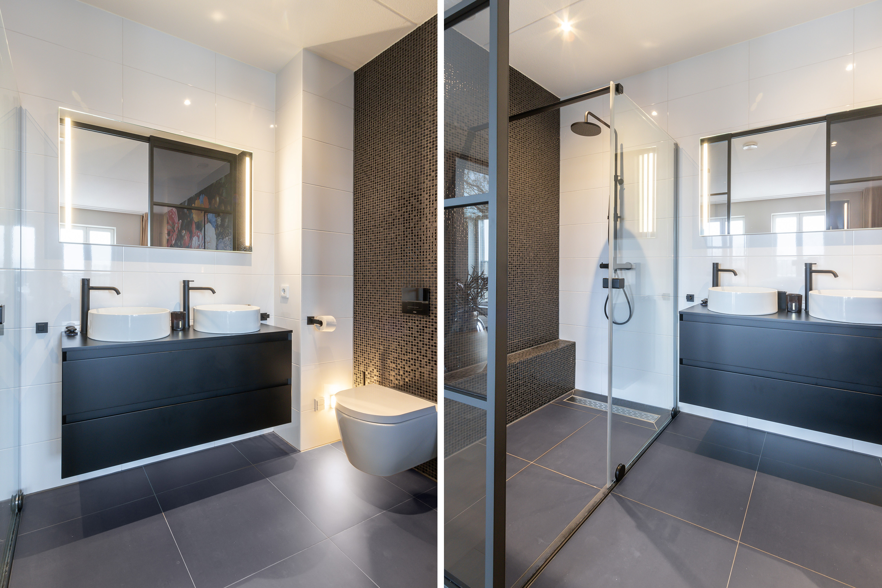 - Een fraaie en praktische badkamer-en-suite met een stalen schuifdeur, geheel betegelde wanden, een tegelvloer, wit sanitair, een wastafelmeubel met 2 waskommen en een spiegelcombinatie, een royale inloopdouche met hardglazen scherm en een speelse met mozaïek betegelde achterwand en een hangcloset;