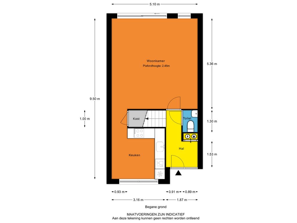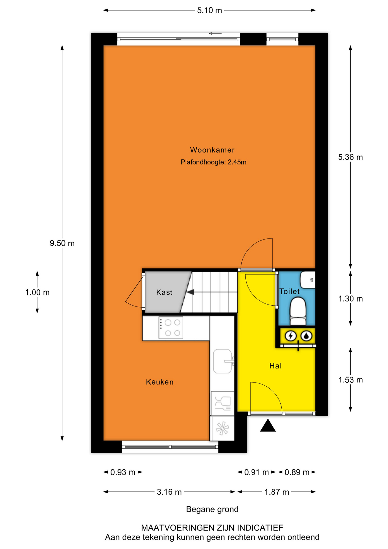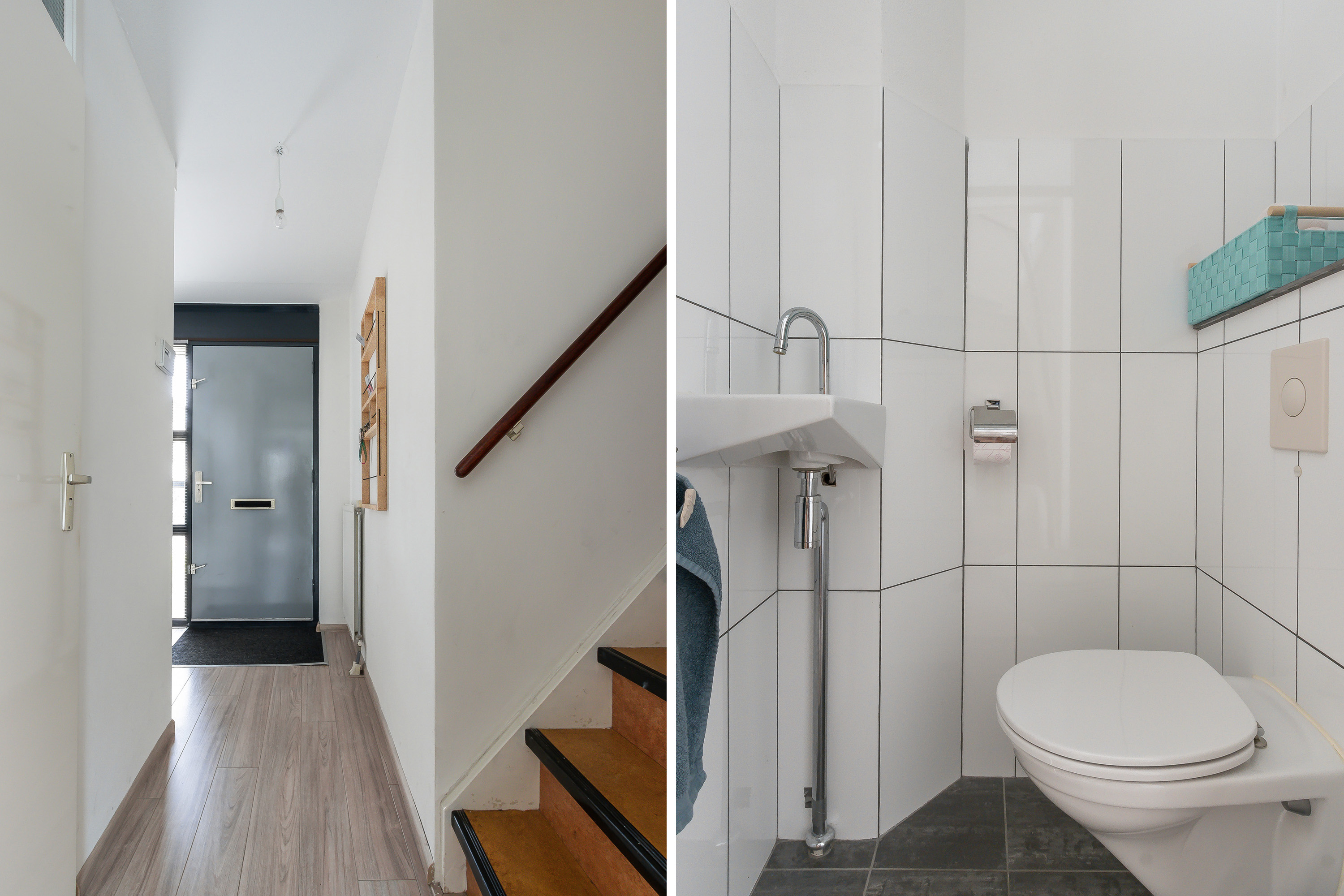 - Entree, hal, meterkast, toilet, trap naar 1e verdieping en deur naar de woonkamer;
