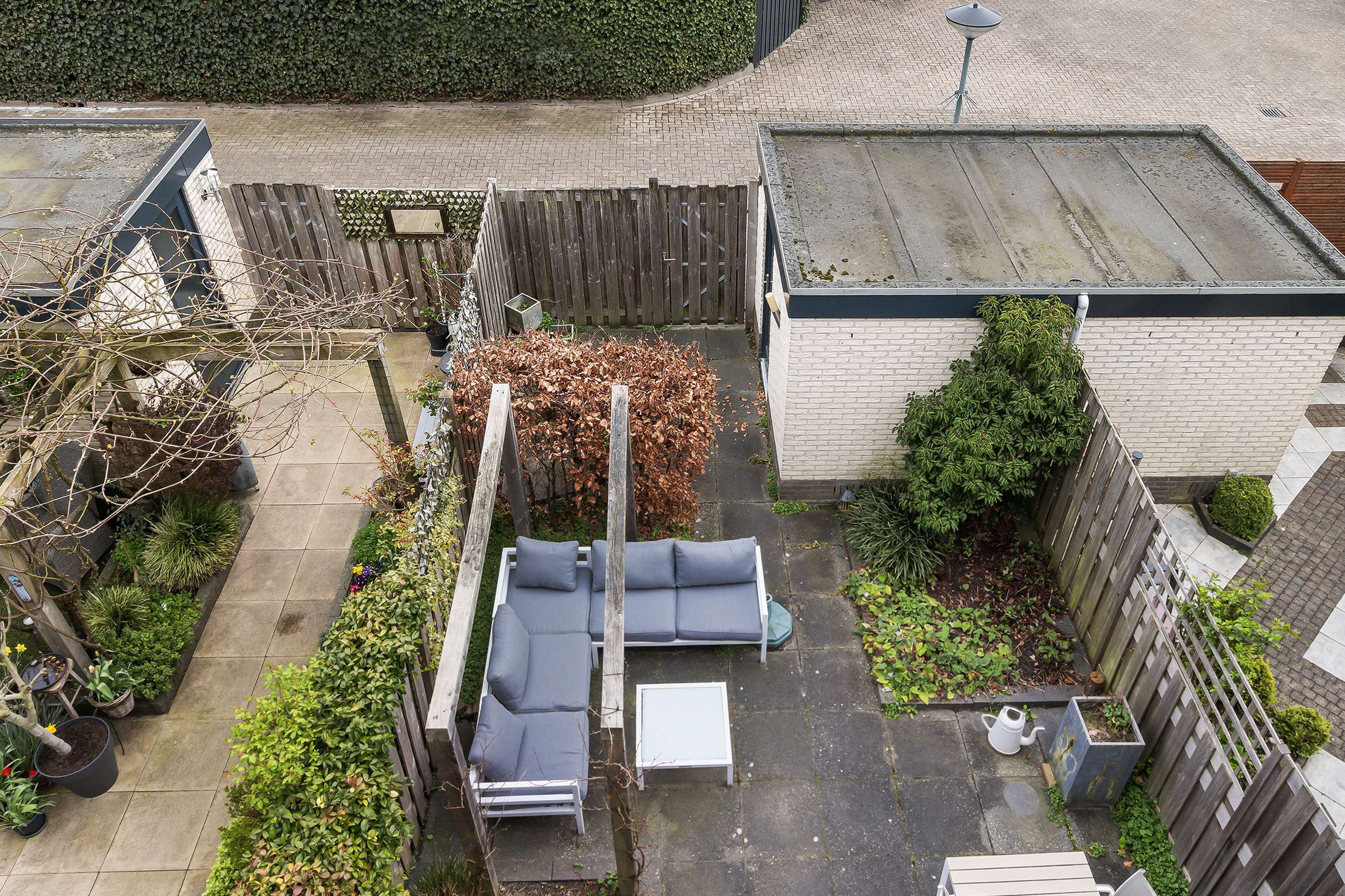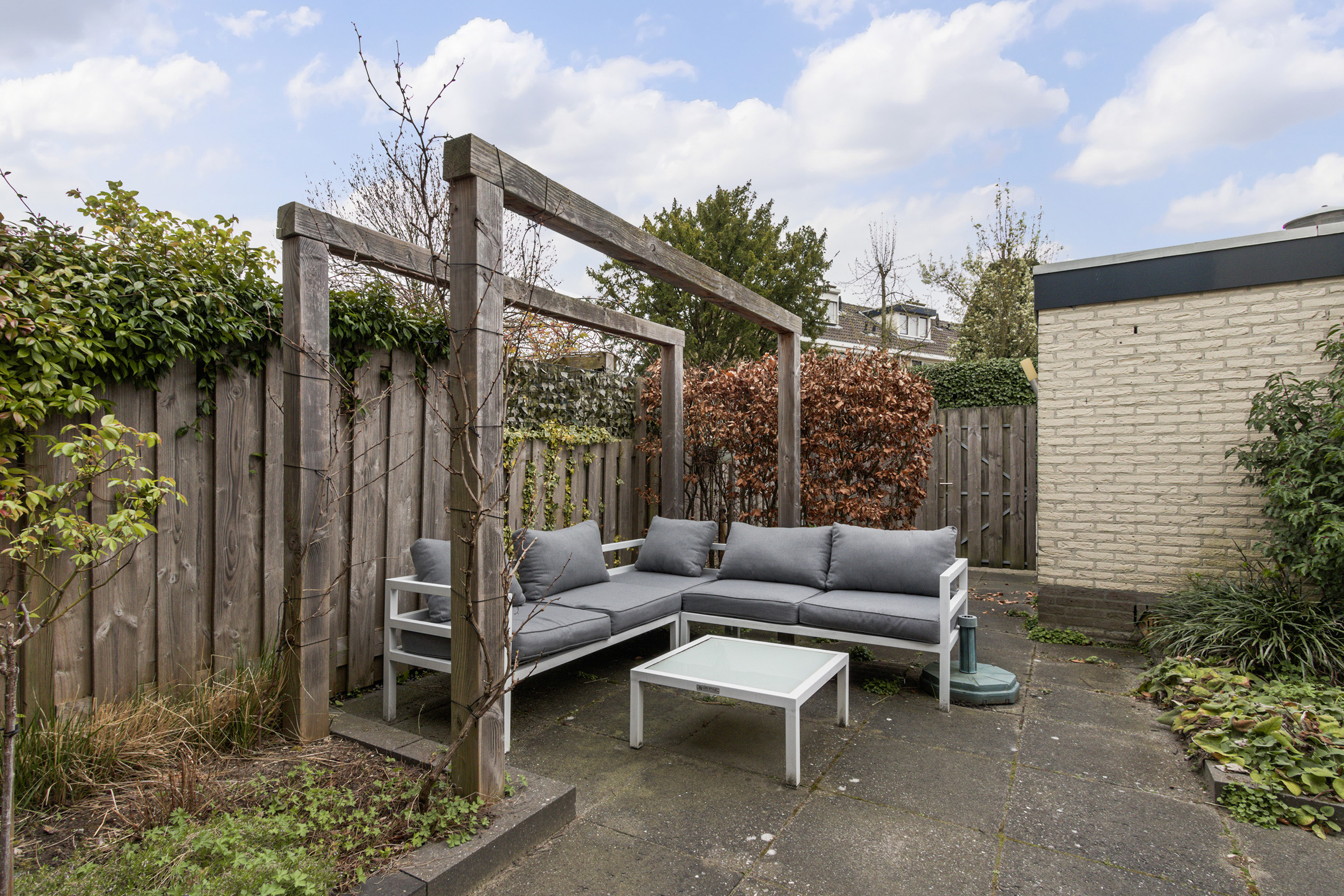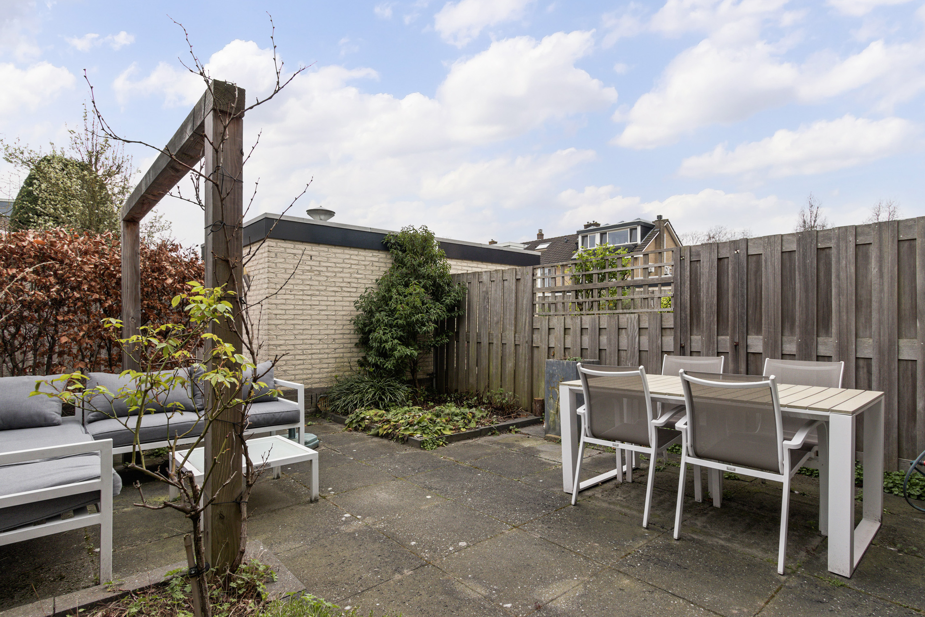 - Achtertuin: gesitueerd op het zuiden, omheind met achterom. Aangelegd met sierbestrating. Buitenkraan.