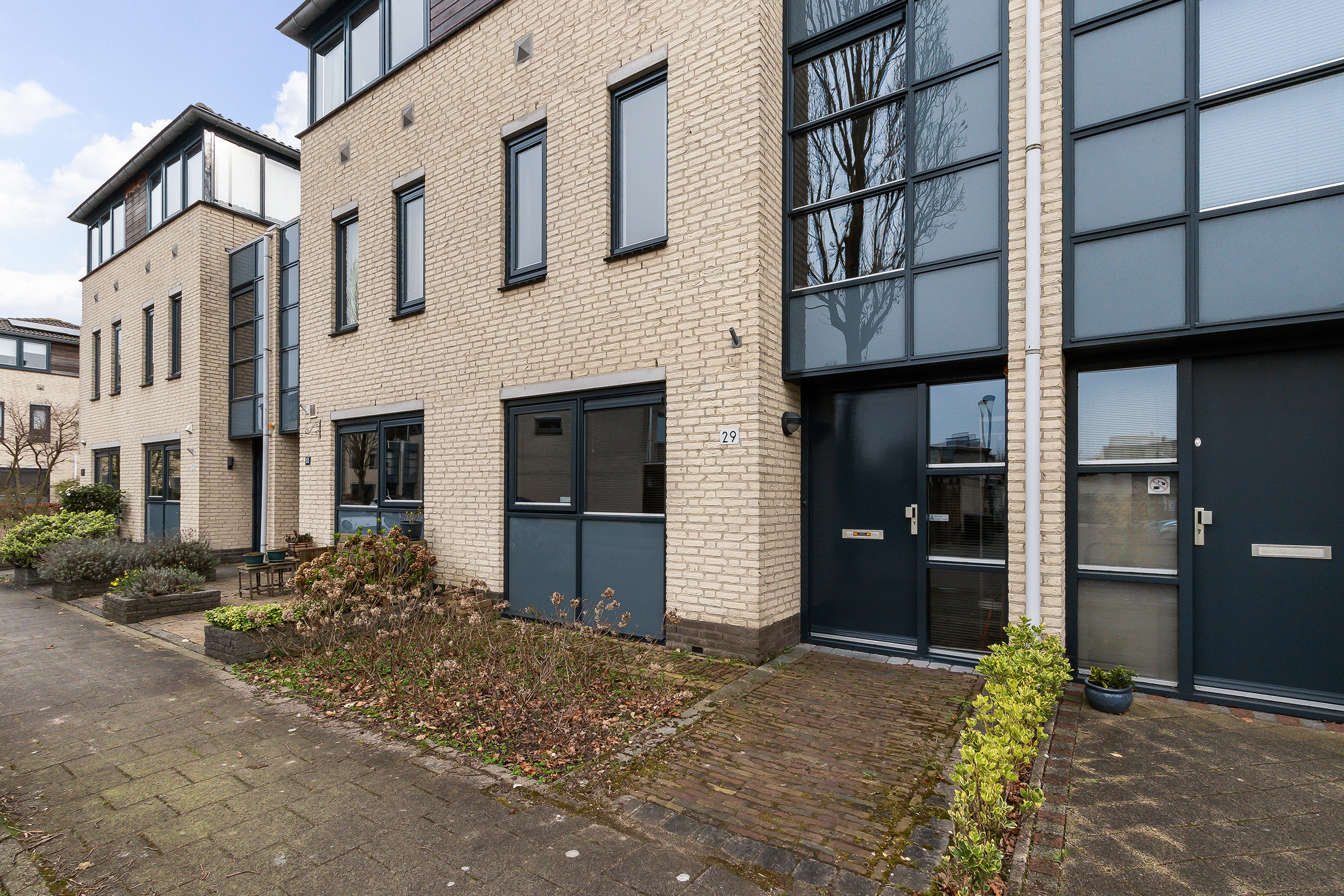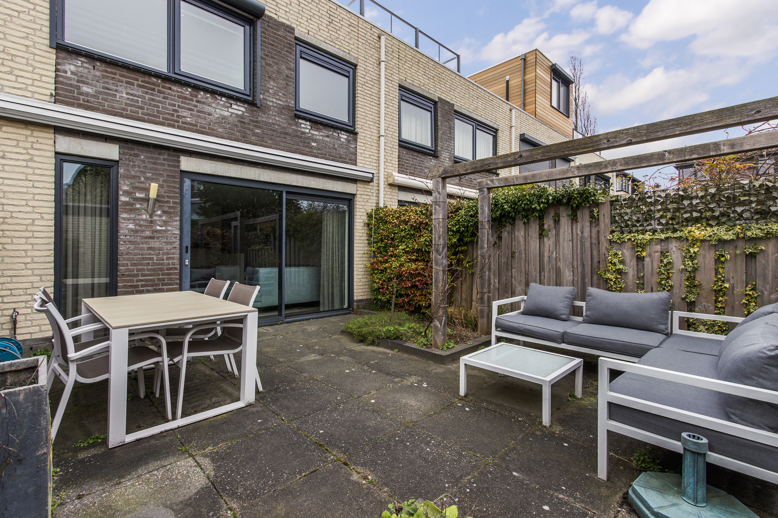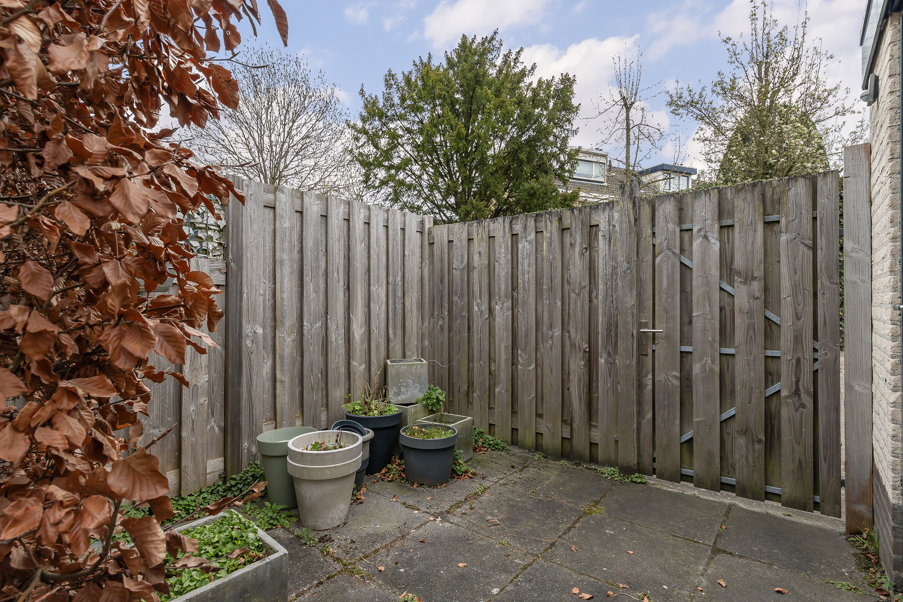 - Achtertuin: gesitueerd op het zuiden, omheind met achterom. Aangelegd met sierbestrating. Buitenkraan.