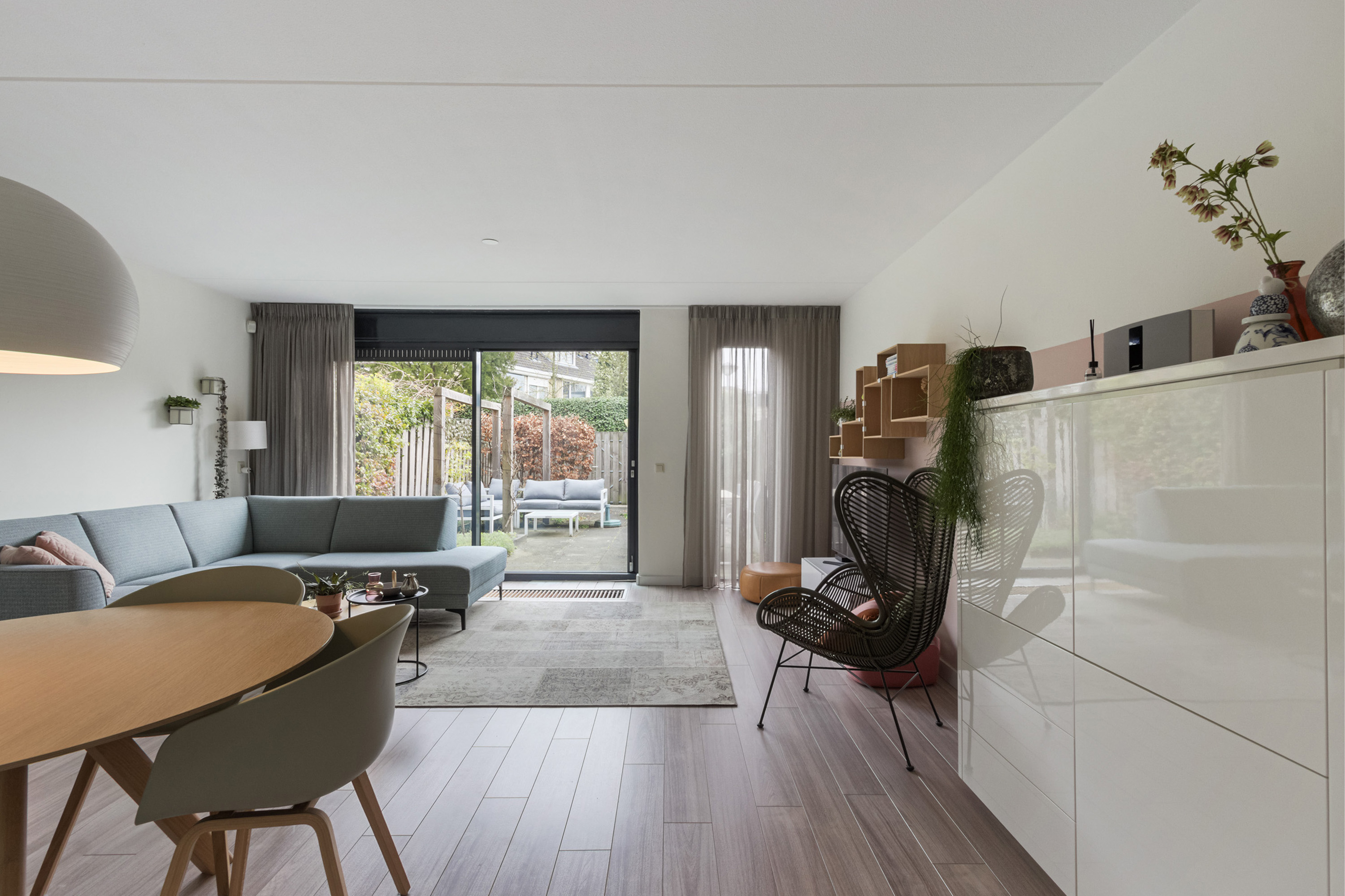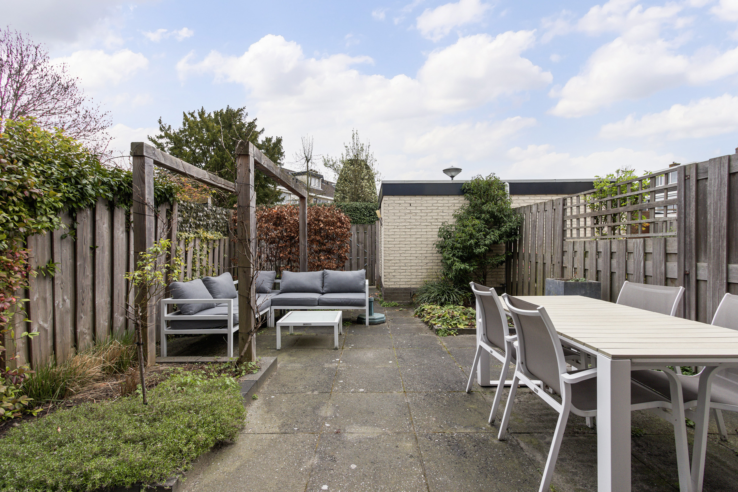 In de achtertuin op het zuiden is het al snel genieten vanaf begin voorjaar tot einde najaar als het weer het toelaat. Zeker vermeldenswaard is nog dat zowel aan de voor - als achterzijde sprake is van voldoende ‘lucht en ruimte’.