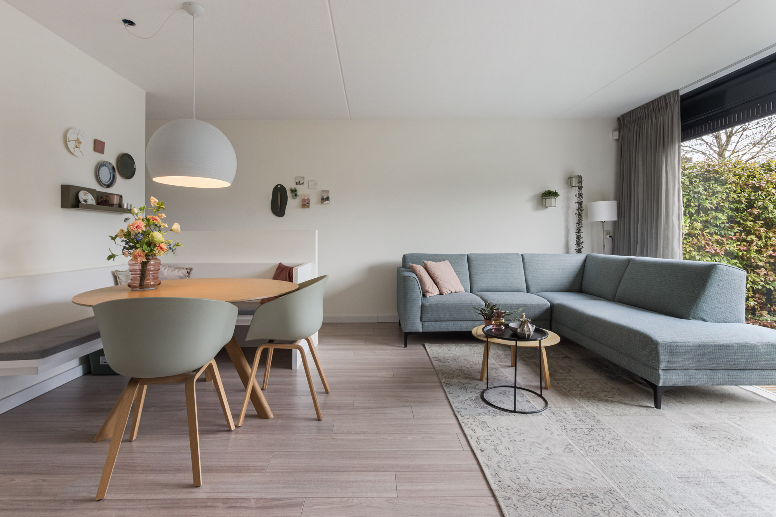 - Begane grond: spachtelputz wandafwerking. Laminaat vloerafwerking i.c.m. Belgische blauw hardsteen in de keuken;