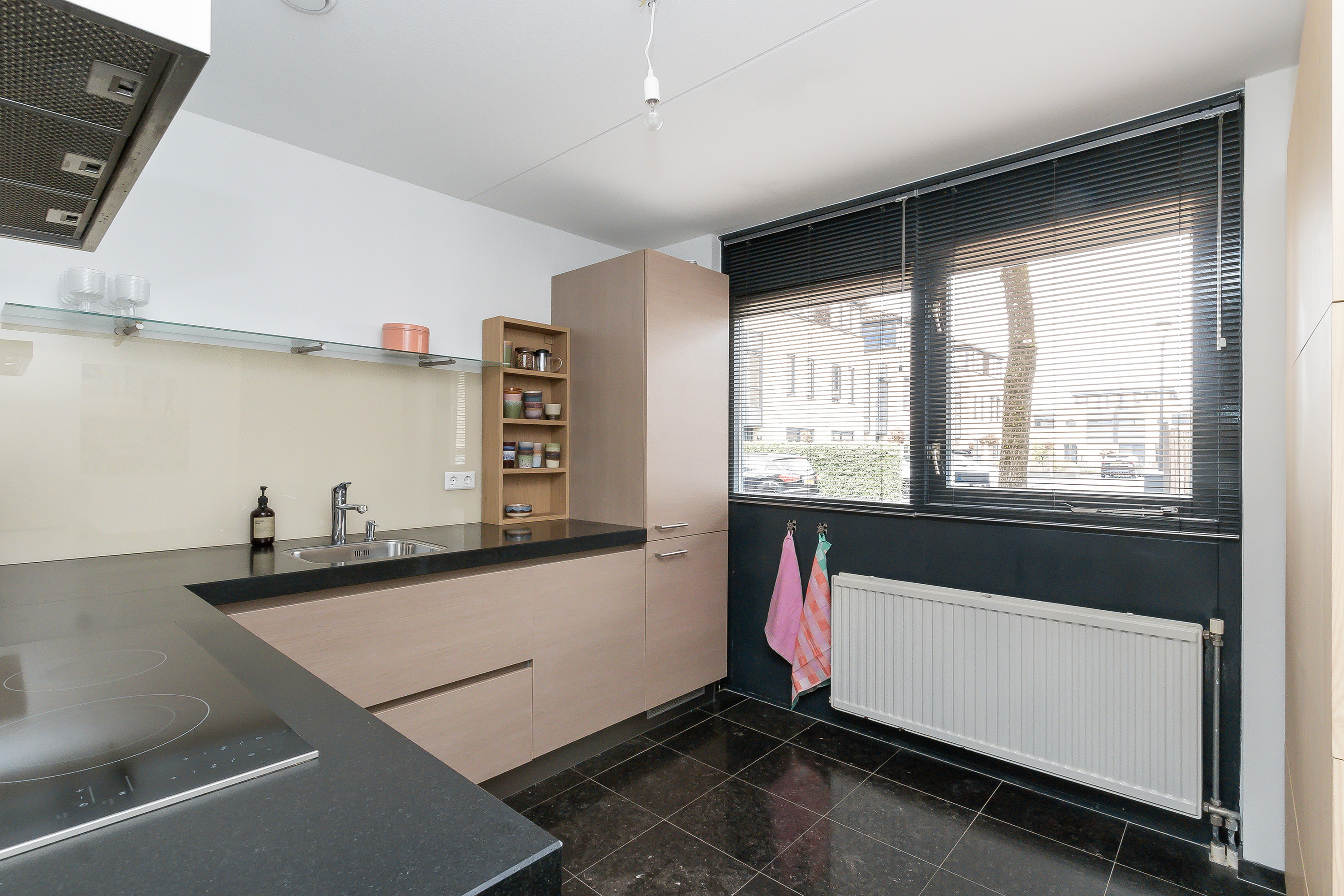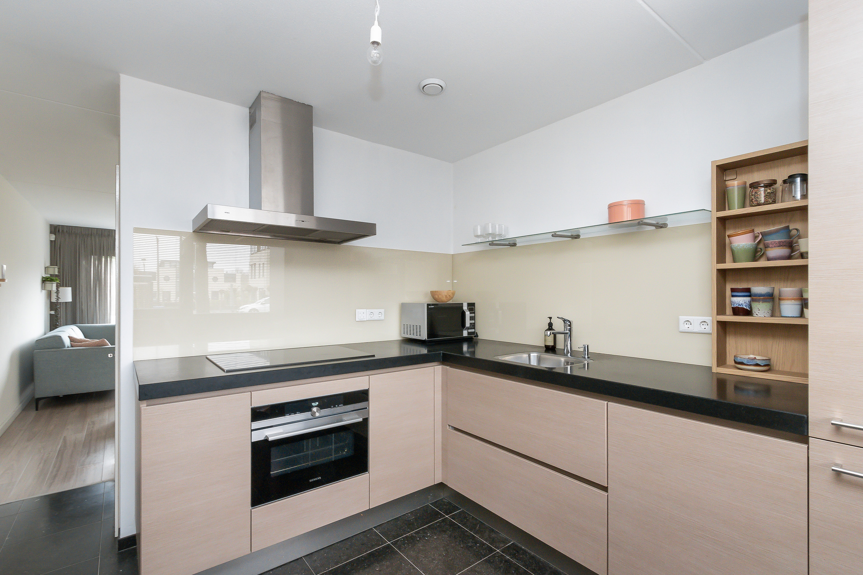 - Half open keuken (Eggesmankeuken) met diverse inbouwapparatuur in hoekopstelling in lichte houtkleurstelling met een kunststof werkblad, een enkele rvs spoelbak, diverse onder - en bovenkasten en laden, inductiekookplaat, een vaatwasser (2019), een oven (2018) en een koel-/ vriescombinatie (2020). Vloer voorzien van Belgische blauw hardsteen.