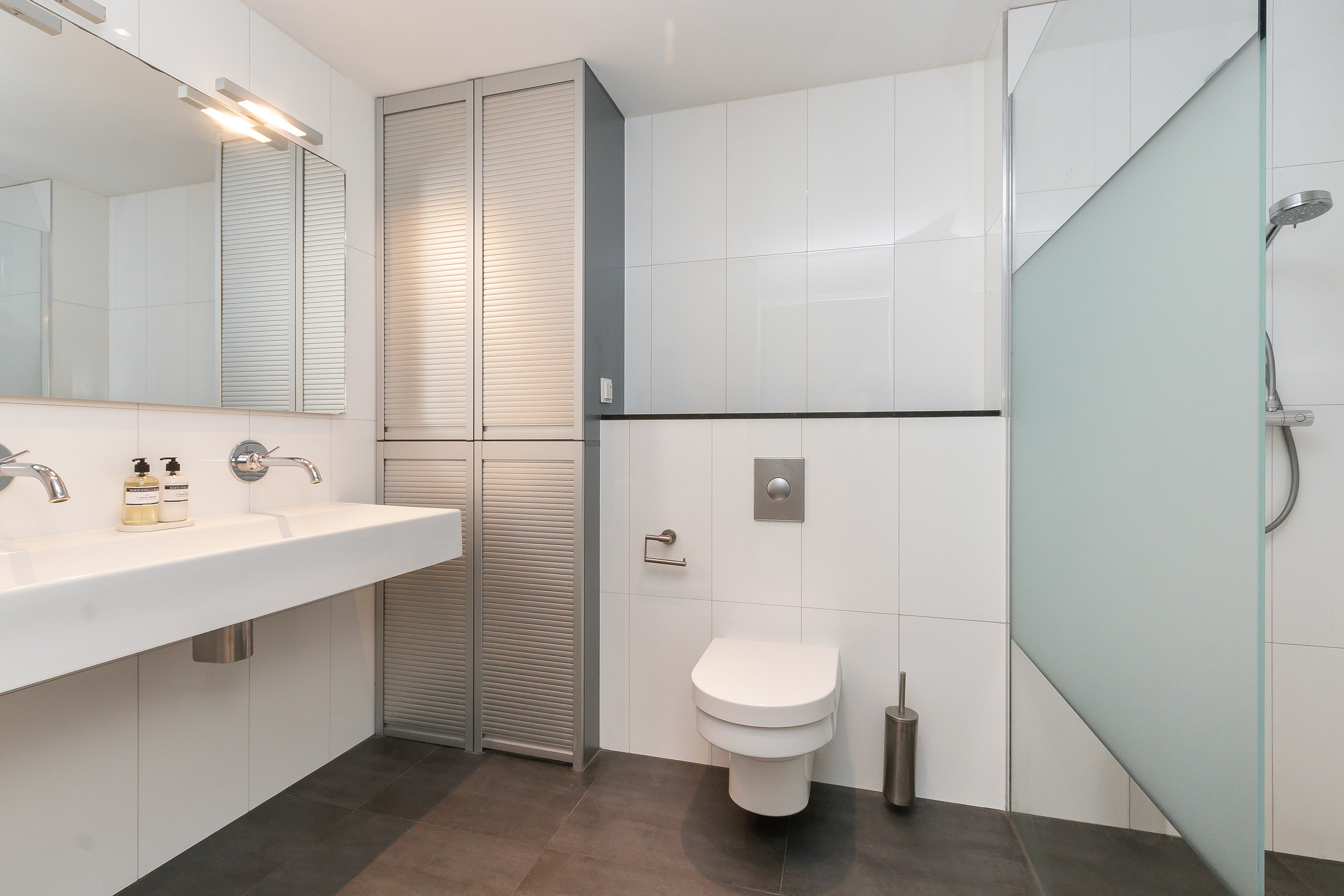 - Badkamer met volledig betegelde wanden, een tegelvloer, wit sanitair, een wastafelmeubel met dubbele kraan, een inloopdouche, designradiator en een toilet.