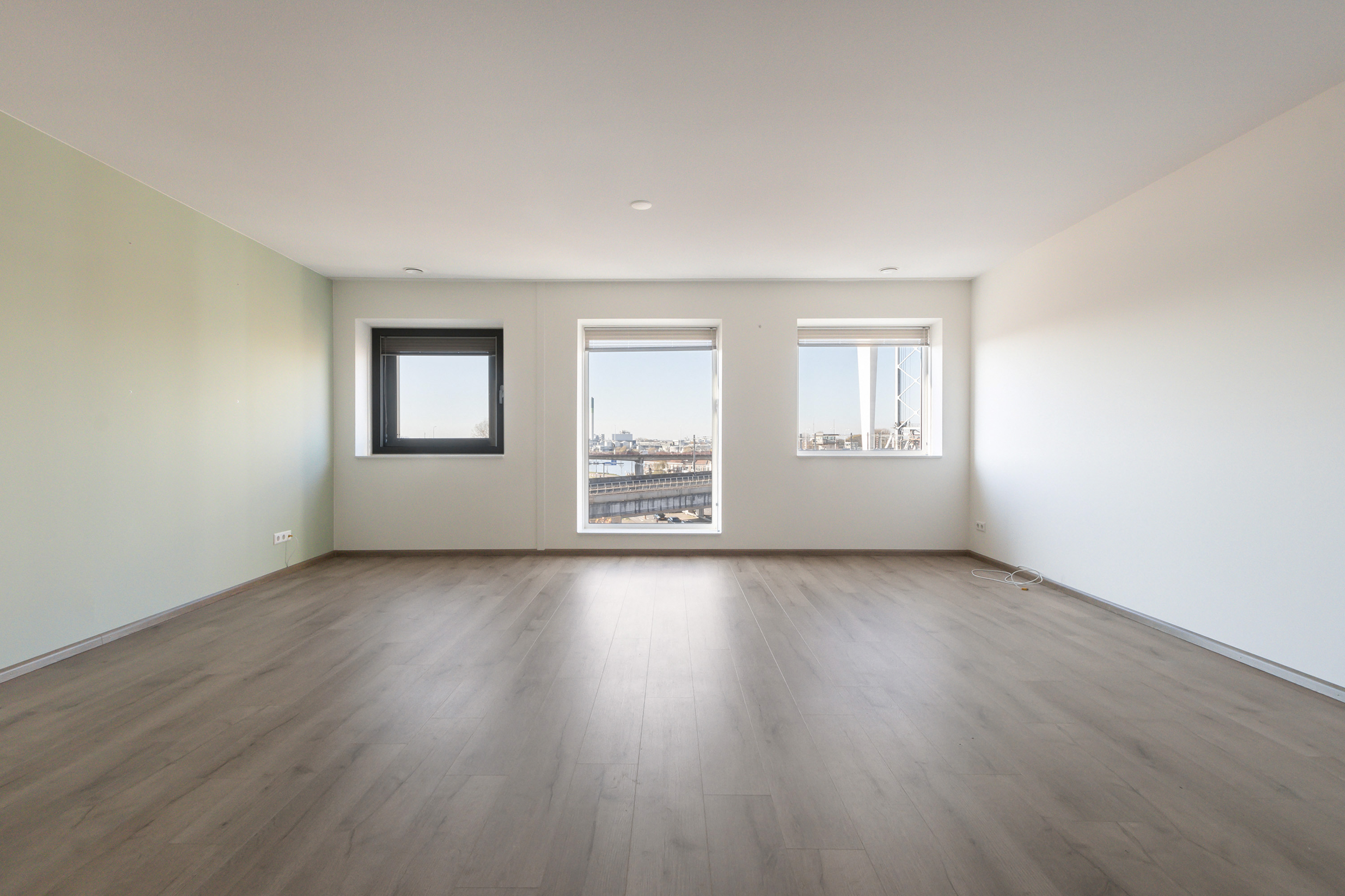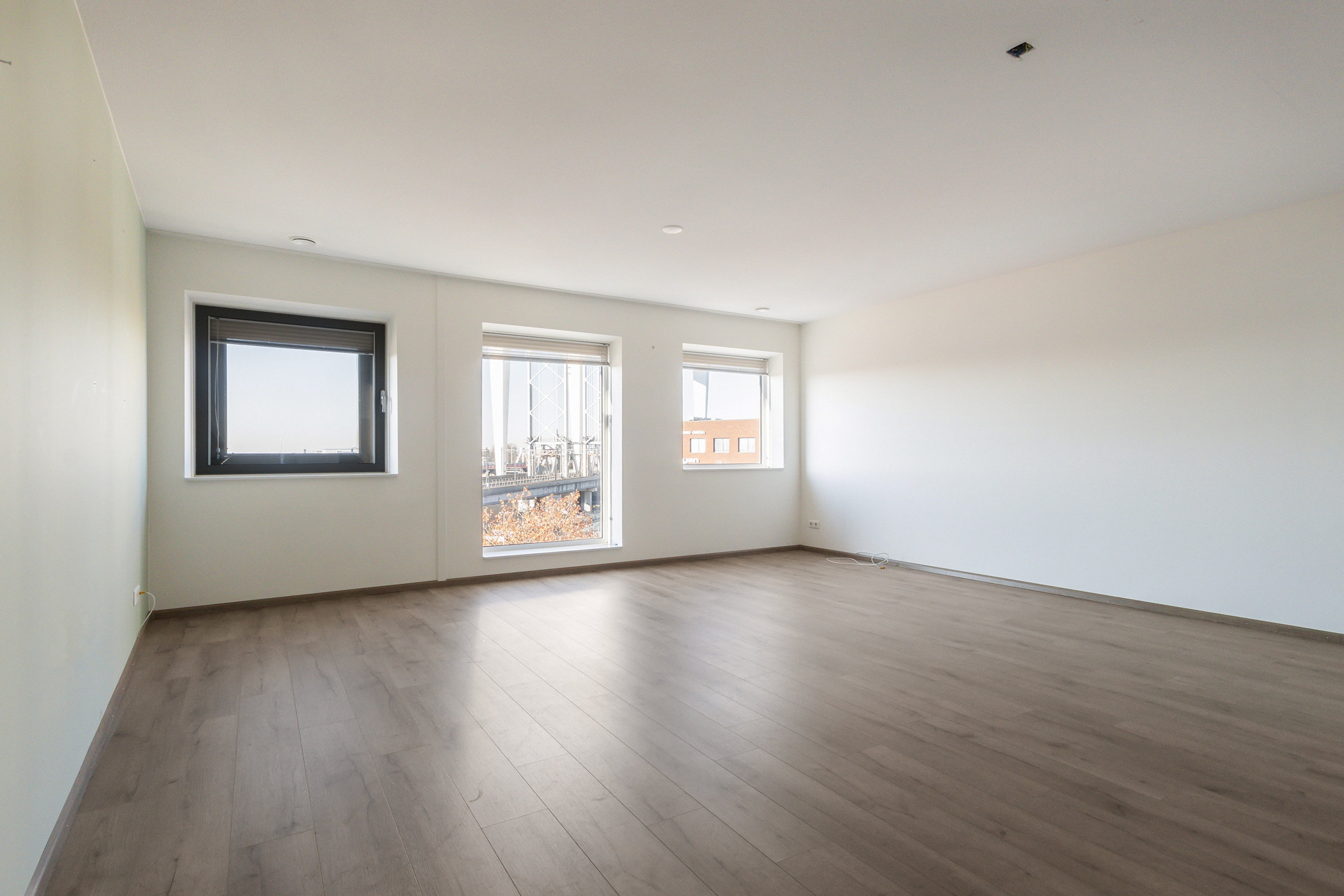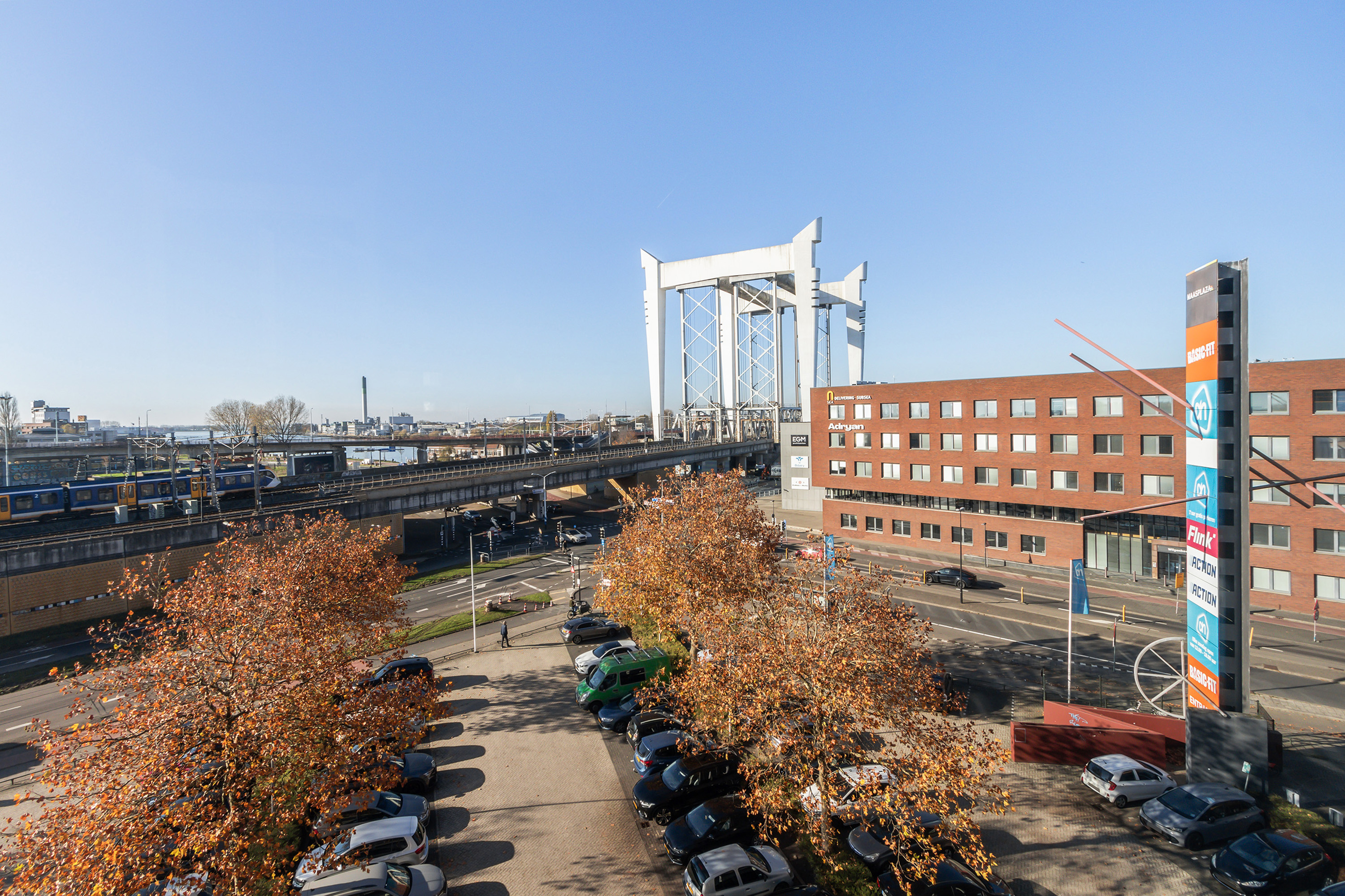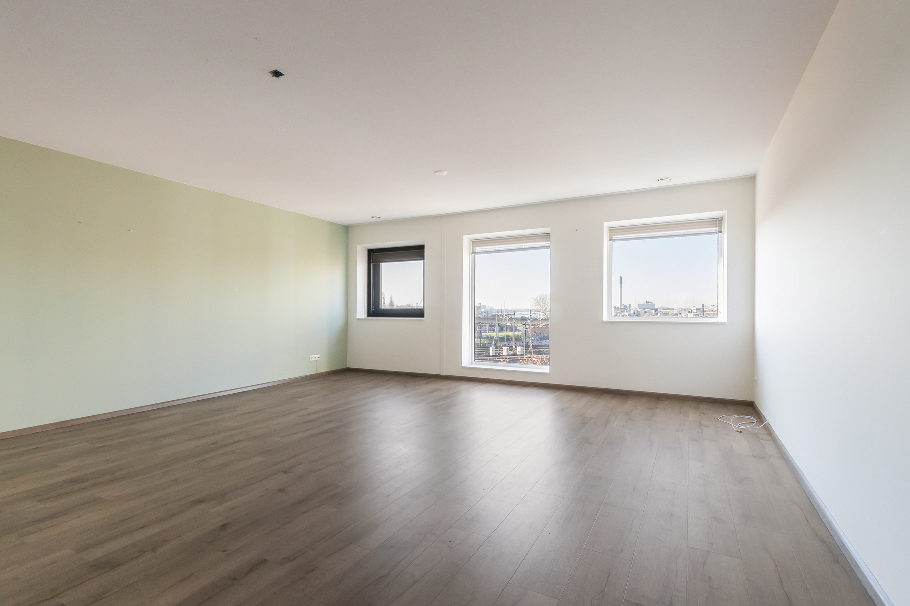 - Woonkamer met open keuken (totaal ca. 36 m²) en uitzicht op de Korte Parallelweg, de spoorbaan en het gemeentelijke parkeerterrein aan de Weeskinderendijk;