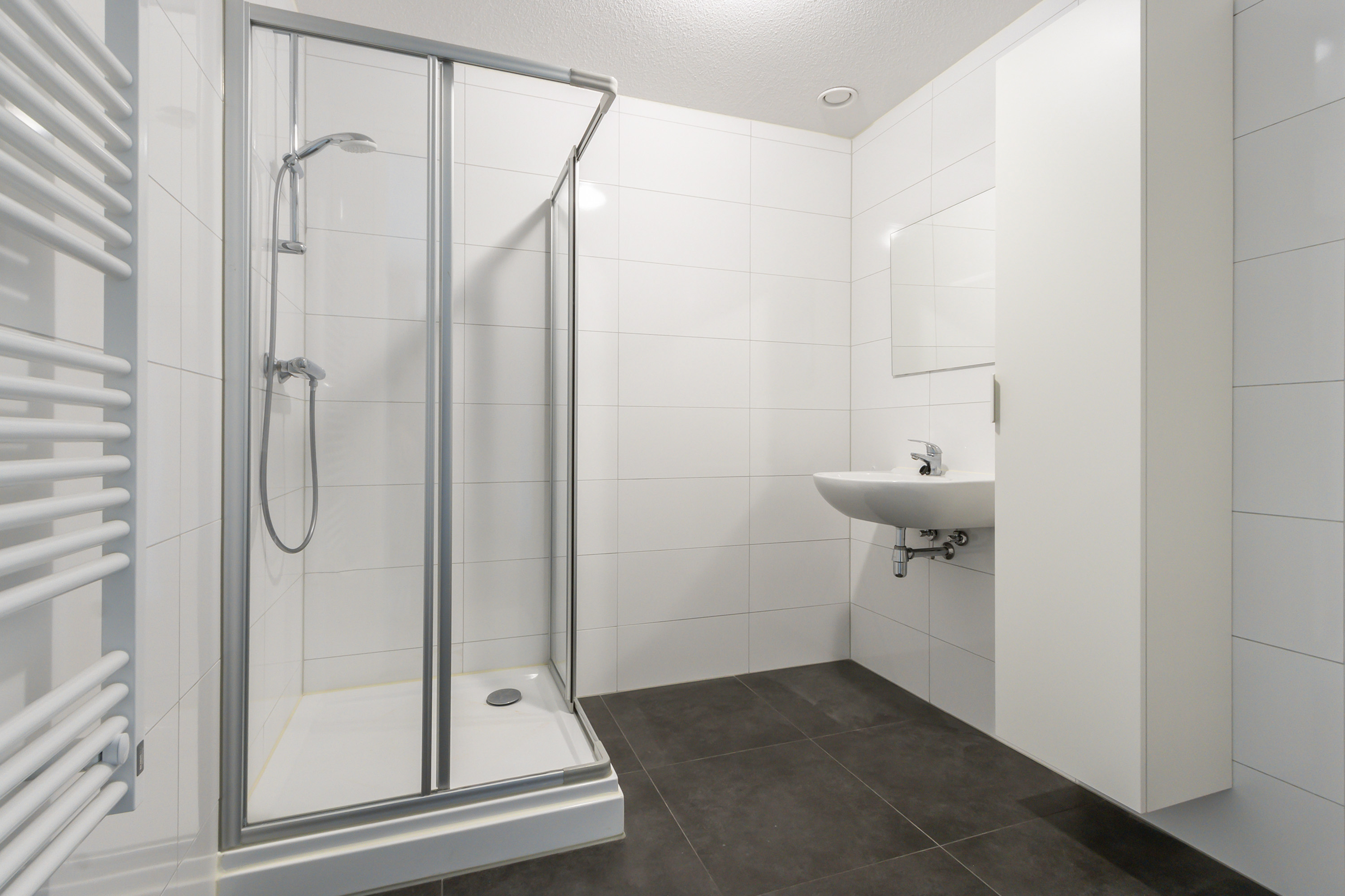- Moderne inpandige badkamer met geheel betegelde wanden (wit), plavuizen vloer (antraciet), wit sanitair, een wastafel met spiegel, een douchecabine en een designradiator.