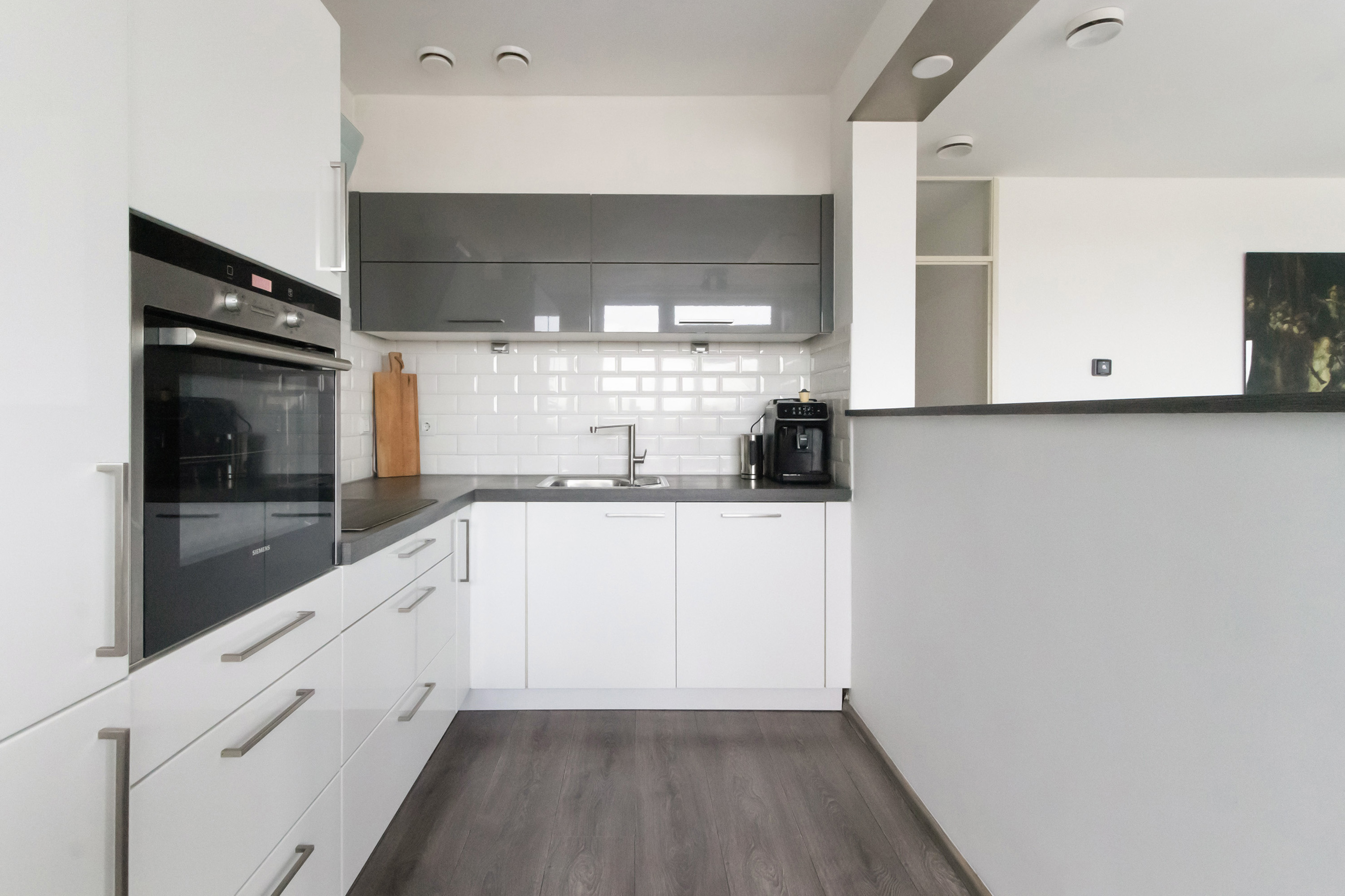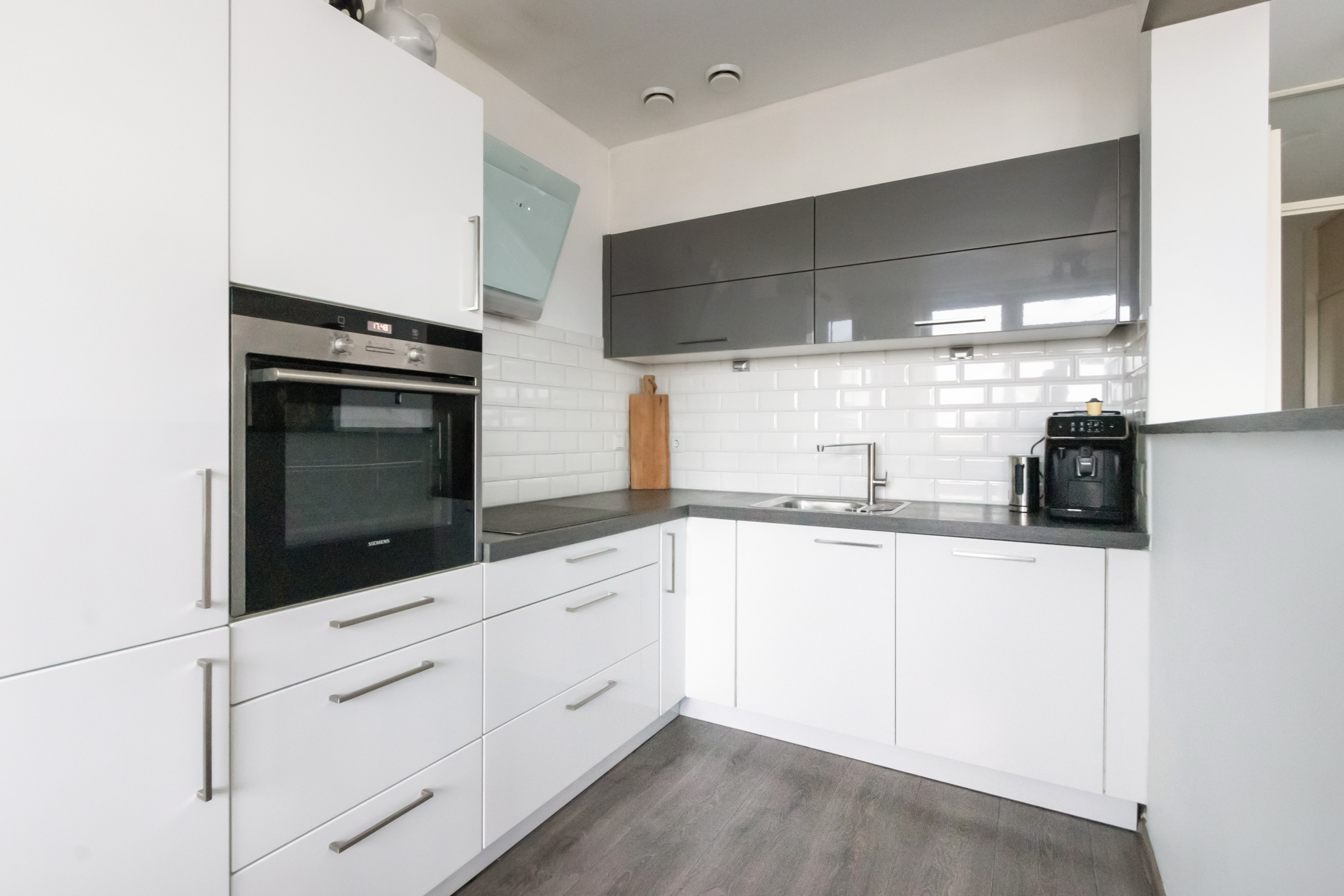 - Open keuken in L-opstelling, uitgevoerd in hoogglans wit, met betegelde achterwand, onder- en bovenkasten, lades en een praktische carrouselkast. Voorzien van een RVS spoelbak met kraan. Inbouwapparatuur van Siemens: koel-vriescombinatie, oven, 4-zone inductiekookplaat en afzuigkap. Daarnaast een vaatwasser van Bosch.